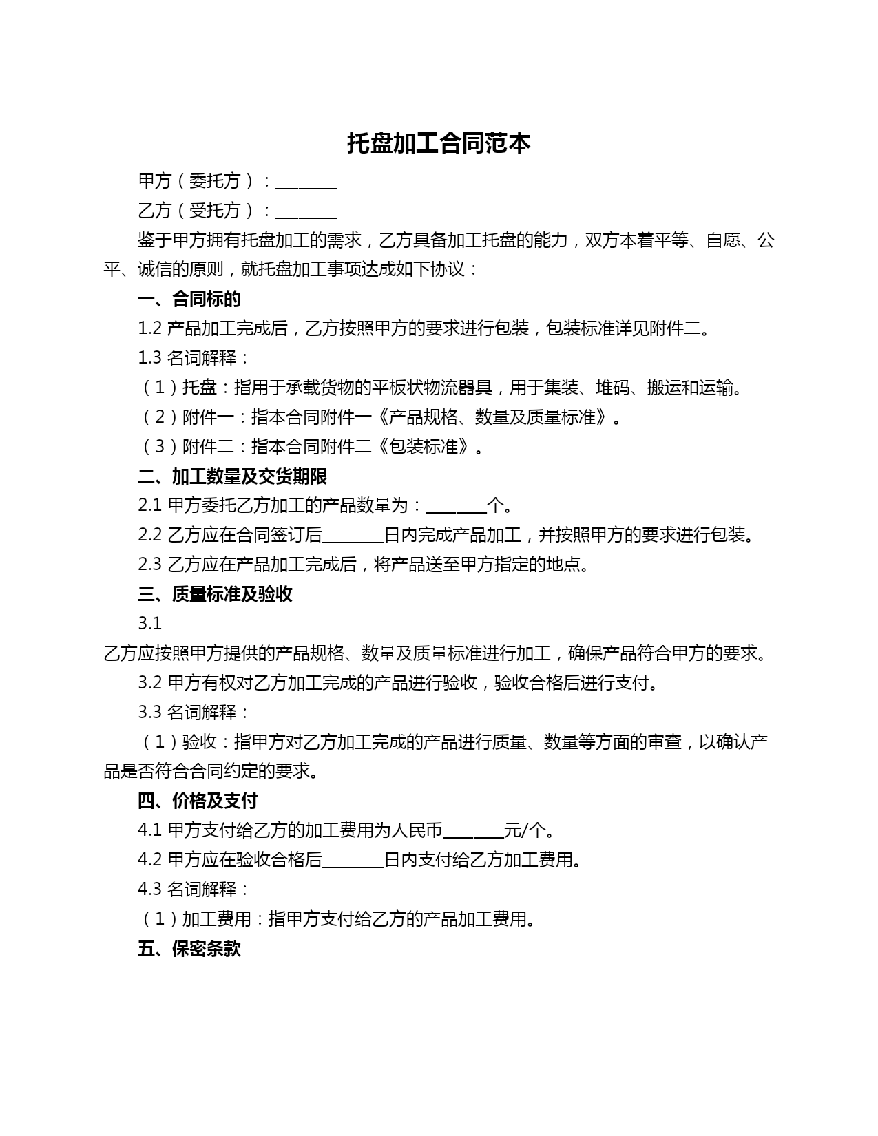 托盘加工合同范本甲方(委托方):________乙方(受托方):________鉴于甲方拥有托盘加工的需求,乙方具备加工托盘的能力,双方本着平等、自愿、公平、诚信的原则,就托盘加工事项达成如下协议:一、合同标的1.2产品加工完成后,乙方按照甲方的要求进行包装,包装标准详见附件二。1.3名词解释:(1)托盘:指用于承载货物的平板状物流器具,用于集装、堆码、搬运和运输。(2)附件一:指本合同附件一《产品规格、数量及质量标准》。(3)附件二:指本合同附件二《包装标准》。二、加工数量及交货期限2.1甲方委托乙方加