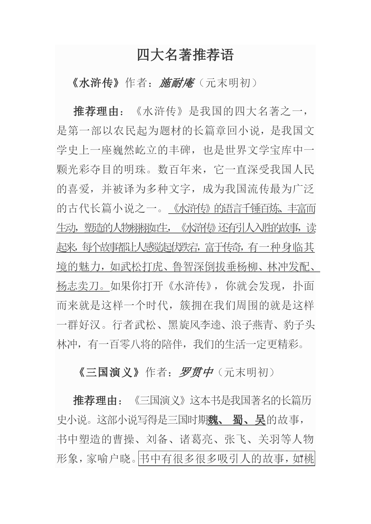 四大名著推荐语《水浒传》作者:施耐庵(元末明初)推荐理由:《水浒传》是我国的四大名著之一,是第一部以农民起为题材的长篇章回小说,是我国文学史上一座巍然屹立的丰碑,也是世界文学宝库中一颗光彩夺目的明珠。数百年来,它一直深受我国人民的喜爱,并被译为多种文字,成为我国流传最为广泛的古代长篇小说之一。《水浒传》的语言千锤百炼、丰富而生动,塑造的人物栩栩如生,《水浒传》还有引人入胜的故事,读起来,每个故事都让人感觉起伏跌宕,富于传奇,有一种身临其境的魅力,如武松打虎、鲁智深倒拔垂杨柳、林冲发配、杨志卖刀。如果你打开