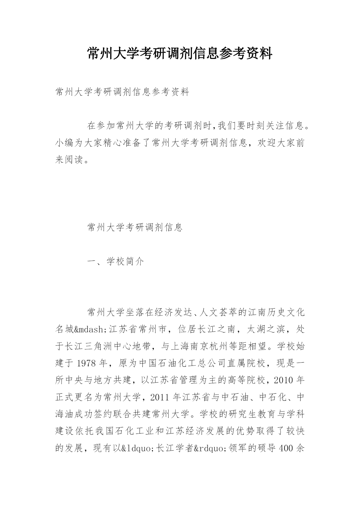 常州大学考研调剂信息参考资料常州大学考研调剂信息参考资料在参加常州大学的考研调剂时,我们要时刻关注信息。小编为大家精心准备了常州大学考研调剂信息,欢迎大家前来阅读。常州大学考研调剂信息一、学校简介常州大学坐落在经济发达、人文荟萃的江南历史文化名城—江苏省常州市,位居长江之南,太湖之滨,处于长江三角洲中心地带,与上海南京杭州等距相望。学校始建于1978年,原为中国石油化工总公司直属院校,现是一所中央与地方共建,以江苏省管理为主的高等院校,2010年正式更名为常州大学,2011年江苏省与中石油、中
