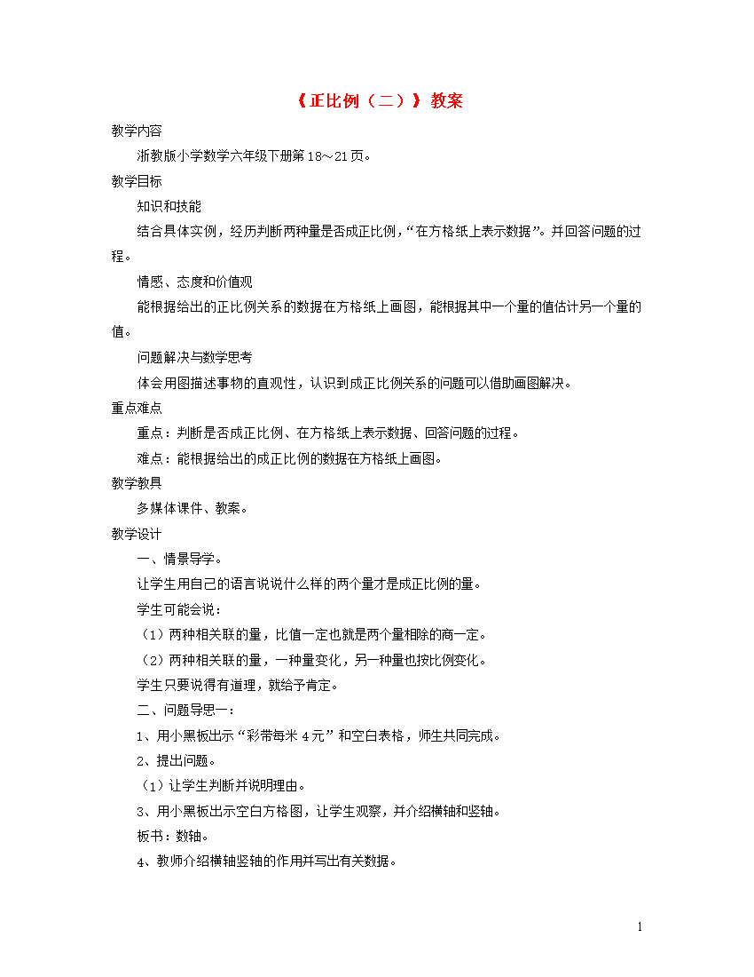 1《正比例(二)》教案教学内容浙教版小学数学六年级下册第18〜21页。教学目标知识和技能结合具体实例,经历判断两种量是否成正比例,“在方格纸上表示数据”。并回答问题的过程。情感、态度和价值观能根据给出的正比例关系的数据在方格纸上画图,能根据其中一个量的值估计另一个量的值。问题解决与数学思考体会用图描述事物的直观性,认识到成正比例关系的问题可以借助画图解决。重点难点重点:判断是否成正比例、在方格纸上表示数据、回答问题的过程。难点:能根据给出的成正比例的数据在方格纸上画图。