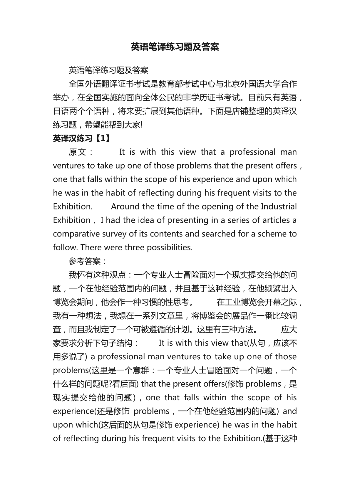 英语笔译练习题及答案英语笔译练习题及答案全国外语翻译证书考试是教育部考试中心与北京外国语大学合作举办,在全国实施的面向全体公民的非学历证书考试。目前只有英语,日语两个个语种,将来要扩展到其他语种。下面是店铺整理的英译汉练习题,希望能帮到大家!英译汉练习【1】原文:Itiswiththisviewthataprofessionalmanventurestotakeuponeofthoseproblemsthatthepresentoffers,onethatfallswithinthescopeofhise