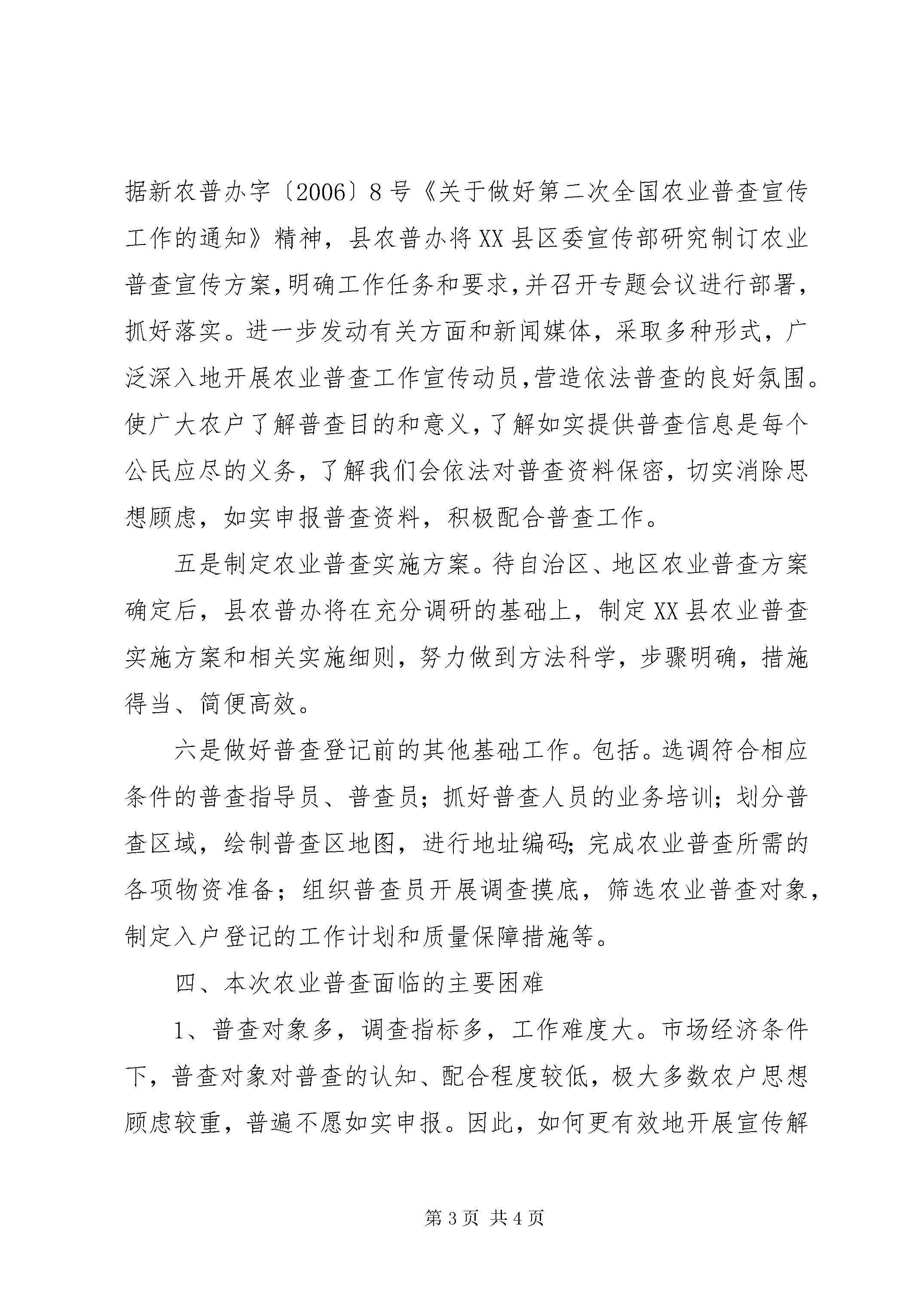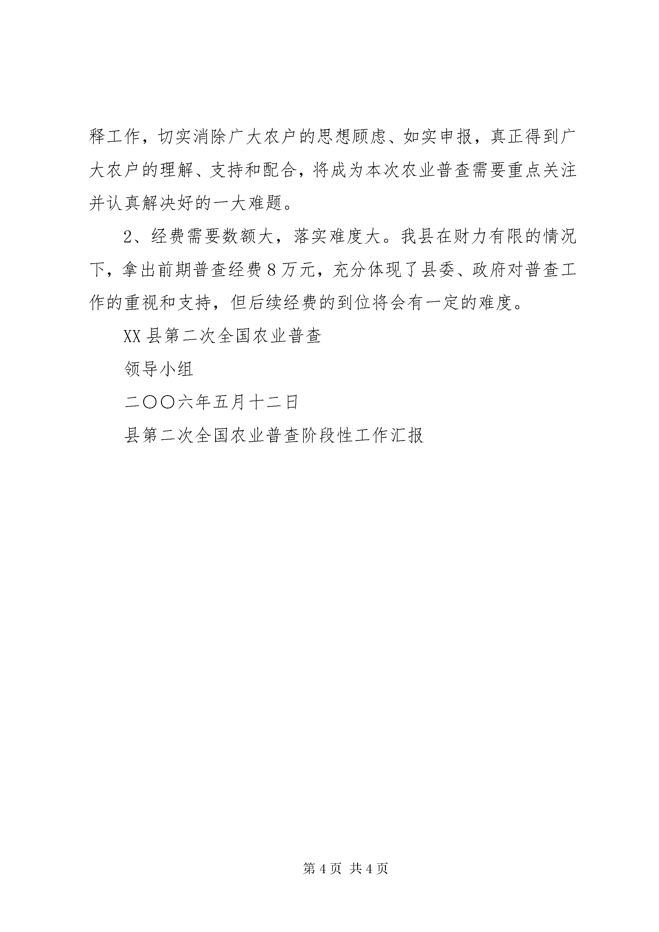 **县第二次全国农业普查阶段性工作汇报各位领导:大家好。根据自治区、地区下发的开展第二次农业普查一系列文件精神我县狠抓落实农业普查前期各项准备工作稳步推进。下面我就XX县全国第二次农业普查工作开展情况简要汇报如下:一、建立健全县乡普查组织机构根据阿行署发〔2005〕103号《关于开展第二次全国农业普查的通知》文件精神为保证普查工作的顺利开展我县于2005年12月21日以新和政办〔2005〕92号文件正式下发了《关于开展第二次全国农业普查的通知》对我县第二