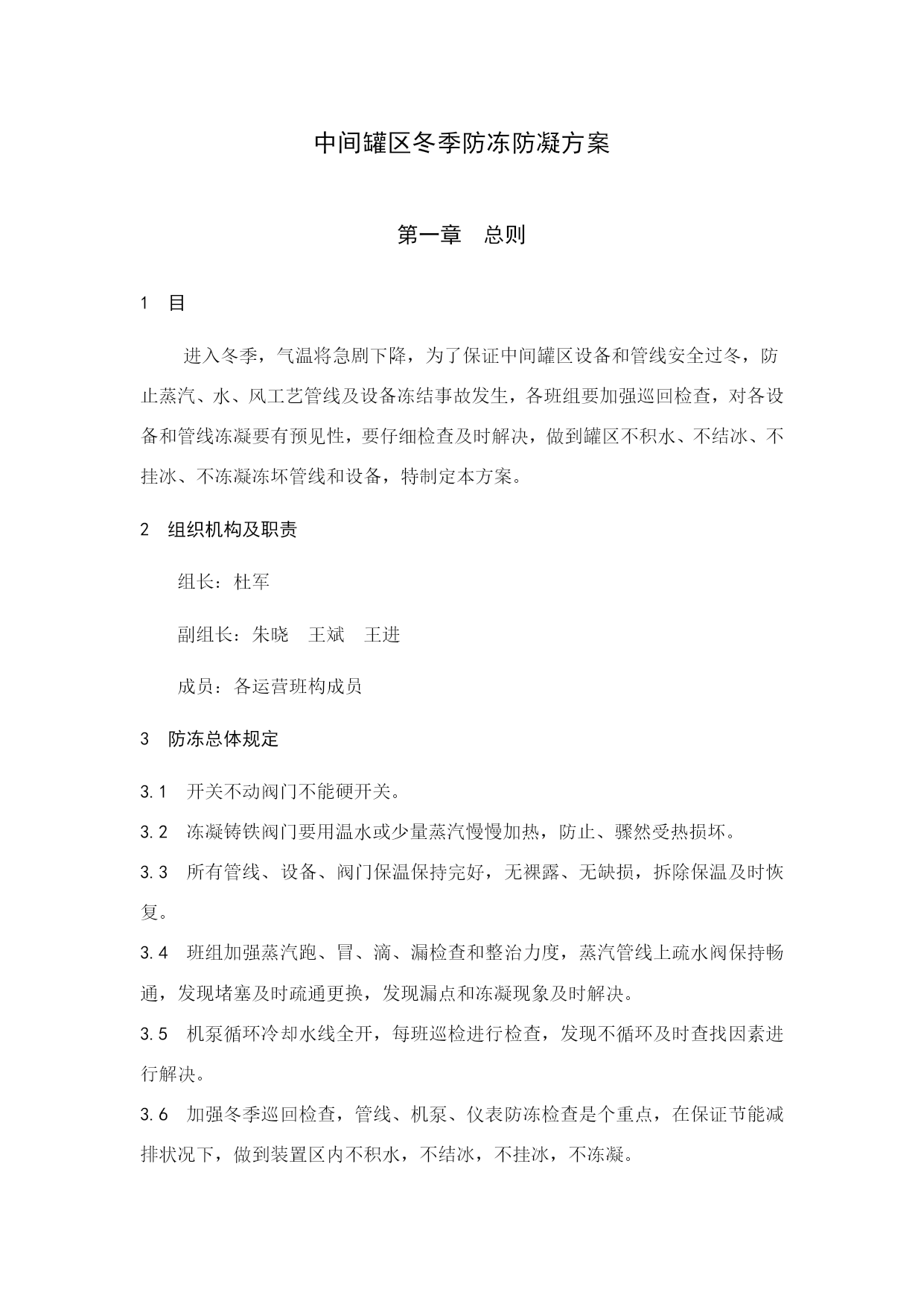 陕西延长中煤榆林能源化工有限公司烯烃中心中间罐区装置防冻防凝方案9月11日发布9月11日起实行陕西延长中煤榆林能源化工有限公司发布陕西延长中煤榆林能源化工有限公司烯烃中心中间罐区装置防冻防凝方案版本修订状态编制审核批准A0主编部门:烯烃中心中间罐区发布日期:月日原则名称:中间罐区装置防冻防凝方案目录TOC\o"1-3"\h\z\uHYPERLINK\l"_Toc"第一章总则PAGEREF_Toc\h3HYPERLINK\l"_Toc"1目PAGEREF_Toc\h3HYPER