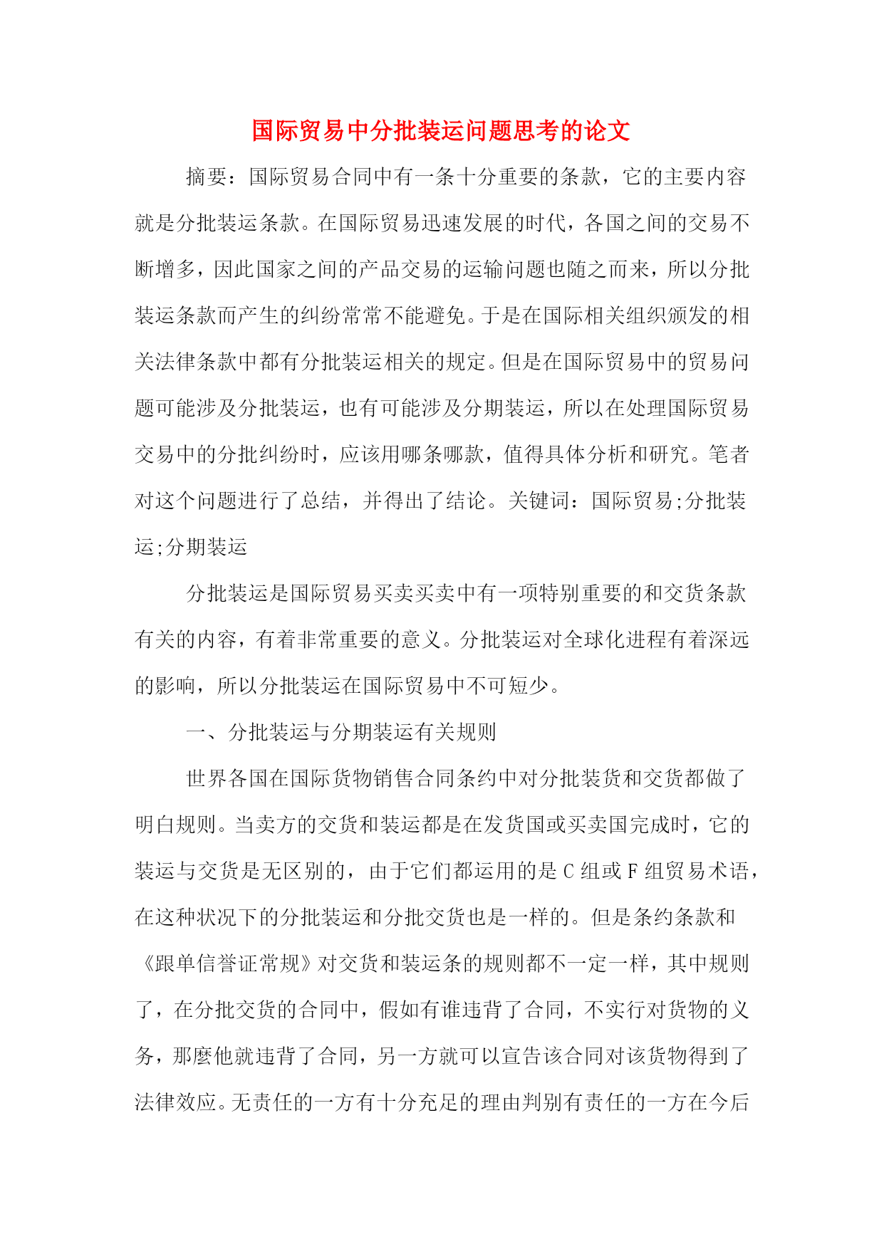国际贸易中分批装运问题思考国际贸易中分批装运问题思考国际贸易合同中有一条十分重要的条款,它的主要内容就是分批装运条款。在国际贸易迅速发展的时代,各国之间的交易不断增多,因此国家之间的产品交易的运输问题也随之而来,所以分批装运条款而产生的纠纷常常不能避免。下面是小编搜集整理的国际贸易中分批装运问题思考的论文范文,欢迎大家阅读参考。摘要:国际贸易合同中有一条十分重要的条款,它的主要内容就是分批装运条款。在国际贸易迅速发展的时代,各国之间的交易不断增多,因此国家之间的产品交易的运输问题也随之而来,所以分批装运条
