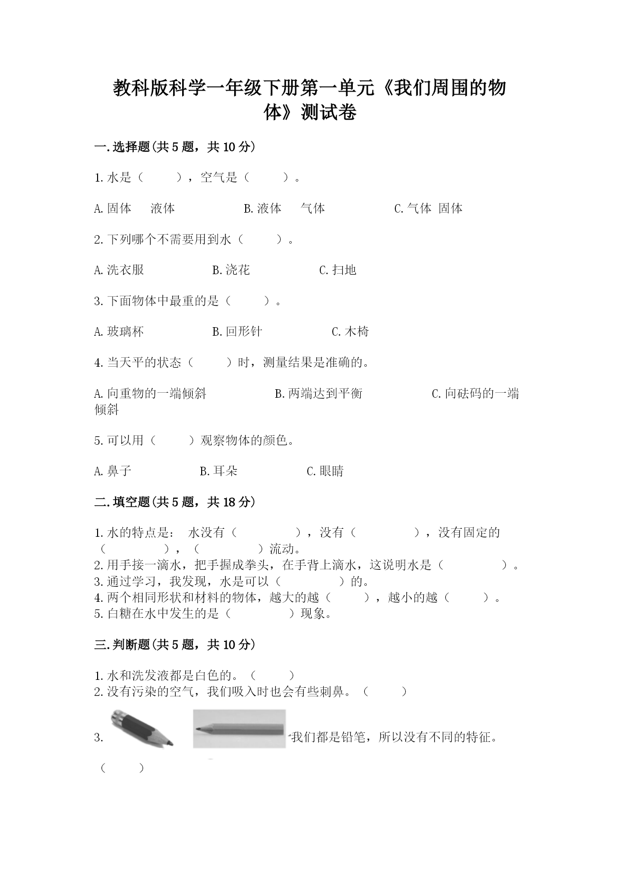 教科版科学一年级下册第一单元《我们周围的物体》测试卷一.选择题(共5题,共10分)1.水是(),空气是()。A.固体液体B.液体气体C.气体固体2.下列哪个不需要用到水()。A.洗衣服B.浇花C.扫地3.下面物体中最重的是()。A.玻璃杯B.回形针C.木椅4.当天平的状态()时,测量结果是准确的。A.向重物的一端倾斜B.两端达到平衡C.向砝码的一端倾斜5.可以用()观察物体的颜色。A.鼻子B.耳朵C.眼睛二.填空题(共5题,共18分)1.水的特点是:水没有(),没有(),没有固定的(),()流动。2.用手