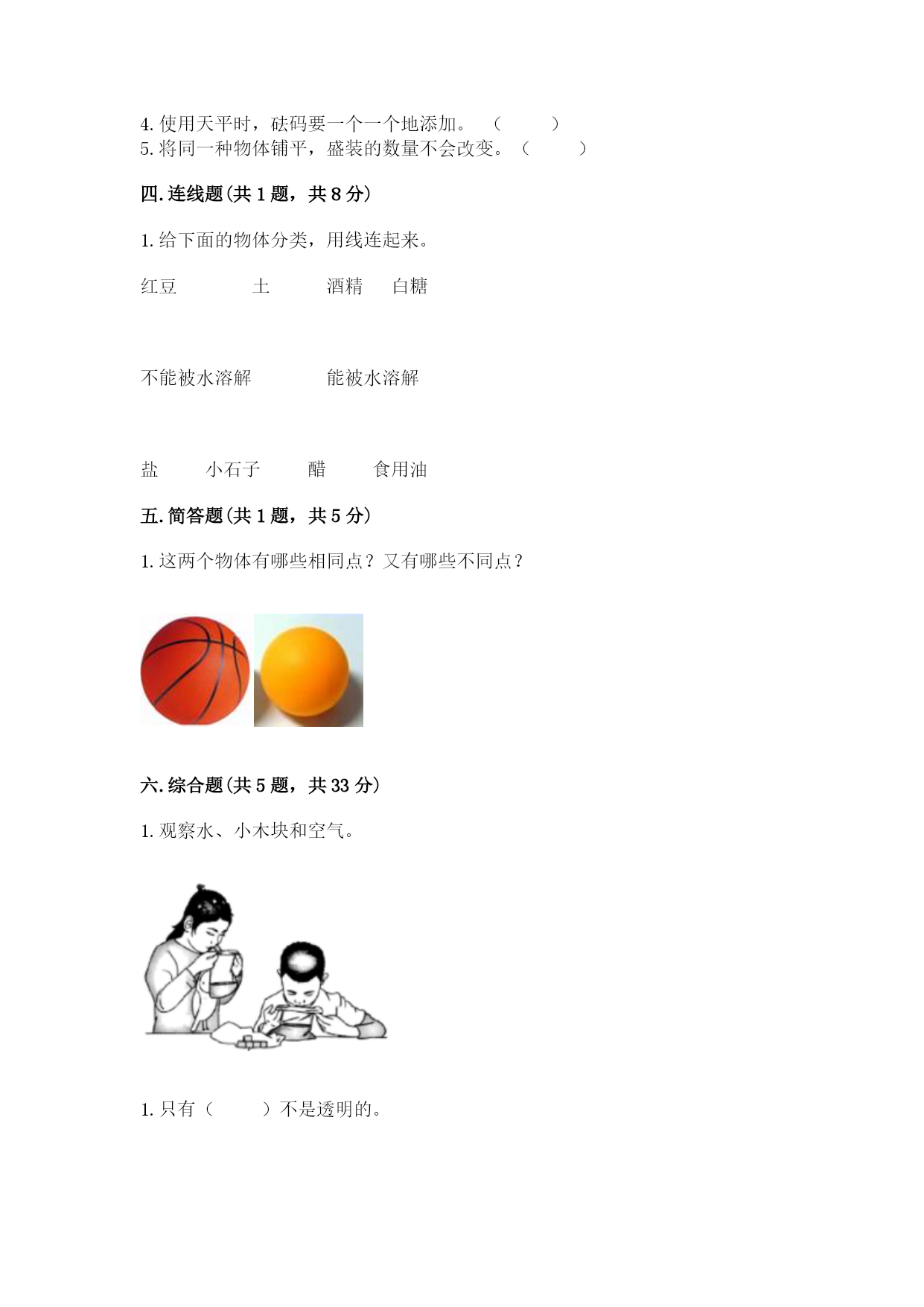 教科版科学一年级下册第一单元《我们周围的物体》测试卷一.选择题(共6题,共12分)1.当天平的状态如图()时,测量结果是准确的。A.B.C.2.通过观察,我们发现水是()。A.透明的B.有颜色的C.不会流动的3.下面的物体能溶解在水里的是()。A.盐B.螺母C.小石子4.下列选项中,没有固定形状的是()。A.洗发液B.木头C.玉米5.闻不明物体的正确方法是()。A.凑近闻B.用手轻轻将气味扇到鼻子跟前6.水是(),空气是()。A.固体液体B.液体气体C.气体固体二.填空题(共6题,共26分)1.为了发现物