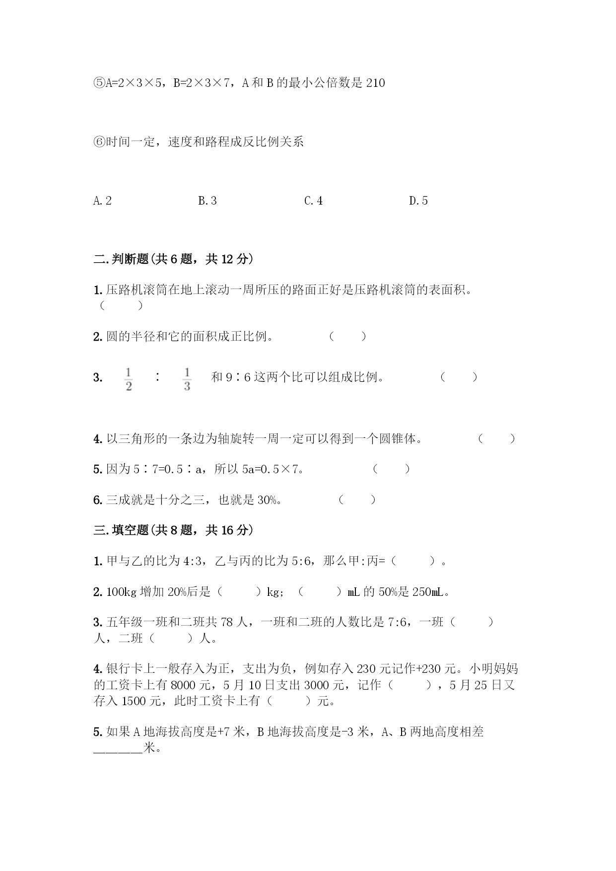 小升初数学六年级下册期末测试卷一.选择题(共6题,共12分)1.把一根长1米,底面积为3.14平方米的圆柱锯成两个小圆柱,它的表面积()。A.增加3.14平方米B.减少3.14平方米C.增加6.28平方米D.减少6.28平方米2.低于正常水位0.16米记为-0.16,高于正常水位0.02米记作()。A.+0.02B.-0.02C.+0.183.(1)分针的转速是时针转速的60倍。(2)用0、1、2、3这四个数字能组成18个不同的四位数。(3)一个三条边的长度都是整厘米的三角形,其中两条边长度是3厘米和5厘