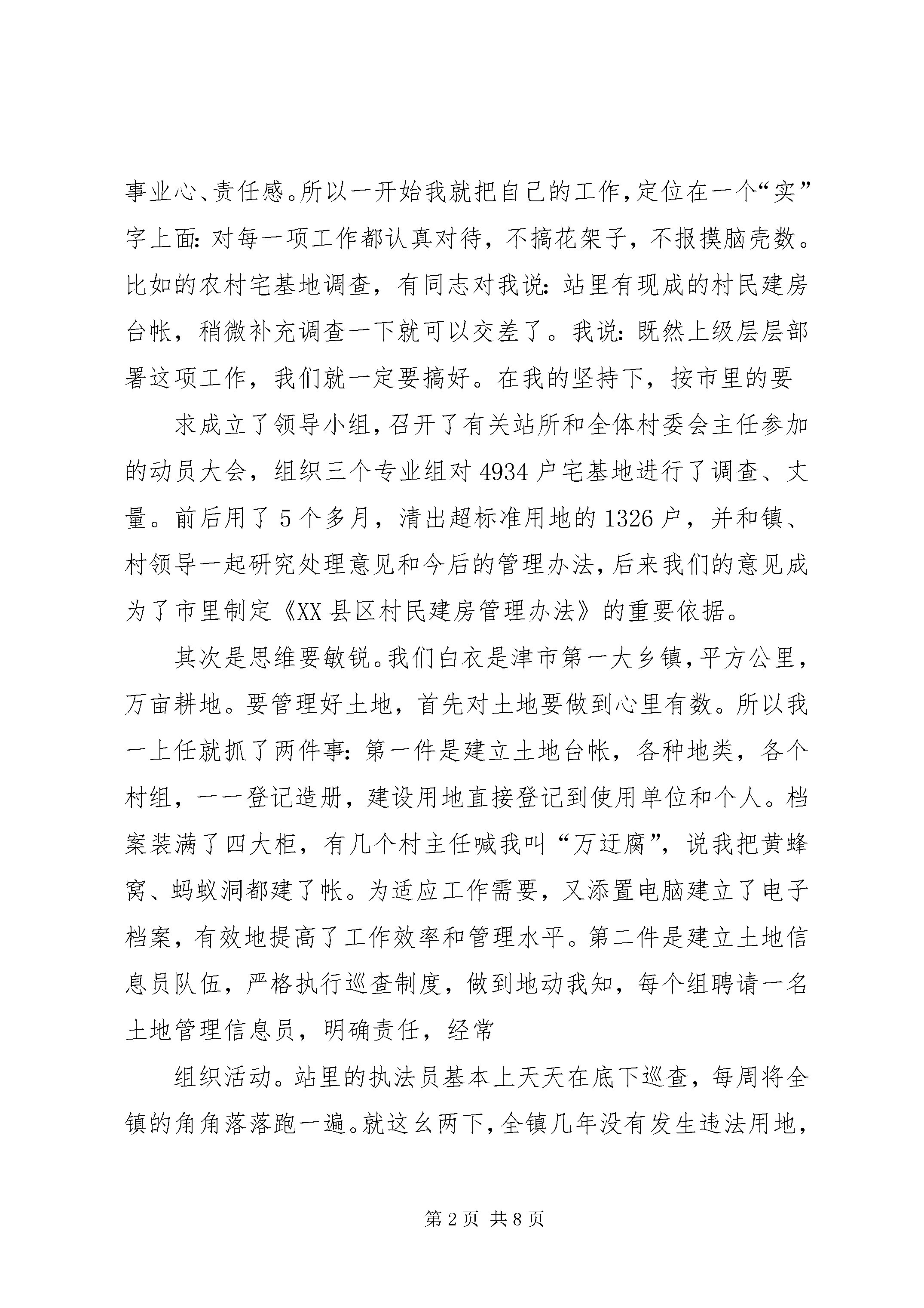 第PAGE\*Arabic\*MERGEFORMAT8页共NUMPAGES\*MERGEFORMAT8页国土战线老干部思想和工作汇报国土战线老干部思想和工作汇报老牛悉知光阴短,不用扬鞭自奋蹄尊敬的各位领导,各位同行:我叫万朝新,今年五十二岁,中共党员,是1987年进入国土战线的一个老兵,现任XX县区白衣镇国土管理站站长。这幺多年来,尤其是任站长以来,我珍惜有限的时光落实“守土”的责任,贴心为基层群众服务,并注意带队及培养年轻人,受到了普遍称赞。几年来,我们站年年被评为先进单位,去年2月还受到了