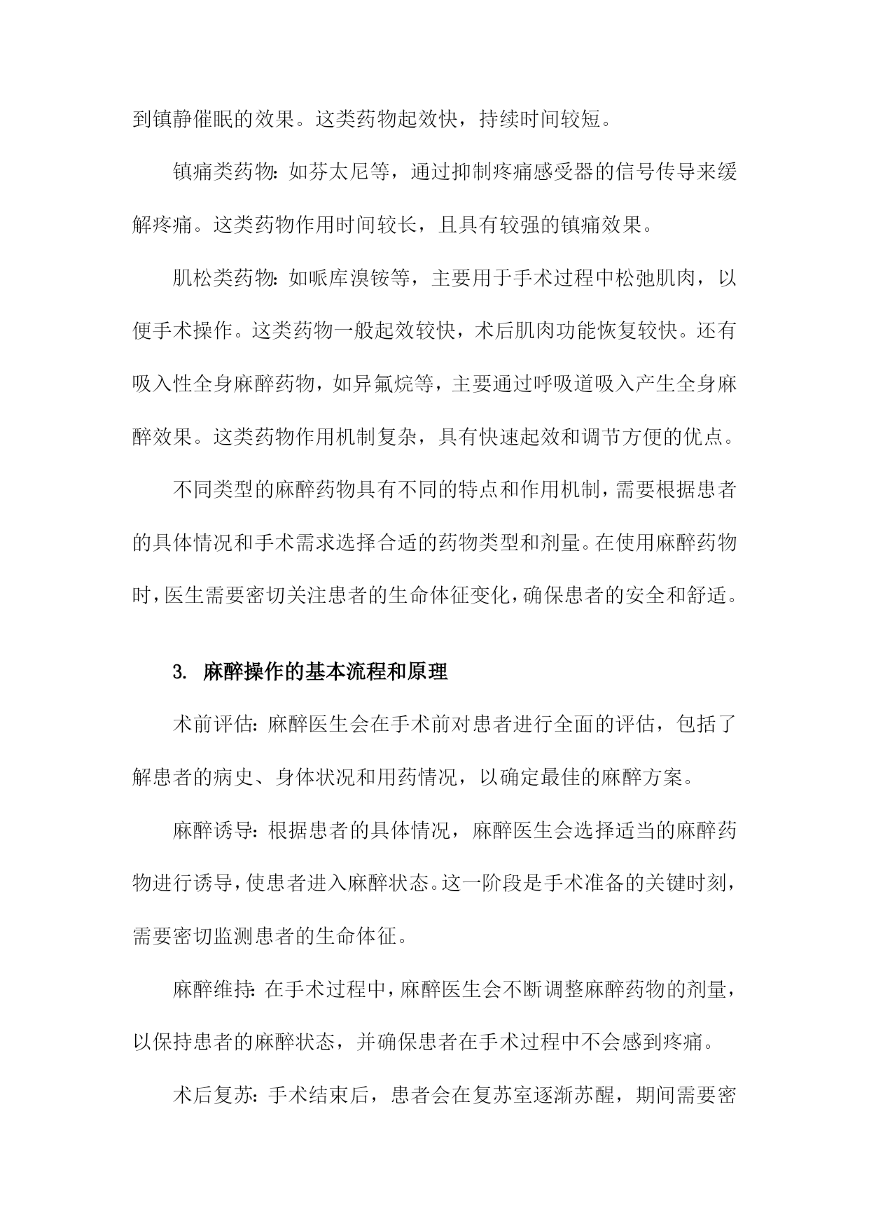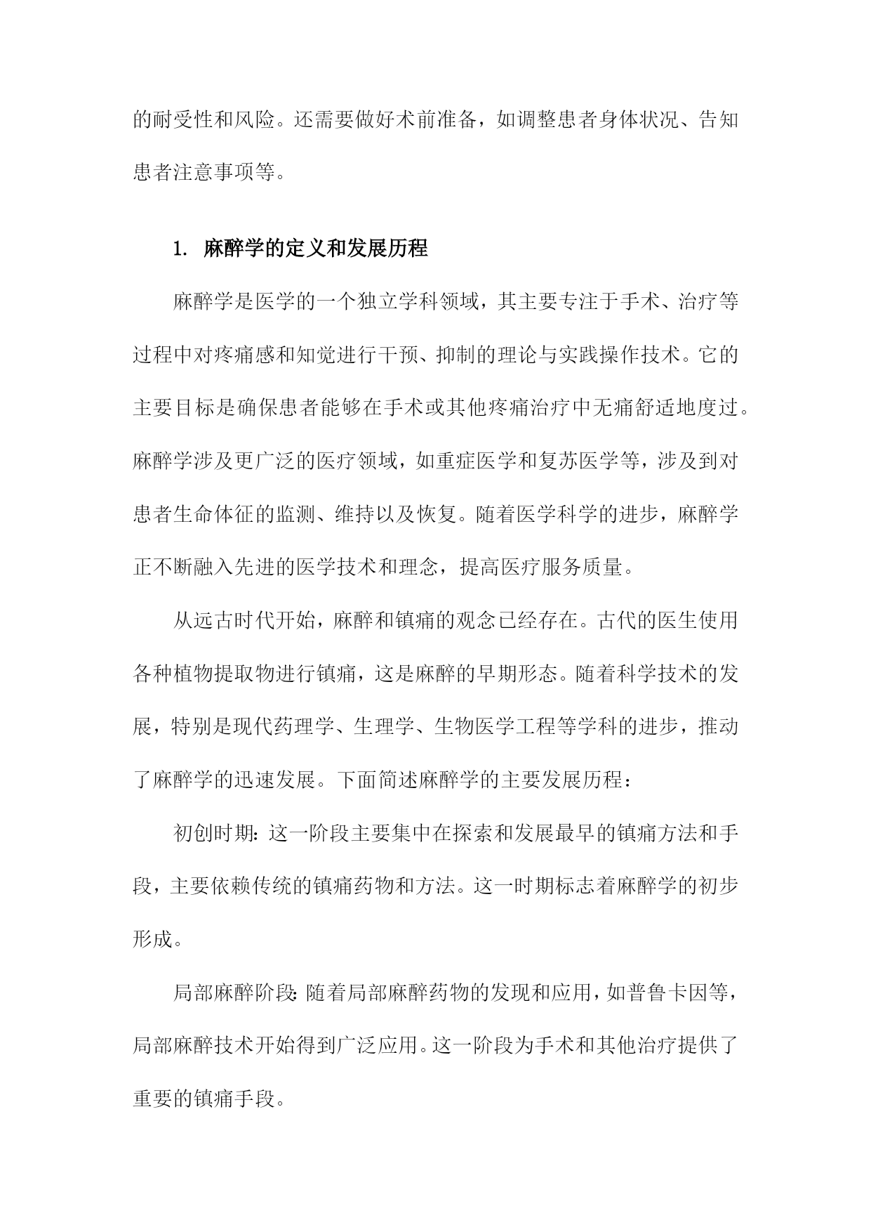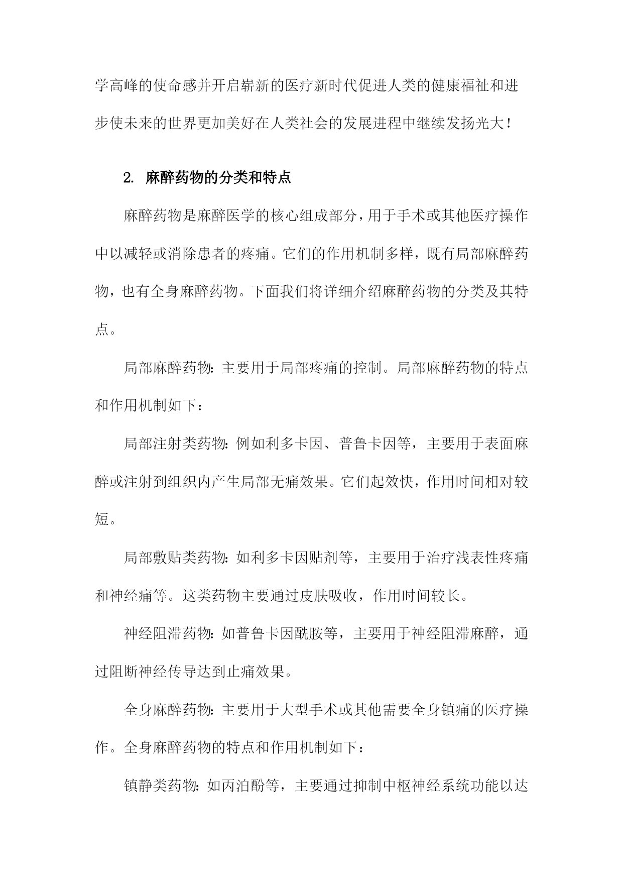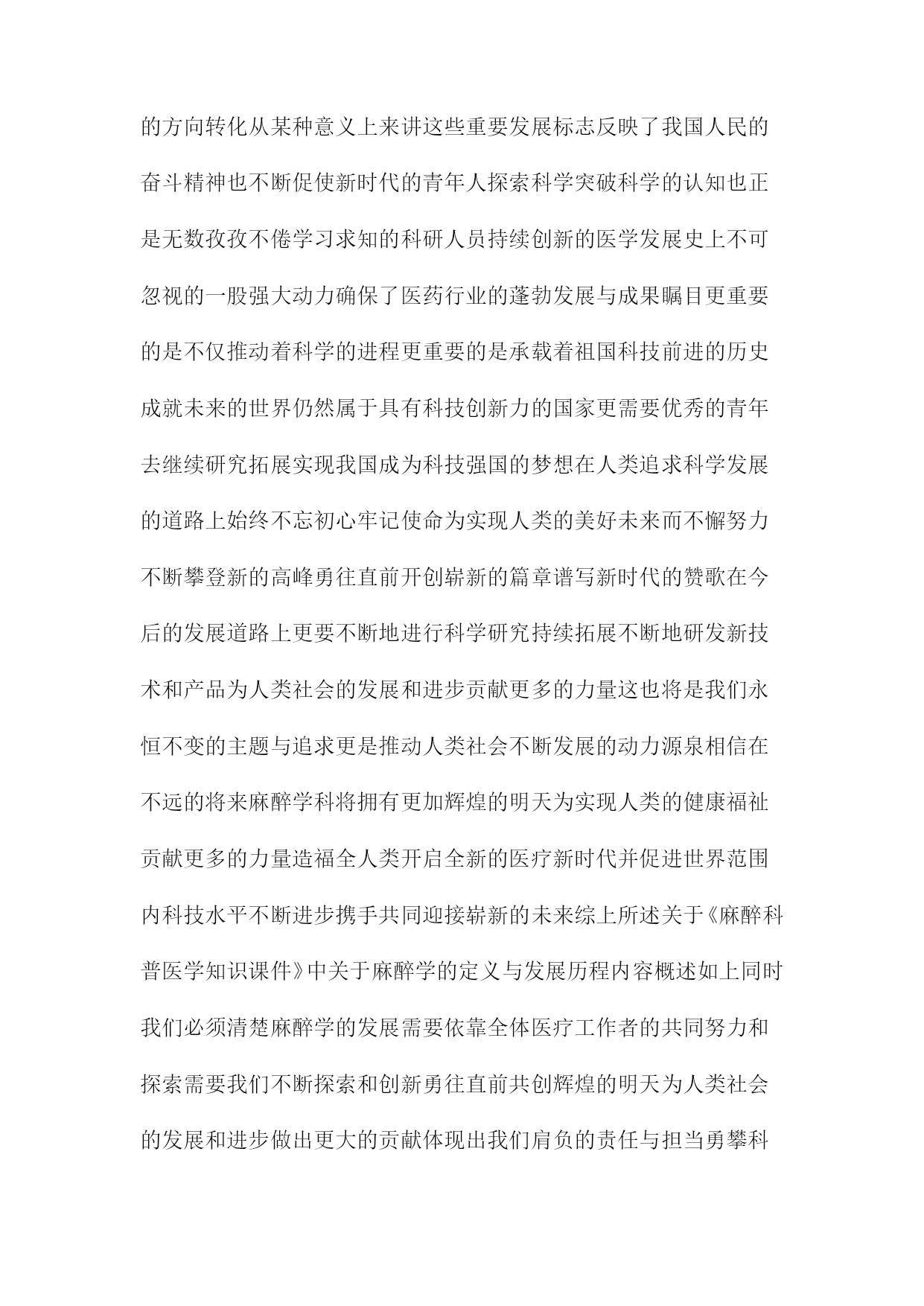 麻醉科普医学知识课件一、概览随着医学技术的不断进步,麻醉学作为医学领域的重要分支,其知识普及和应用日益广泛。本次《麻醉科普医学知识课件》旨在向广大公众普及麻醉相关知识,帮助大家全面了解麻醉的基本概念、种类、作用及注意事项。让我们一探究竟。我们来了解一下麻醉的基本概念。麻醉是指通过药物或其他方式,使机体对疼痛刺激的反应减弱或消失,从而达到减轻或消除疼痛的目的。在现代医学中,麻醉广泛应用于手术、诊疗操作以及疼痛治疗中,为病人提供安全舒适的医疗环境。我们将详细介绍麻醉的种类。根据作用时间和用途的不同,麻醉可分为