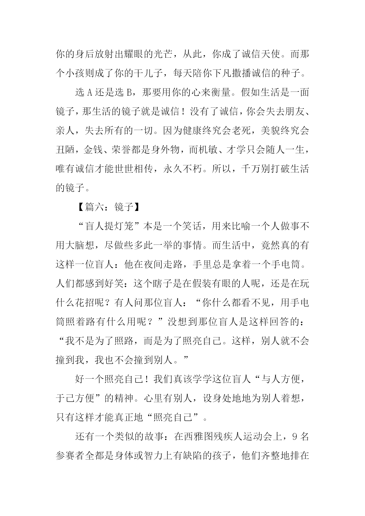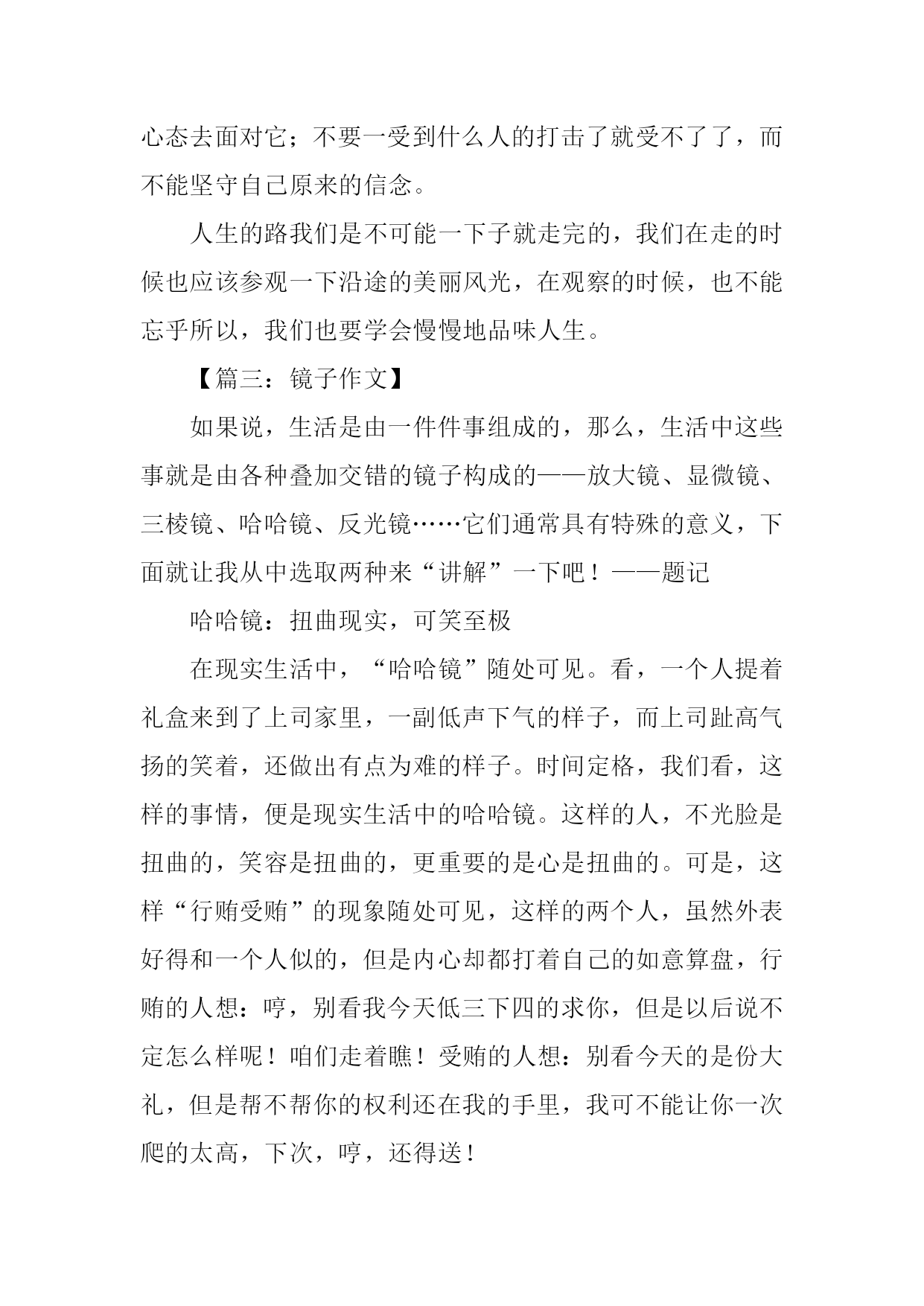 关于镜子的作文关于镜子的作文在日常学习、工作抑或是生活中,大家一定都接触过作文吧,根据写作命题的特点,作文可以分为命题作文和非命题作文。那么一般作文是怎么写的呢?以下是小编为大家收集的关于镜子的作文,供大家参考借鉴,希望可以帮助到有需要的朋友。关于镜子的作文1或许,很多人都还以为“镜子”只是一块不起眼的玻璃,如果是这样,就大错特错了!在这世界上,我们可以从朋友和任何一件美好的事物中,来反射出自己的优缺点,就如同一面镜子般。“人”,可能是世界上最特殊的镜子。假如你做好事,脸上一定反射出欢喜的笑容;假如你做坏