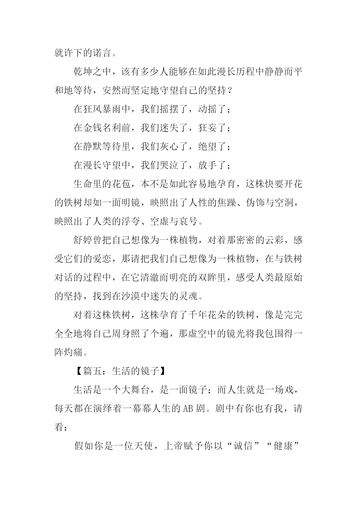 关于镜子的作文【篇一:书是一面镜子】阳光明媚的午后,独自一人在阳台上看书,泡上一杯香茗,静静地品味着书中的悲欢离合、酸甜苦辣。唐代皇帝曾以人为镜,而我则是以书为镜。这面镜子伴随着我走过春夏秋冬,引领我走出困境,照出我的内心世界。书是一面镜子,是一面教我如何生活的镜子。读《论语》让我明白了“三人行,必有我师焉”的道理,从此我总是能够虚心向人学习,从而取得了不断的进步;读《爱的教育》让我懂得应真心待人,从此我学会了把关爱送给身边的人;读《儒林外史》让我懂得了功名利禄乃身外之物,从此我不再和他人盲目攀比。我无法