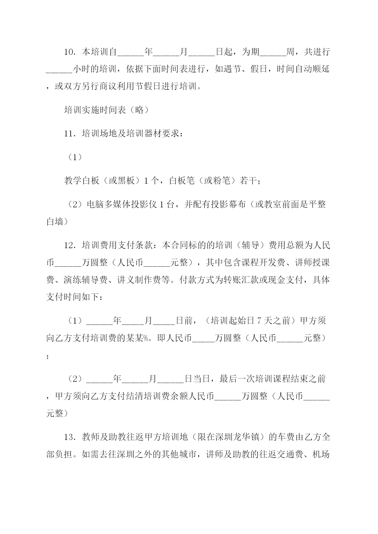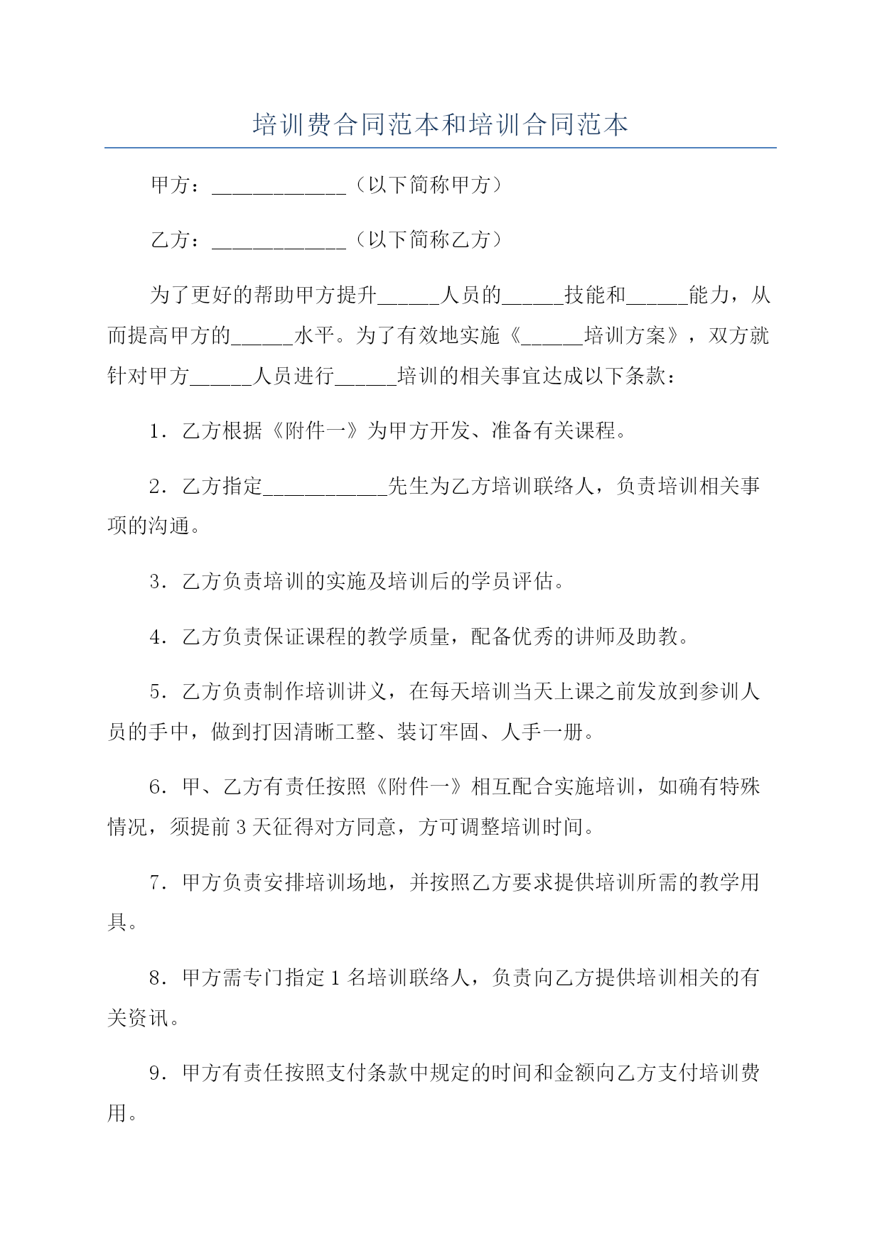 培训费合同范本和培训合同范本甲方:_____________(以下简称甲方)乙方:_____________(以下简称乙方)为了更好的帮助甲方提升______人员的______技能和______能力,从而提高甲方的______水平。为了有效地实施《______培训方案》,双方就针对甲方______人员进行______培训的相关事宜达成以下条款:1.乙方根据《附件一》为甲方开发、准备有关课程。2.乙方指定____________先生为乙方培训联络人,负责培训相关事项的沟通。3.乙方负责培训的实施及培训后的学