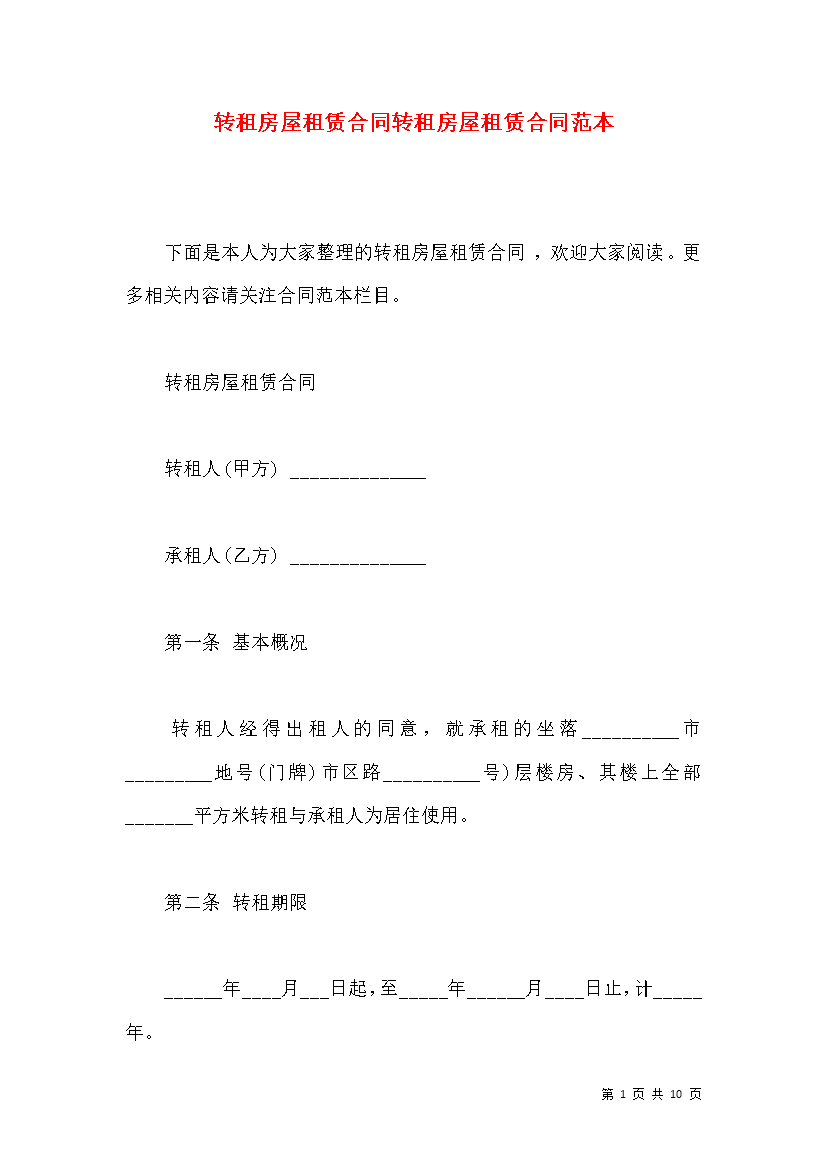 转租房屋租赁合同转租房屋租赁合同范本下面是本人为大家整理的转租房屋租赁合同欢迎大家阅读。更多相关内容请关注合同范本栏目。转租房屋租赁合同转租人(甲方)______________承租人(乙方)______________第一条基本概况转租人经得出租人的同意就承租的坐落__________市_________地号(门牌)市区路__________号)层楼房、其楼上全部_______平方米转租与承租人为居住使用。第二条转租期限______年__