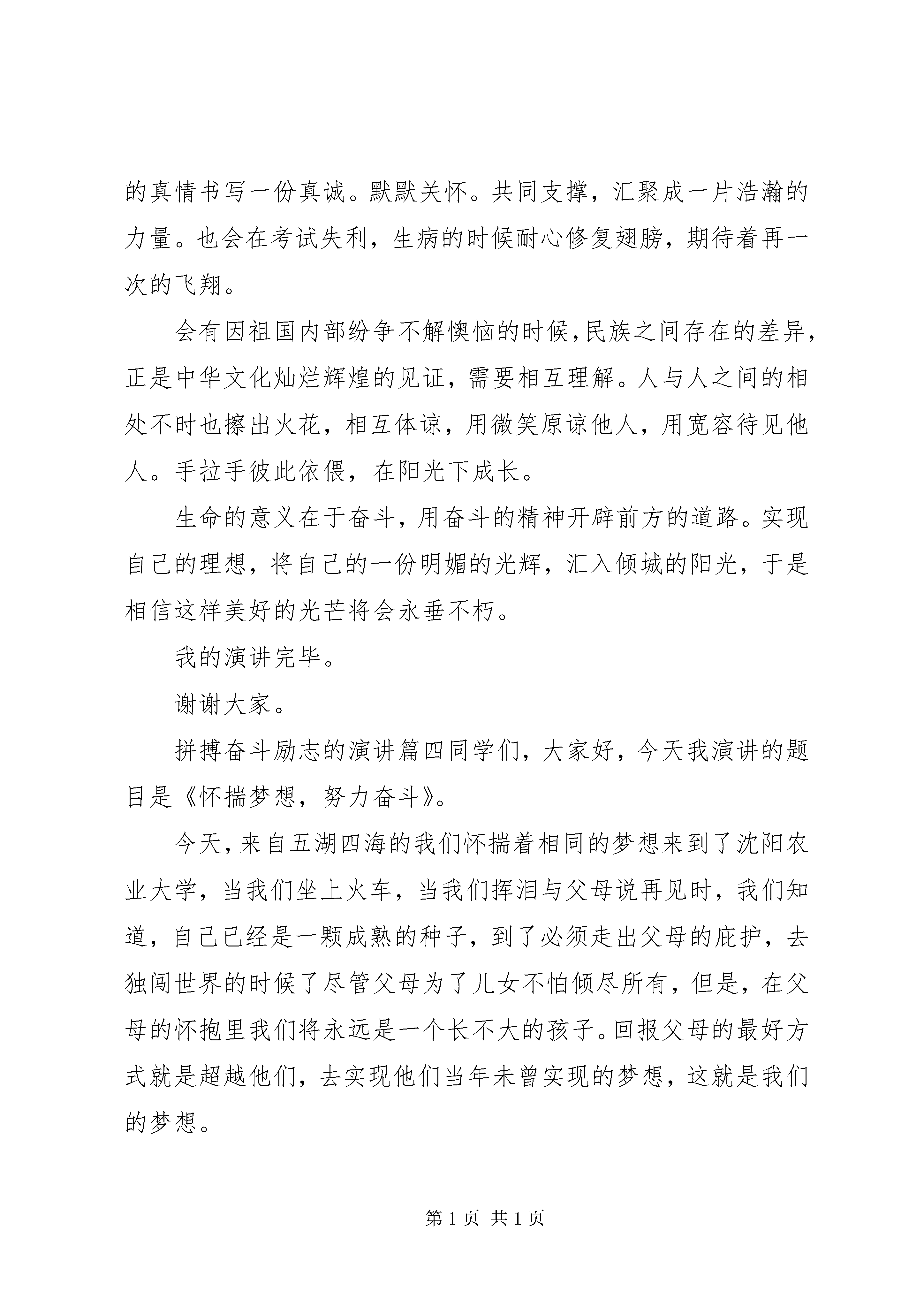 关于拼搏奋斗的演讲稿关于拼搏奋斗的演讲稿篇1每个人都有自己的理想,所不同的是理想的大小、远近和种类,如有的人想当科学家,有的人想当文学家等等。有了理想,如何实现呢?概而言之,就是要靠奋斗来实现,靠不懈的努力和艰辛的劳动来实现。为了实现理想,当强敌压境、国家民族危在旦夕时,有多少人挺身而出,为捍卫祖国的领土主权而战。民族英雄岳飞带领岳家军奋勇抗金;张、杨二位将军不顾个人安危,逼蒋抗日。敌人被赶走了,民族得到了生存和发展。当统治者昏庸腐朽,横征暴敛,人民无法生活下去时,有奋少人揭竿而起,反抗强权,救民于水火之