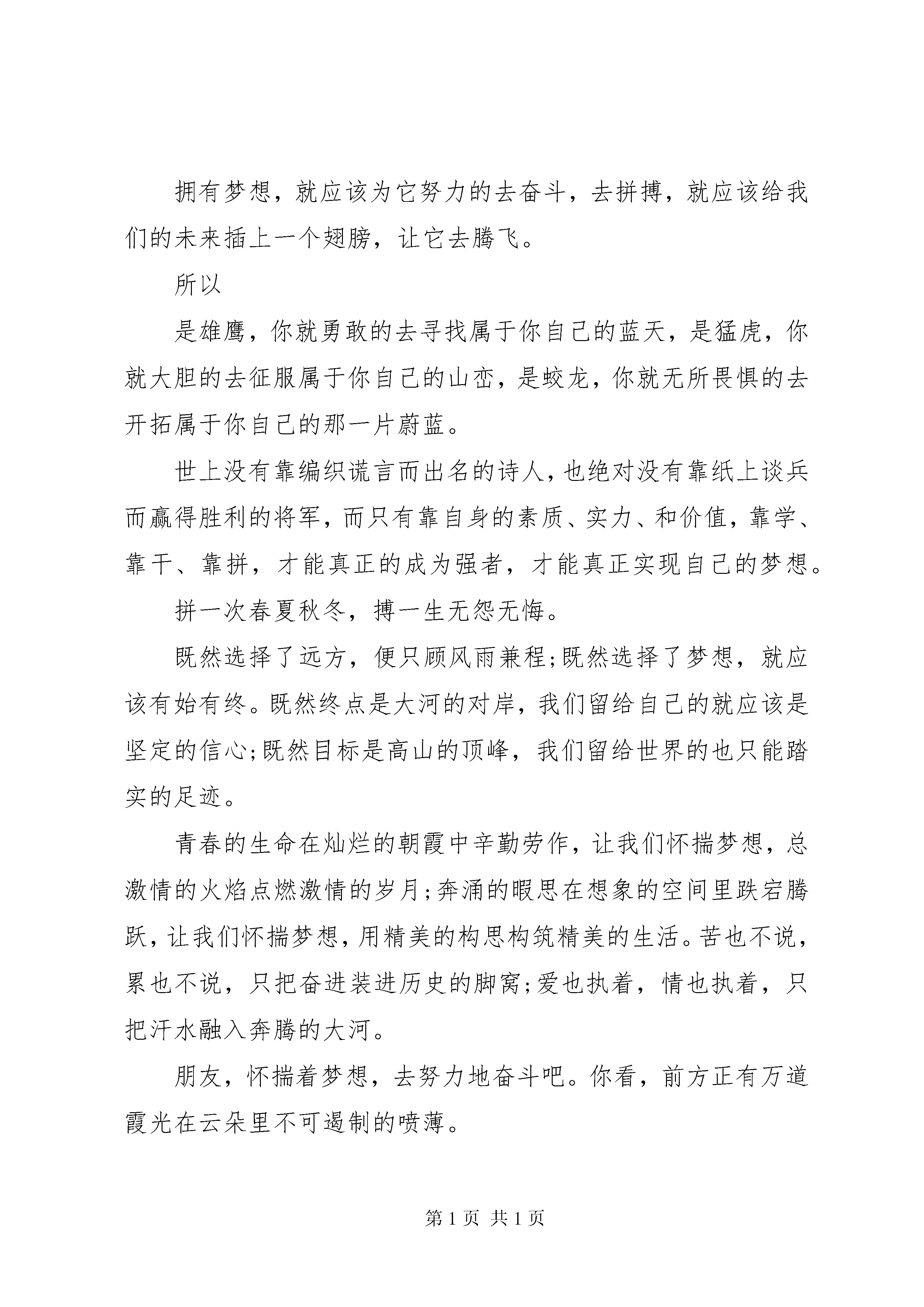 关于奋斗拼搏演讲稿关于奋斗拼搏演讲稿1大家下午好,很高兴看到你们。首先我做一下自我介绍,我叫某某,来自某某某。我今天演讲的题目是“刻苦努力才是成功之路”,希望你们喜欢。首先我希望问大家一个问题:“怎样才能成功呢?”。是的,你必须刻苦努力才能成功。我们都知道,在任何一个领域,能攀上事业高峰的人未必都是天赋过人的人,而是努力并且倍加努力的人。当然,要使刻录努力真正得到回报,你必须提高工作效率。现说明如下:第一,就是树立目标。你必须有努力的方向,尽早的树立目标,接着全力以付去实现。第二,就是合理安排时间。艰难的