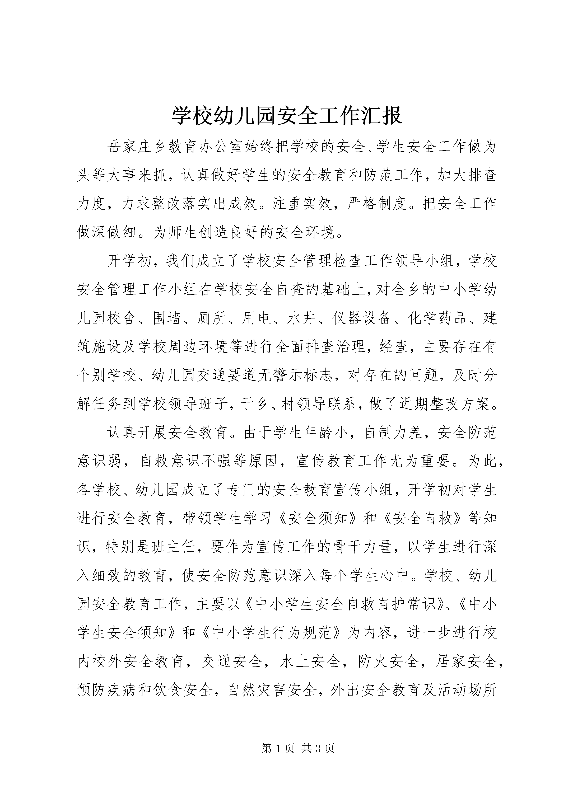 学校幼儿园安全工作汇报岳家庄乡教育办公室始终把学校的安全、学生安全工作做为头等大事来抓认真做好学生的安全教育和防范工作加大排查力度力求整改落实出成效。注重实效严格制度。把安全工作做深做细。为师生创造良好的安全环境。开学初我们成立了学校安全管理检查工作领导小组学校安全管理工作小组在学校安全自查的基础上对全乡的中小学幼儿园校舍、围墙、厕所、用电、水井、仪器设备、化学药品、建筑施设及学校周边环境等进行全面排查治理经查主要存在有个别学校、幼儿园交通要道无警示标志对存在的问题及时分解
