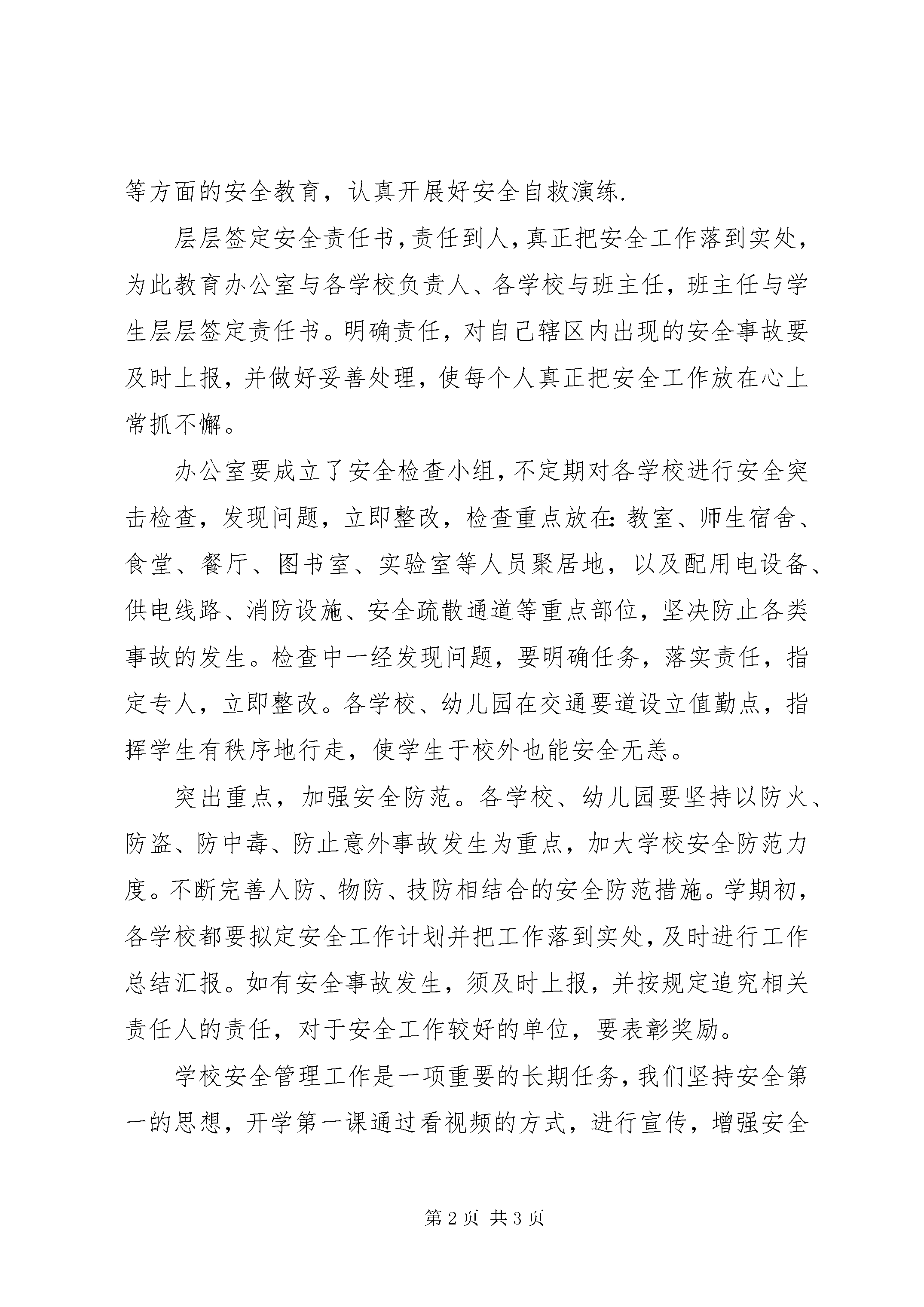 第PAGE\*Arabic\*MERGEFORMAT3页共NUMPAGES\*MERGEFORMAT3页学校幼儿园安全工作汇报岳家庄乡教育办公室始终把学校的安全、学生安全工作做为头等大事来抓,认真做好学生的安全教育和防范工作,加大排查力度,力求整改落实出成效。注重实效,严格制度。把安全工作做深做细。为师生创造良好的安全环境。开学初,我们成立了学校安全管理检查工作领导小组,学校安全管理工作小组在学校安全自查的基础上,对全乡的中小学幼儿园校舍、围墙、厕所、用电、水井、仪器设备、化学药品、建筑施设及
