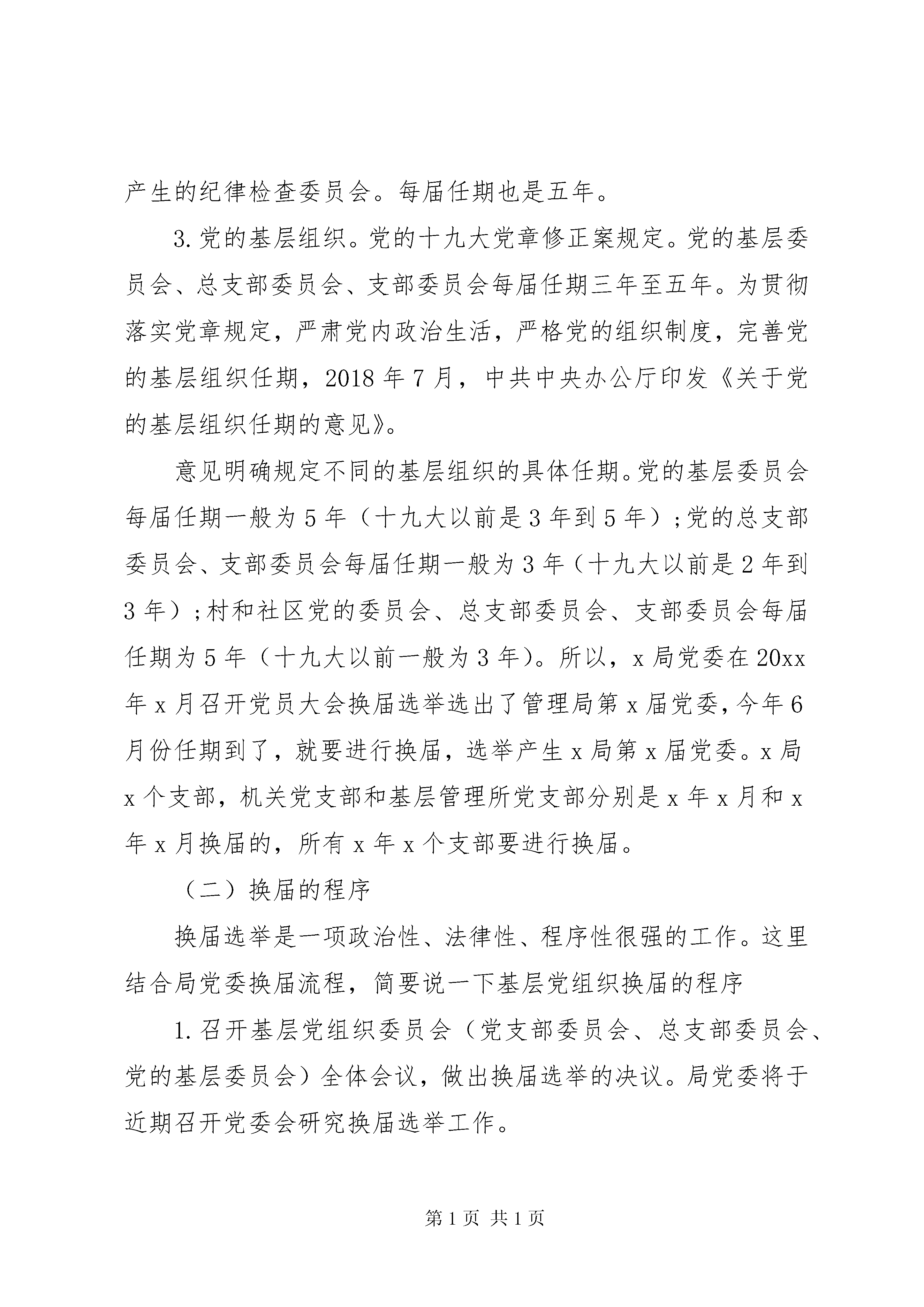 第PAGE\*Arabic\*MERGEFORMAT15页共NUMPAGES\*MERGEFORMAT15页党课讲稿:党委换届||讲话稿三篇党课讲稿一同志们:根据党委安排,今天由我给大家上一堂党课。今年是我们局党委换届年(现在这一届是20xx年x月x日进行换届选举产生,是第x届,按照五年一换届的时间要求,下个月我们要进行换届选举产生新一届暨第x届管理局党委),在x局今年党建工作计划中,也已经明确把换届工作作为一项重要工作。党委换届工作关系重大,大家要增强责任感和使命感,把握好换届选举的要求和流
