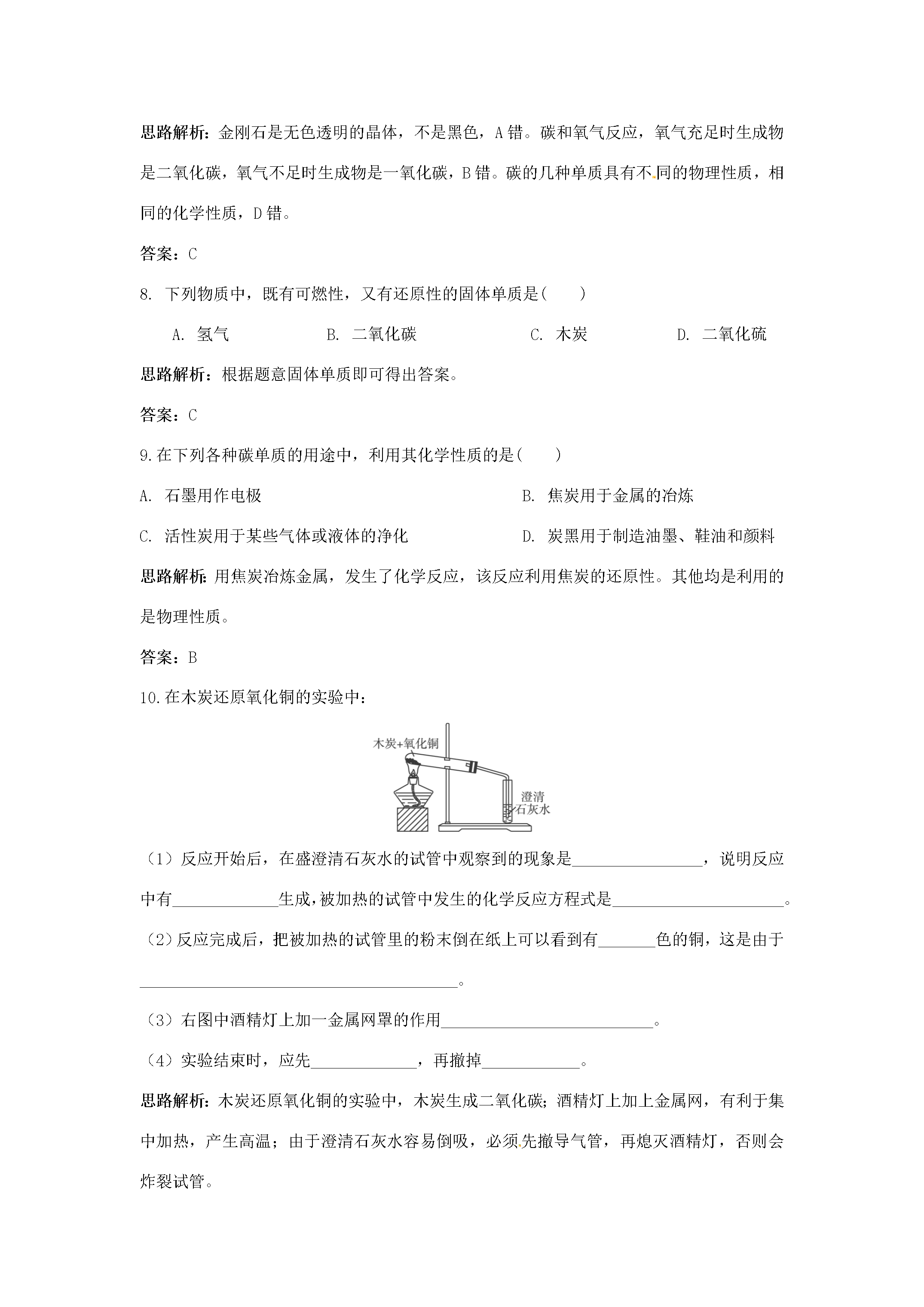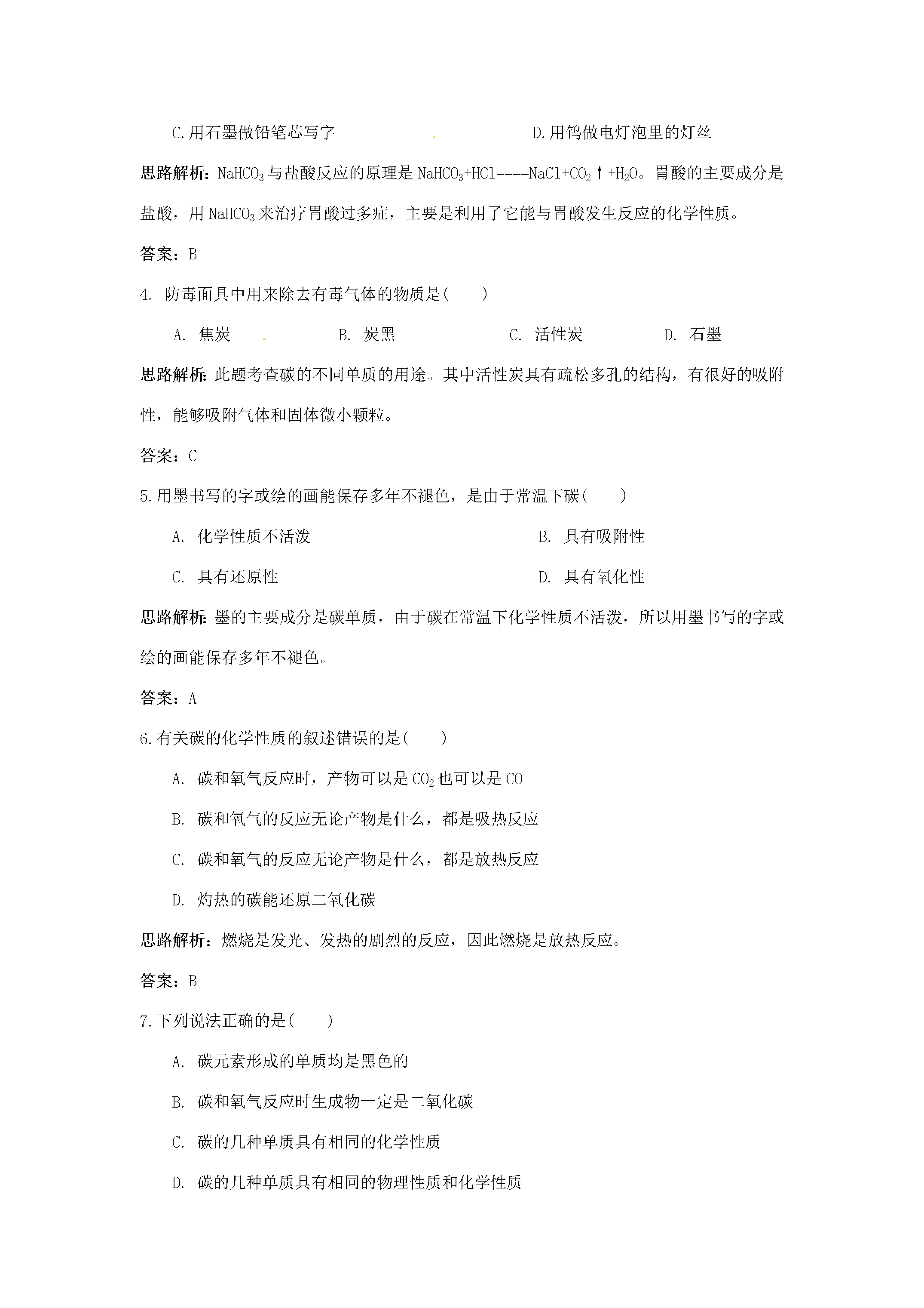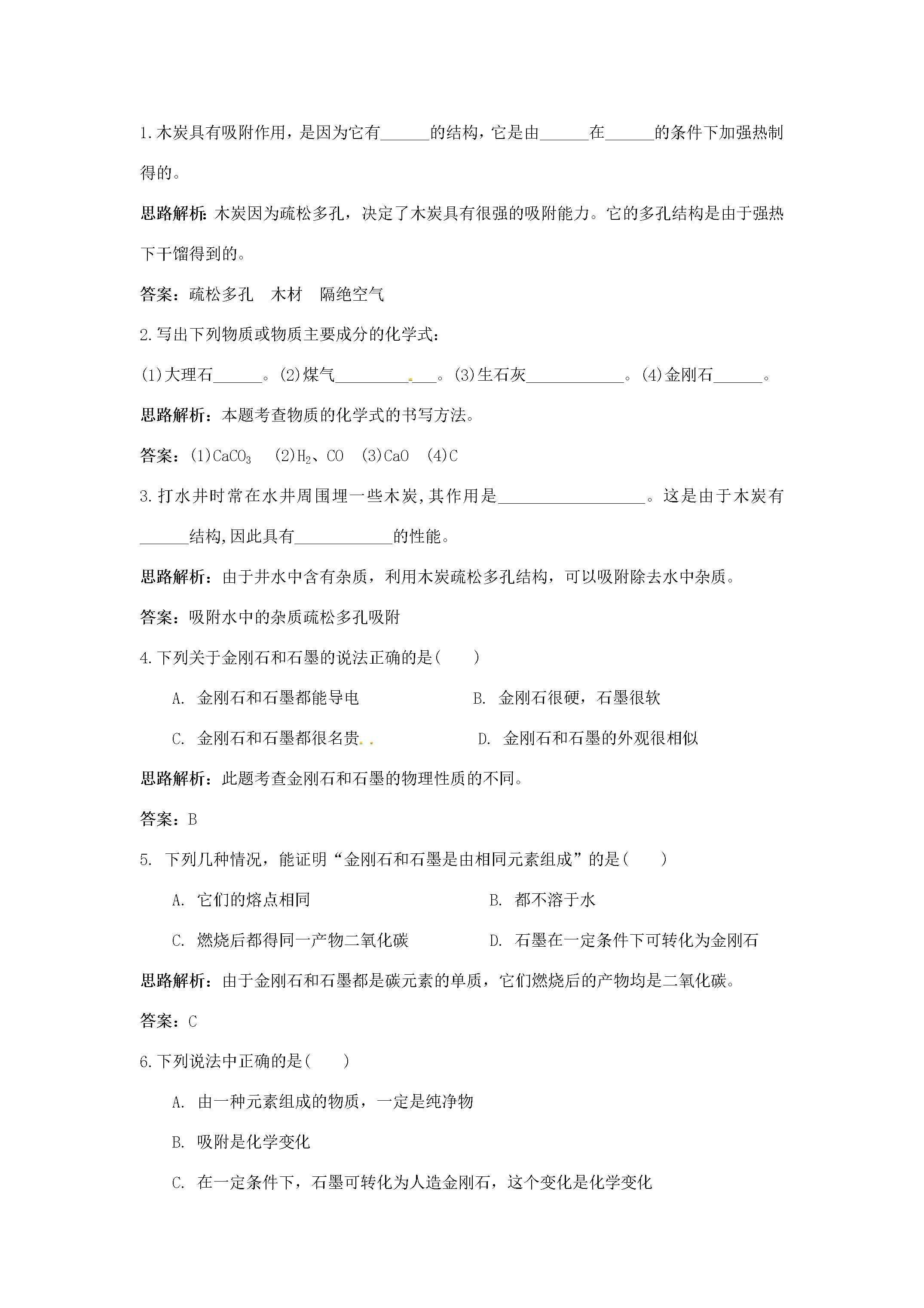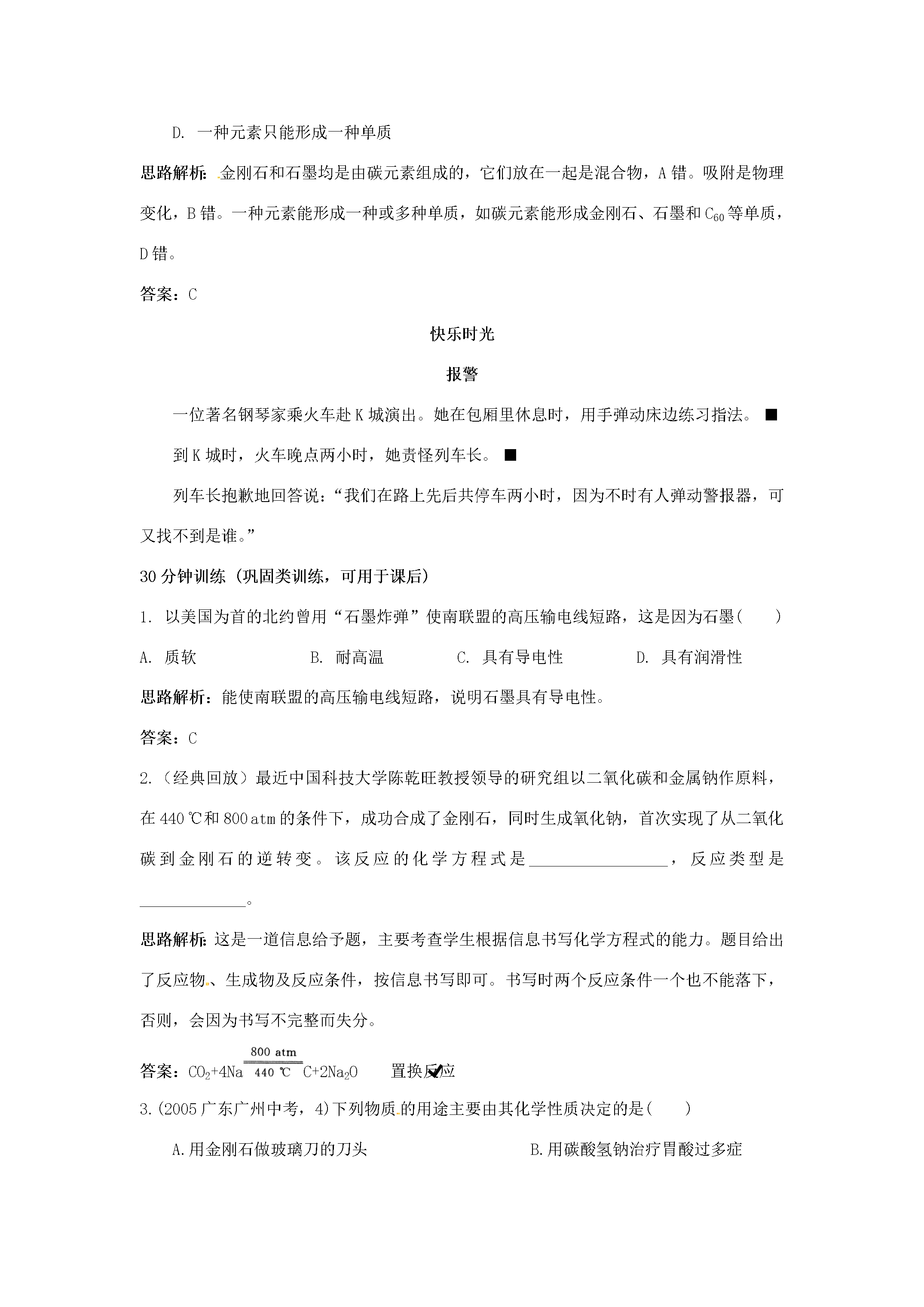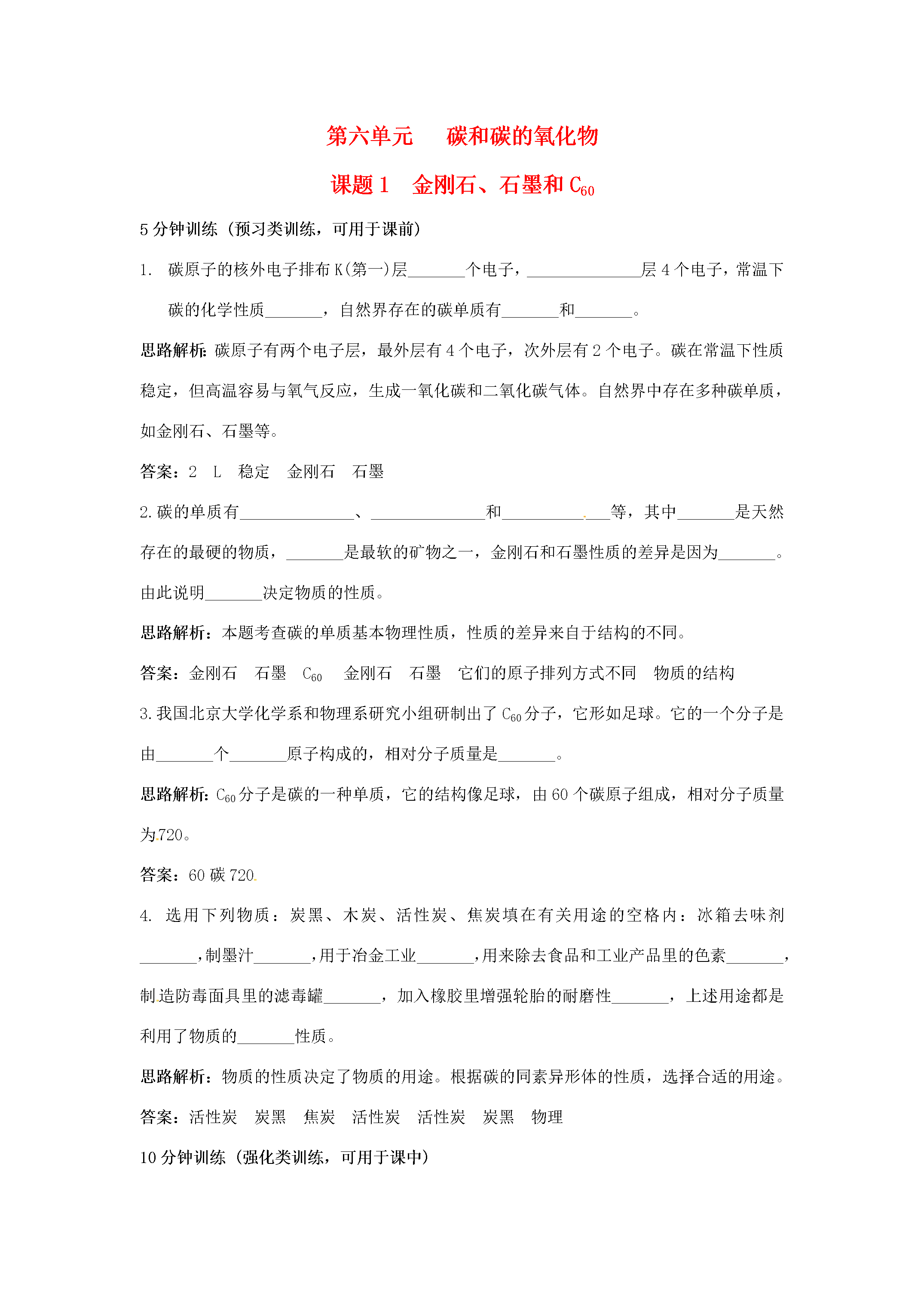 第六单元碳和碳的氧化物课题1金刚石、石墨和C605分钟训练(预习类训练可用于课前)碳原子的核外电子排布K(第一)层_______个电子______________层4个电子常温下碳的化学性质_______自然界存在的碳单质有_______和_______。思路解析:碳原子有两个电子层最外层有4个电子次外层有2个电子。碳在常温下性质稳定但高温容易与氧气反应生成一氧化碳和二氧化碳气体。自然界中存在多种碳单质如金刚石、石墨等。答案:2L稳定金刚石石墨2.碳的单质有__________