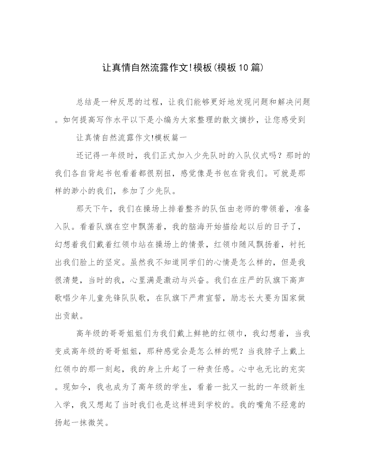 让真情自然流露作文!模板(模板10篇)总结是一种反思的过程,让我们能够更好地发现问题和解决问题。如何提高写作水平以下是小编为大家整理的散文摘抄,让您感受到让真情自然流露作文!模板篇一还记得一年级时,我们正式加入少先队时的入队仪式吗?那时的我们各自背起书包看着都很别扭,感觉像是书包在背我们。可就是那样的渺小的我们,参加了少先队。那天下午,我们在操场上排着整齐的队伍由老师的带领着,准备入队。看着队旗在空中飘荡着,我的脑海开始描绘起以后的日子了,幻想着我们戴着红领巾站在操场上的情景,红领巾随风飘扬着,衬托出我们