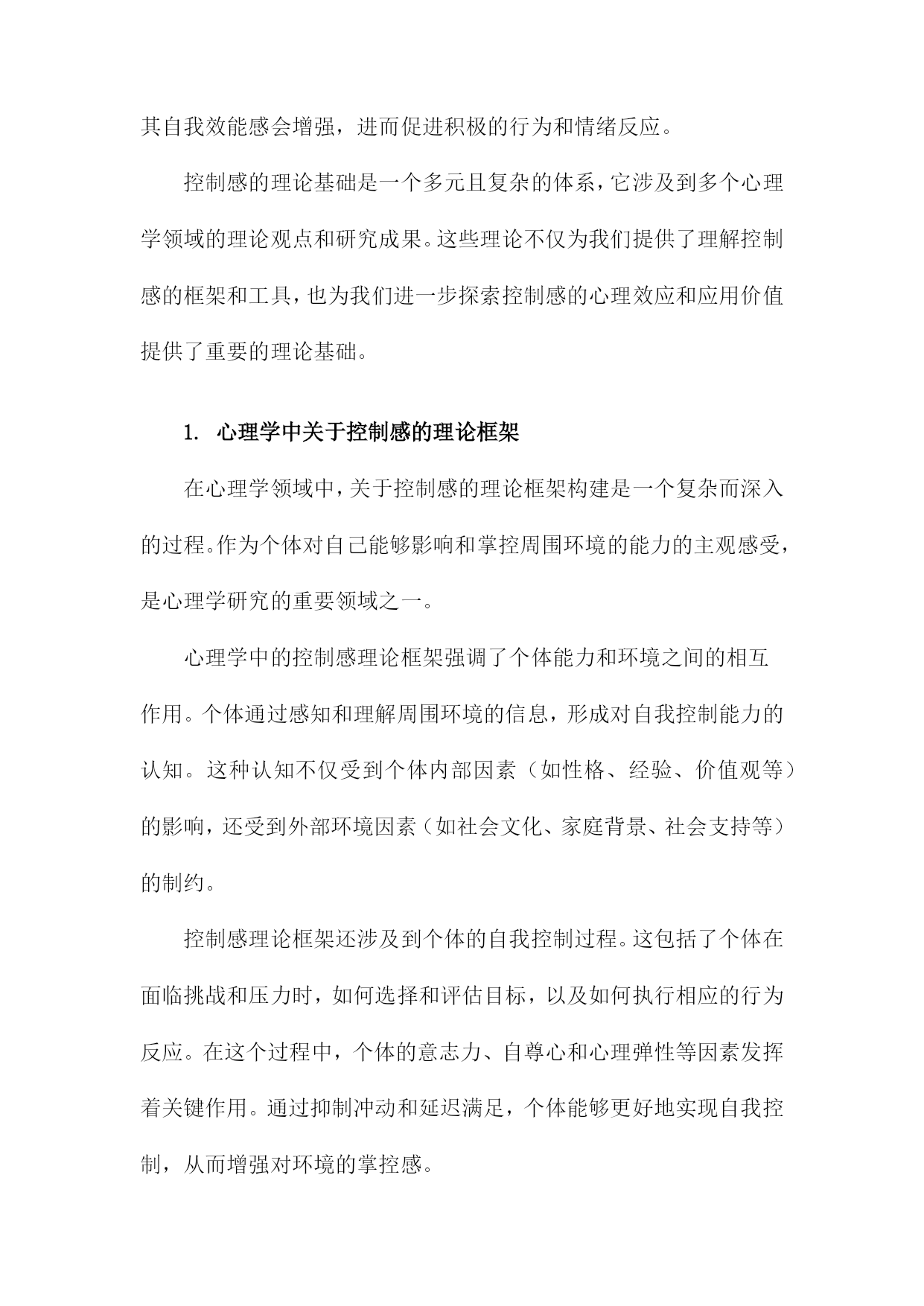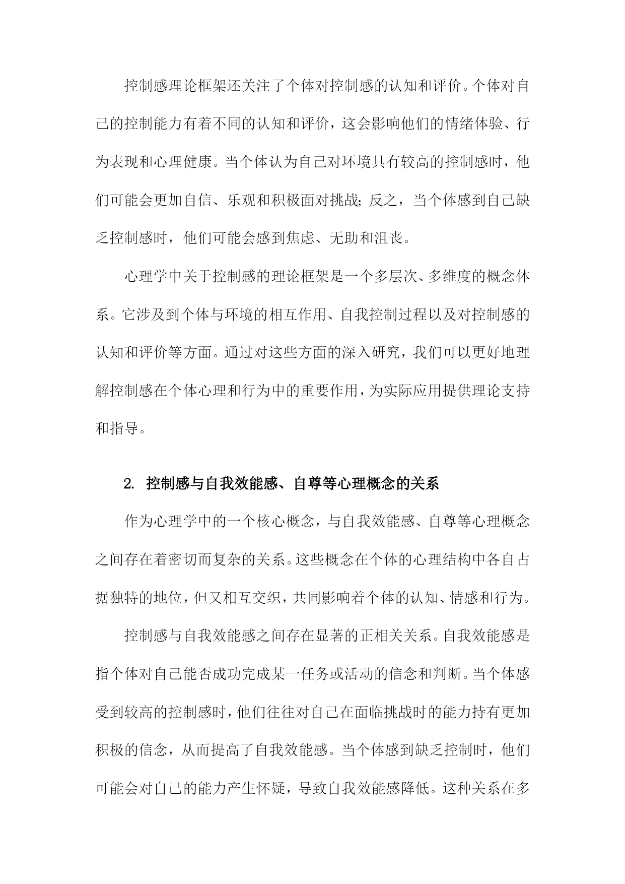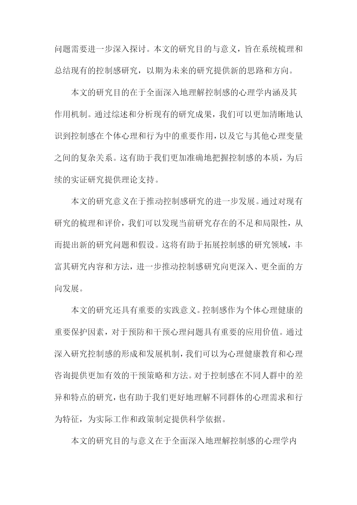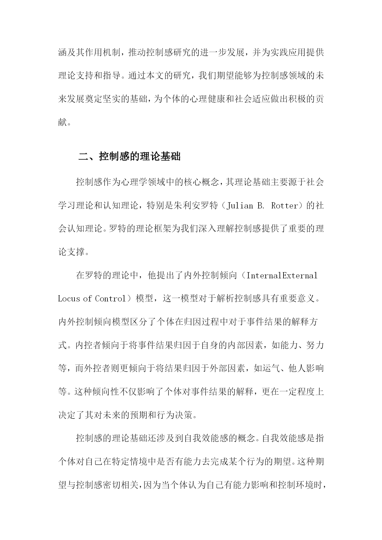 对控制感的心理学理解控制感研究述评一、概述控制感作为心理学领域的一个重要概念,近年来受到了广泛关注。它涉及个体对于自身生活、环境和未来事件的主观掌控程度,是个体在面对各种情境时产生的一种心理体验和认知评价。控制感的研究不仅有助于我们深入理解人类心理活动的本质,还对于提高个体生活质量、缓解心理压力等方面具有重要的实践意义。在心理学的发展历程中,控制感的概念经历了不断的丰富和深化。早期的心理学家关注于控制感与个体自尊、自我效能感等心理特质的关系,认为控制感是个体自我认知的重要组成部分。随着研究的深入,心理学家