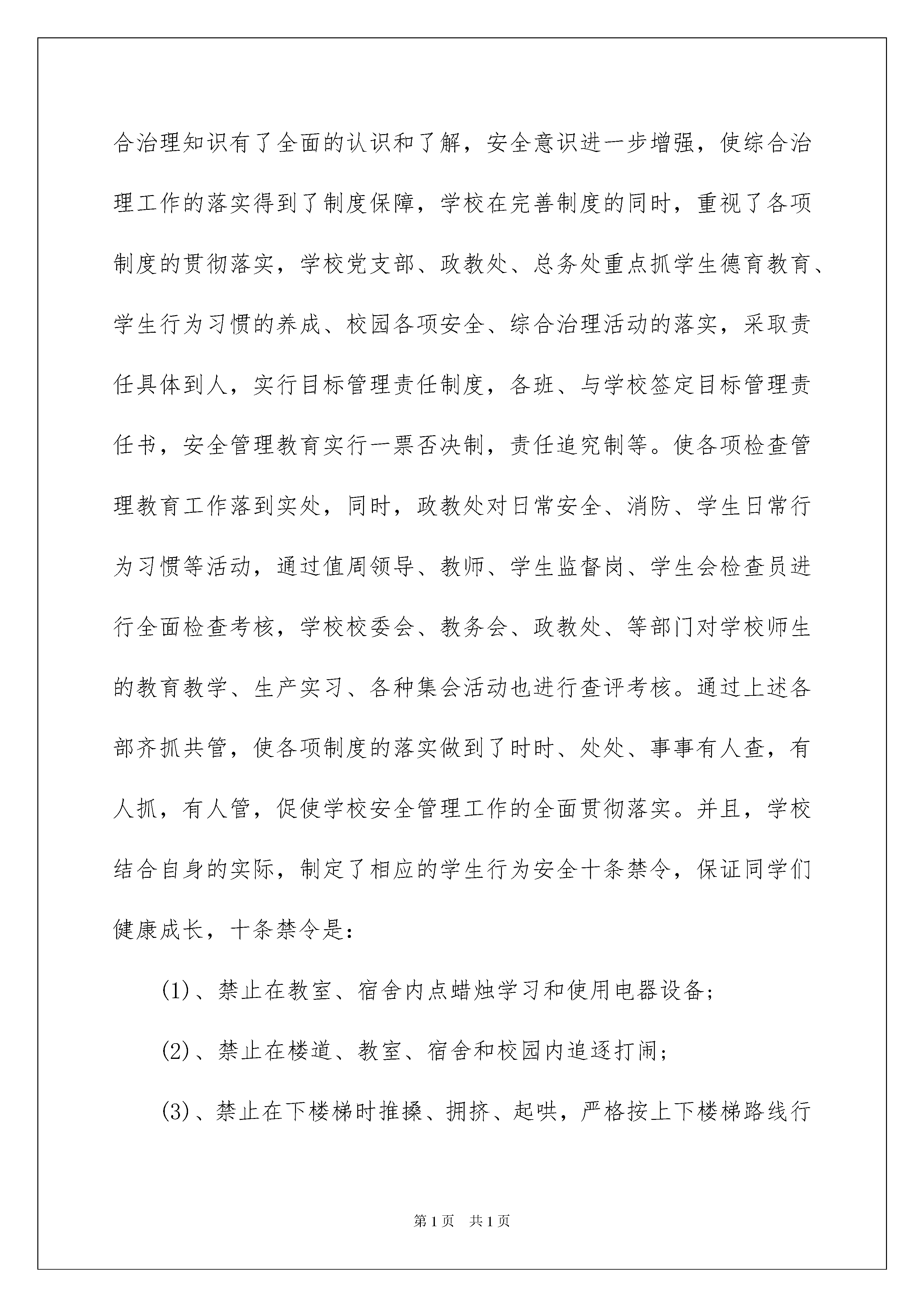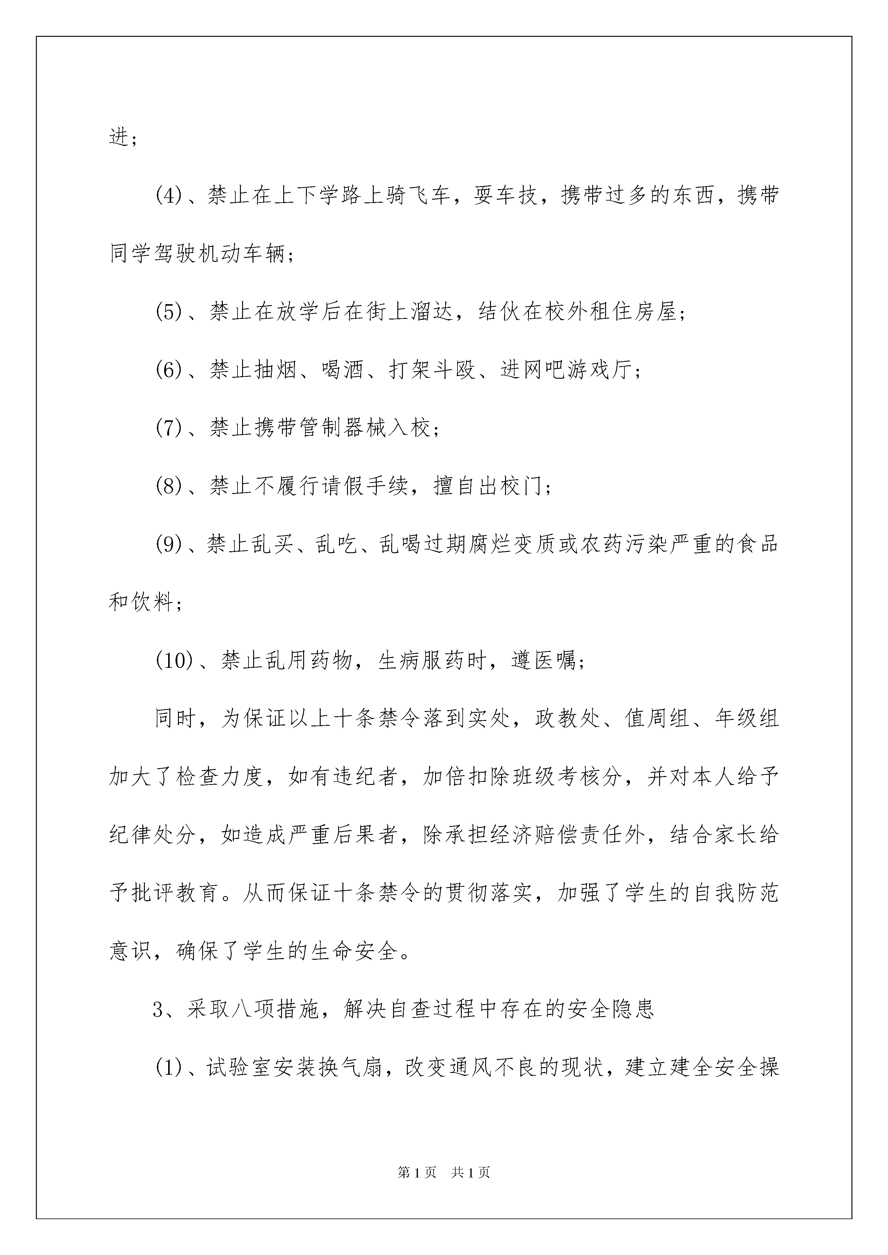 学校学校安全工作自查报告为切实做好学校安全工作消除一切安全隐患我校开学后进行了一次全面排查现将排查情况报告如下:一、存在的问题:1、由于学校三面是公路学生多放学后虽有排路队但入学过公路仍存在很多安全隐患;2、学校只有2个灭火器但时间长已不能使用;3、学校已是d级危房走廊有的地方漏雨;4、部分学生安全意识不强如节假日、课余时间有骑自行车做危险动作等;二、整改措施:学校安全工作事关重大丝毫松懈不得对此我们针对排查发现的问题做出如下整