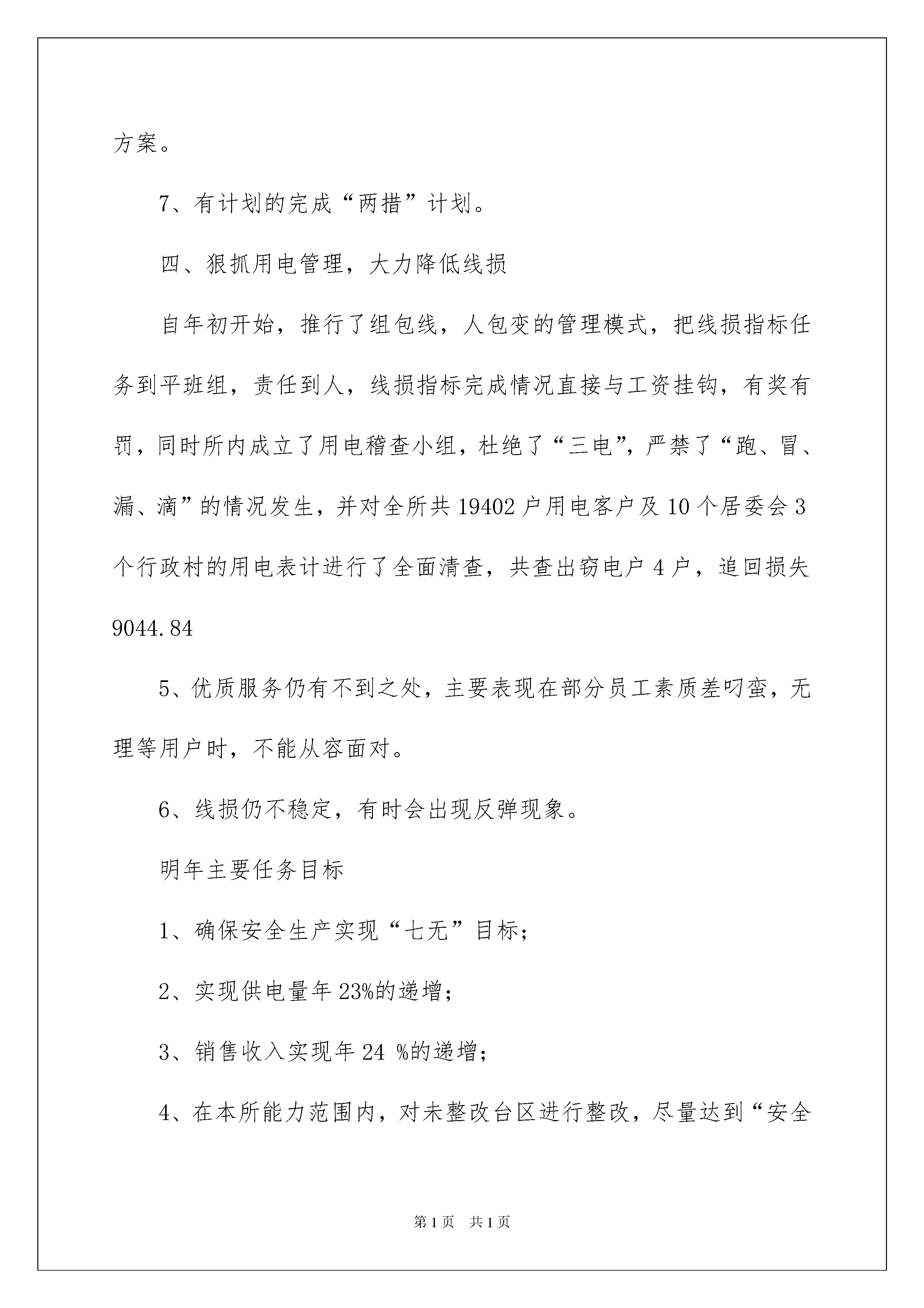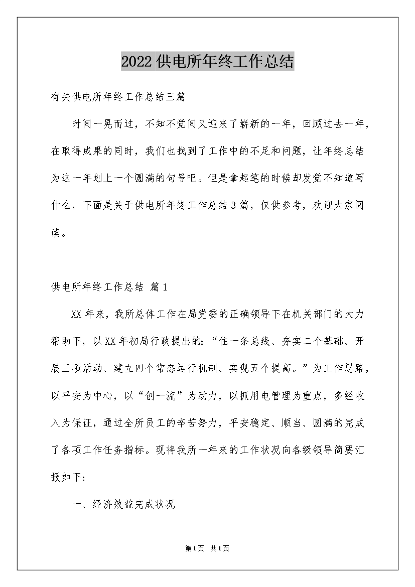 2022供电所年终工作总结有关供电所年终工作总结三篇时间一晃而过,不知不觉间又迎来了崭新的一年,回顾过去一年,在取得成果的同时,我们也找到了工作中的不足和问题,让年终总结为这一年划上一个圆满的句号吧。但是拿起笔的时候却发觉不知道写什么,下面是关于供电所年终工作总结3篇,仅供参考,欢迎大家阅读。供电所年终工作总结篇1XX年来,我所总体工作在局党委的正确领导下在机关部门的大力帮助