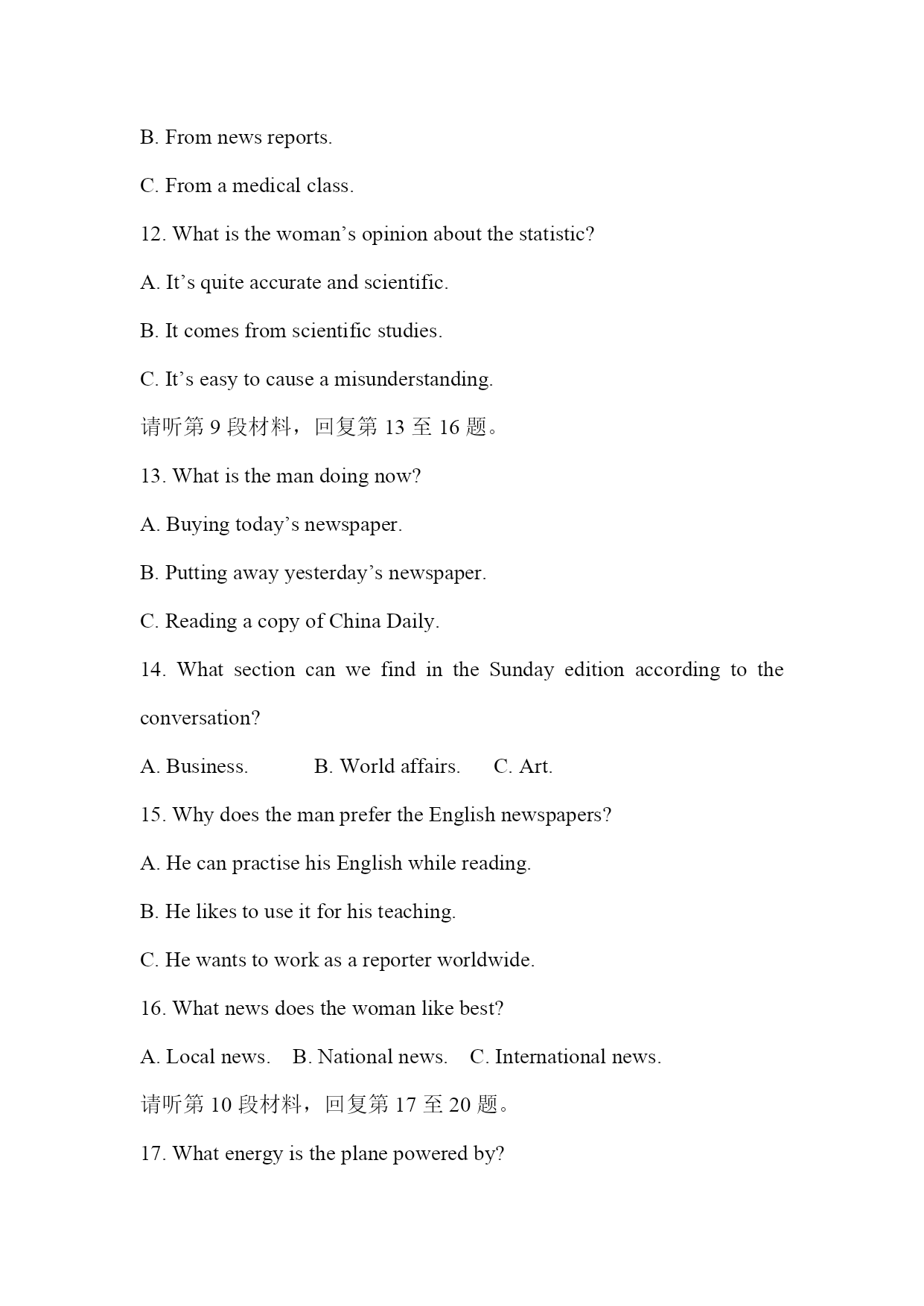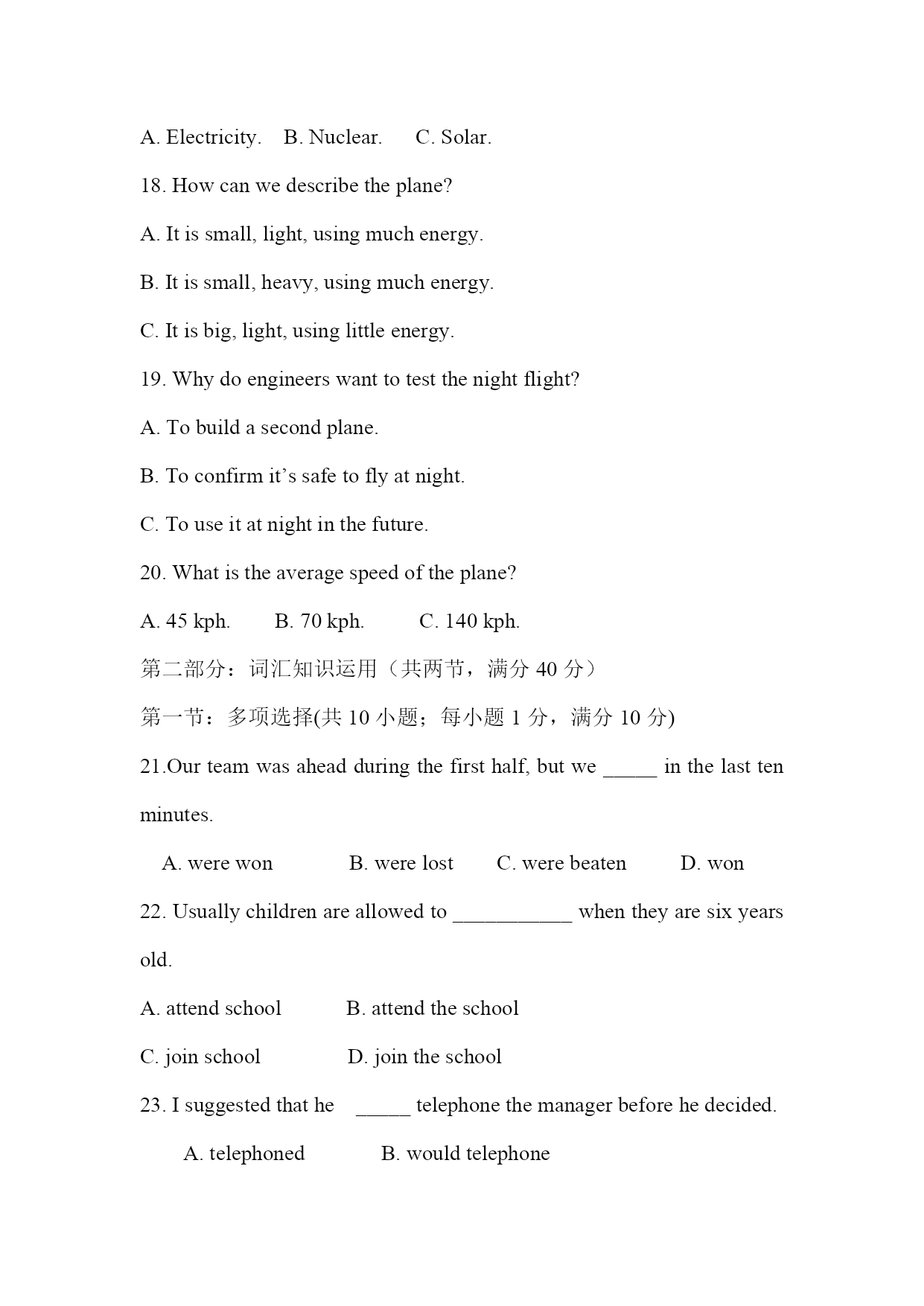 人教版高二英语第一单元测试题Name:______Class:______Marks:_______第一部分:听力(共两节,满分30分)第一节(共5小题;每小题1.5分,满分7.5分)请听下面5段对话,选出最佳选项。Whattimeisitnow?A.7:40.B.7:50.C.8:00.2.Whatdoesthemanmean?A.Hethoughtthewomandidn’tallowhimtodance.B.Hethoughthecoulddanceinthewoman’sroom.C.Hethou