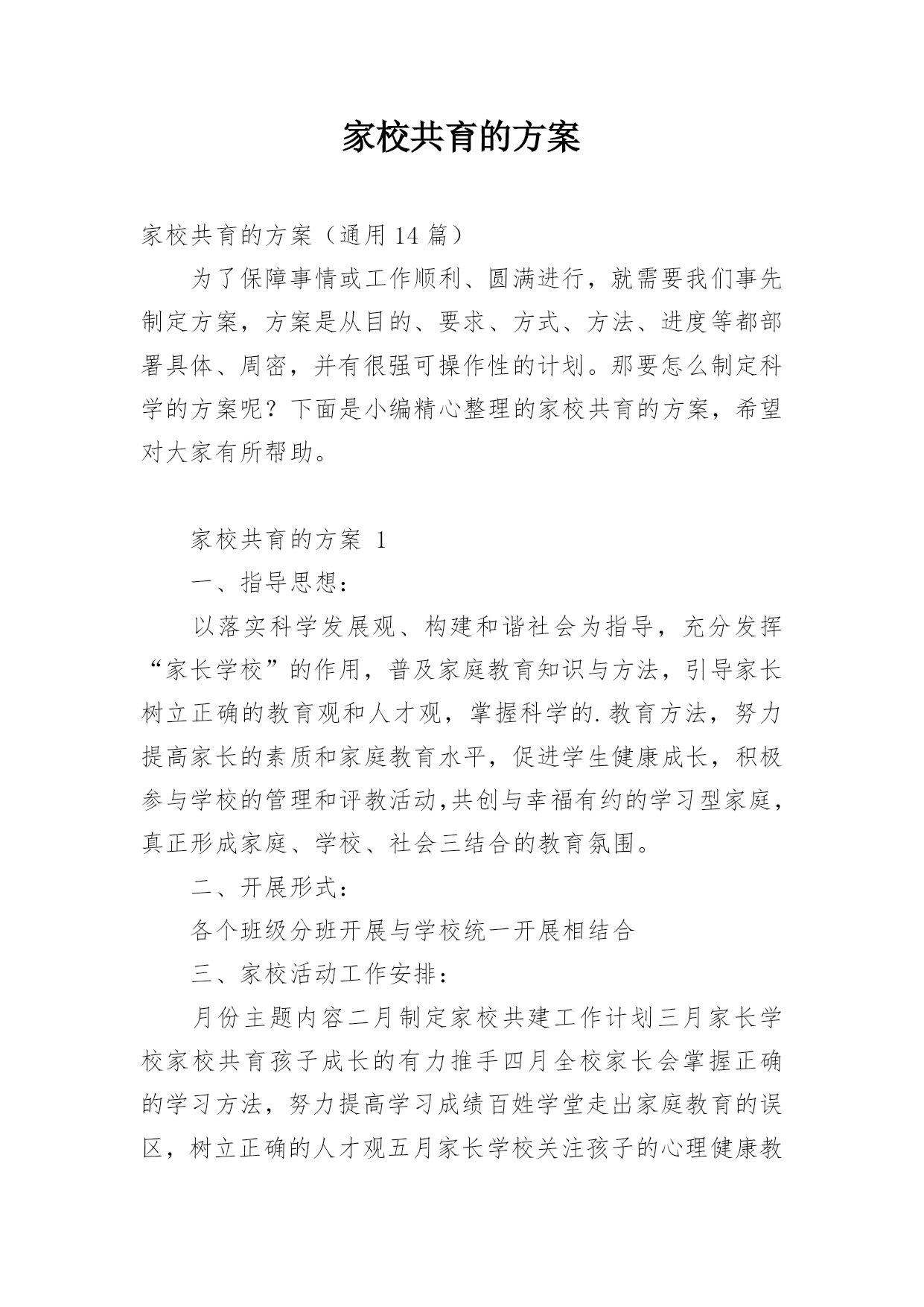 家校共育的方案家校共育的方案(通用14篇)为了保障事情或工作顺利、圆满进行,就需要我们事先制定方案,方案是从目的、要求、方式、方法、进度等都部署具体、周密,并有很强可操作性的计划。那要怎么制定科学的方案呢?下面是小编精心整理的家校共育的方案,希望对大家有所帮助。家校共育的方案1一、指导思想:以落实科学发展观、构建和谐社会为指导,充分发挥“家长学校”的作用,普及家庭教育知识与方法,引导家长树立正确的教育观和人才观,掌握科学的.教育方法,努力提高家长的素质和家庭教育水平,促进学生健康成长,积极参与学校的管理和