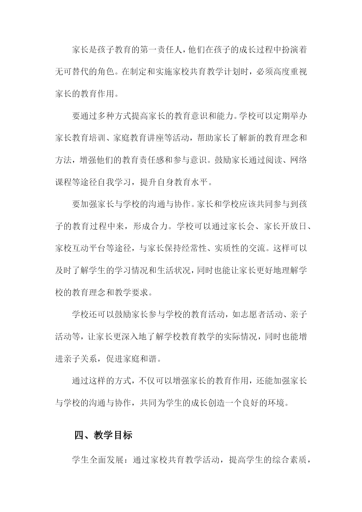 家校共育教学计划方案一、背景介绍:家校共育教学计划是为了加强家校合作,实现学校教育和家庭教育的无缝衔接,共同促进学生全面发展而设计的。本计划从学生的身心发展角度出发,以家庭为基础,学校为平台,通过家庭和学校的密切合作,共同培养学生的各项能力和素质。二、目标与原则:1.目标:家庭和学校共同育人,促进学生成长和发展。2.原则:(1)互信合作:学校与家庭之间建立起互信互助的合作关系,共同推动学生的发展。(2)高效沟通:学校和家庭保持良好的沟通渠道,及时沟通学生的学习情况和成长进程。(3)系统设计:制定科学合理的