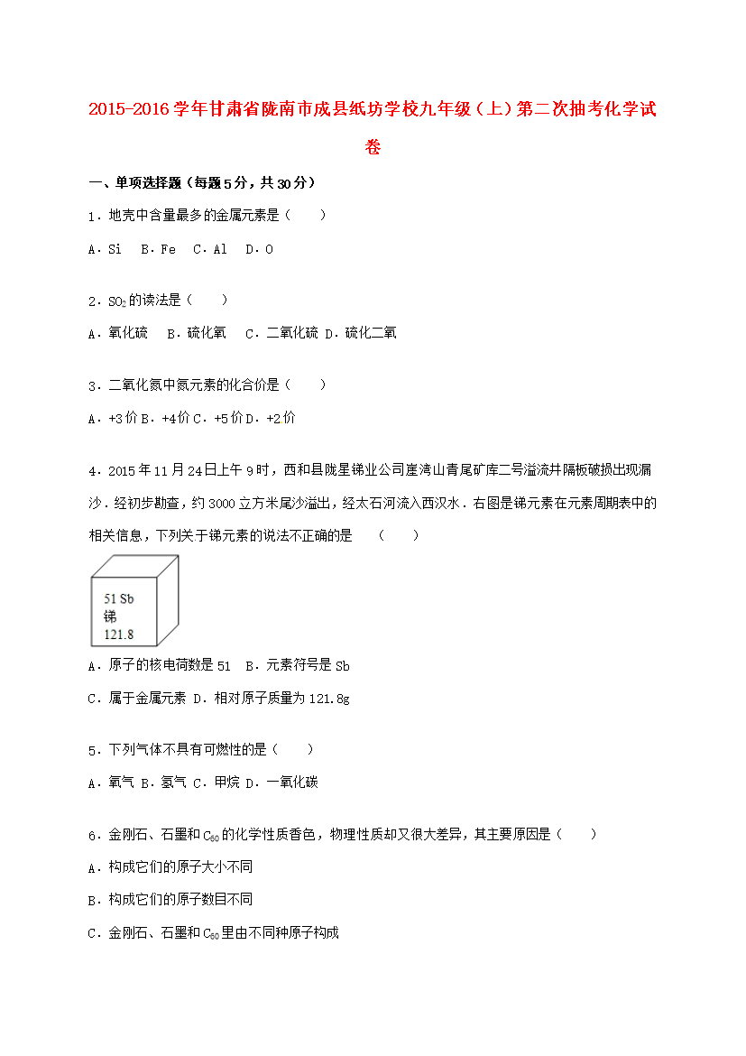 2015-2016学年甘肃省陇南市成县纸坊学校九年级(上)第二次抽考化学试卷一、单项选择题(每题5分共30分)1.地壳中含量最多的金属元素是()A.SiB.FeC.AlD.O2.SO2的读法是()A.氧化硫B.硫化氧C.二氧化硫D.硫化二氧3.二氧化氮中氮元素的化合价是()A.+3价B.+4价C.+5价D.+2价4.2015年11月24日上午9时西和县陇星锑业公司崖湾山青尾矿库二号溢流井隔板破损出现漏沙.经初步勘查约3000立方米尾沙溢出经太石河流入西汉水.右图是锑元素在元素周期表中的相