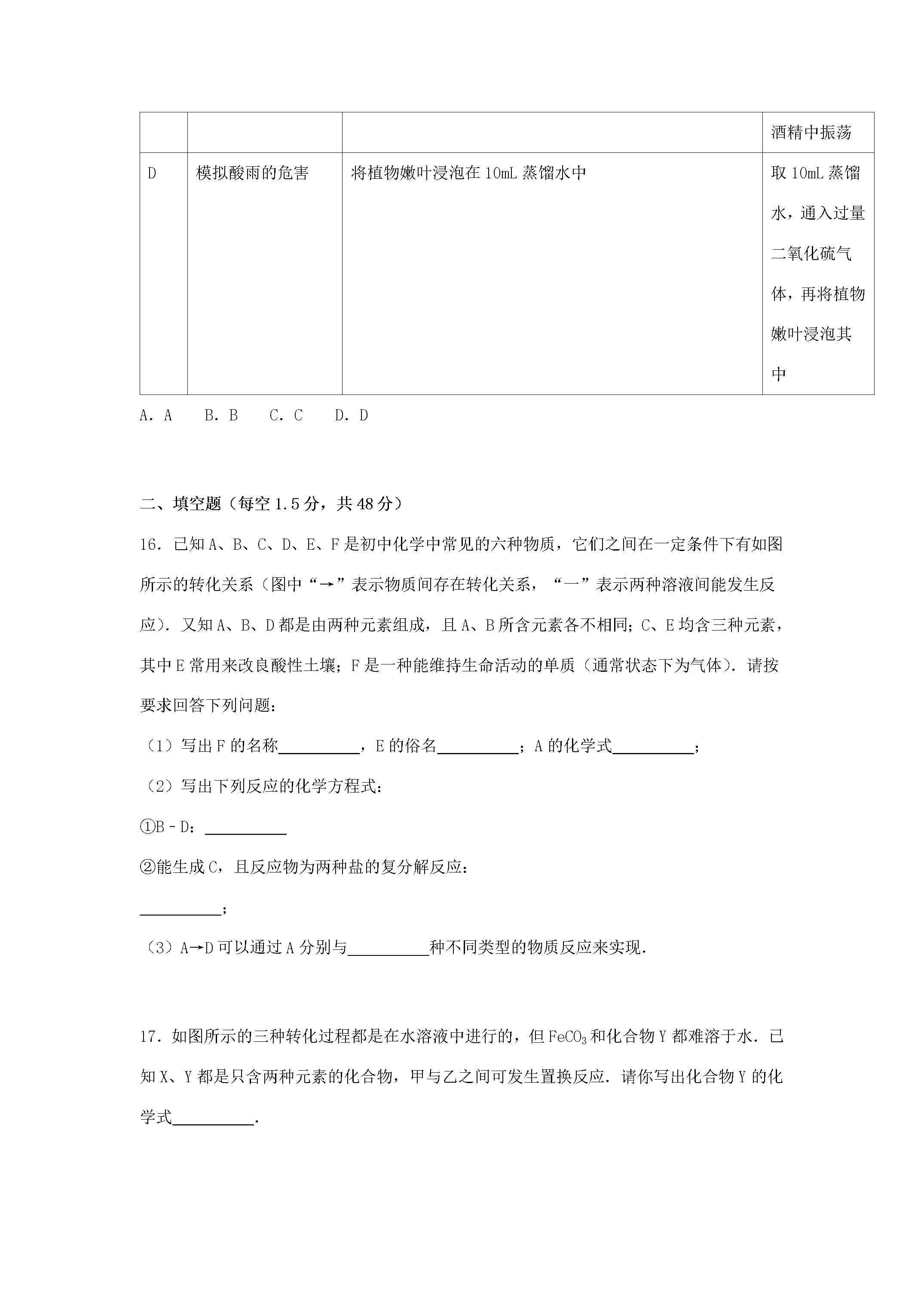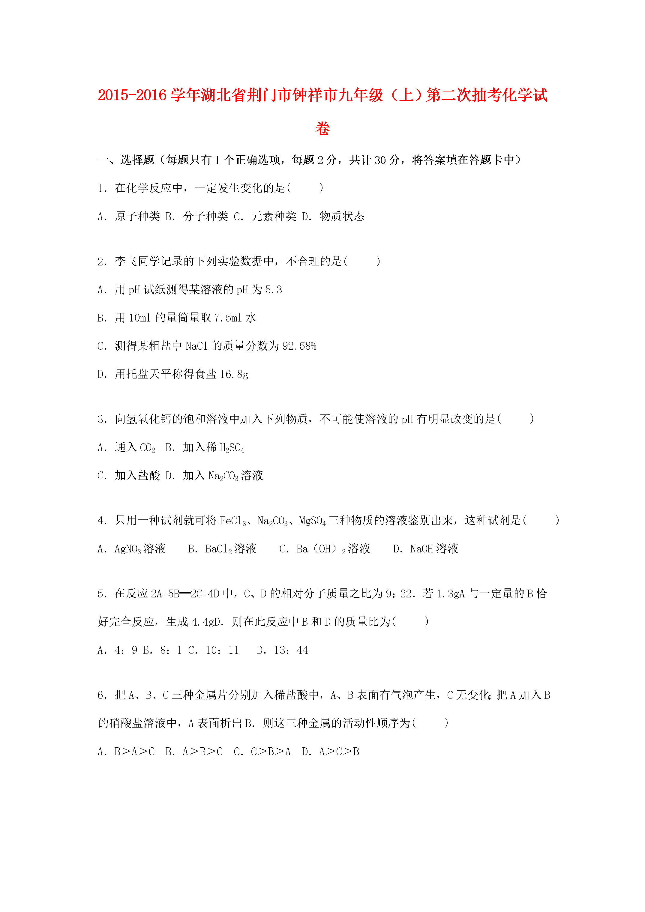 2015-2016学年湖北省荆门市钟祥市九年级(上)第二次抽考化学试卷一、选择题(每题只有1个正确选项,每题2分,共计30分,将答案填在答题卡中)1.在化学反应中,一定发生变化的是()A.原子种类B.分子种类C.元素种类D.物质状态2.李飞同学记录的下列实验数据中,不合理的是()A.用pH试纸测得某溶液的pH为5.3B.用10ml的量筒量取7.5ml水C.测得某粗盐中NaCl的质量分数为92.58%D.用托盘天平称得食盐16.8g3.向氢氧化钙的饱和溶液中加入下列物质,不可能使溶液的pH有明显改变的是()