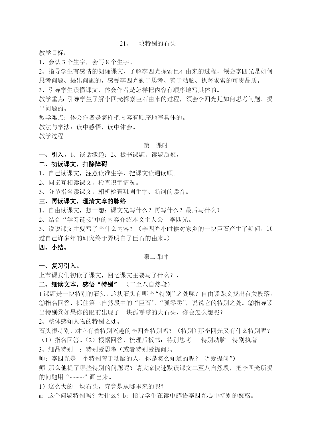 21、一块特别的石头教学目标:1、会认3个生字,会写8个生字。2、指导学生有感情的朗诵课文,了解李四光探索巨石由来的过程,领会李四光是如何思考问题、提出问题的,感受李四光勤于思考、善于动脑、执著求索的可贵品质。3、引导学生读懂课文,体会作者是怎样把内容有顺序地写具体的。教学重点:引导学生了解李四光探索巨石由来的过程,领会李四光是如何思考问题、提出问题的。教学难点:体会作者是怎样把内容有顺序地写具体的。教法与学法:读中感悟,读中体会。教学过程第一课时一、引入。1、谈话激趣:2、
