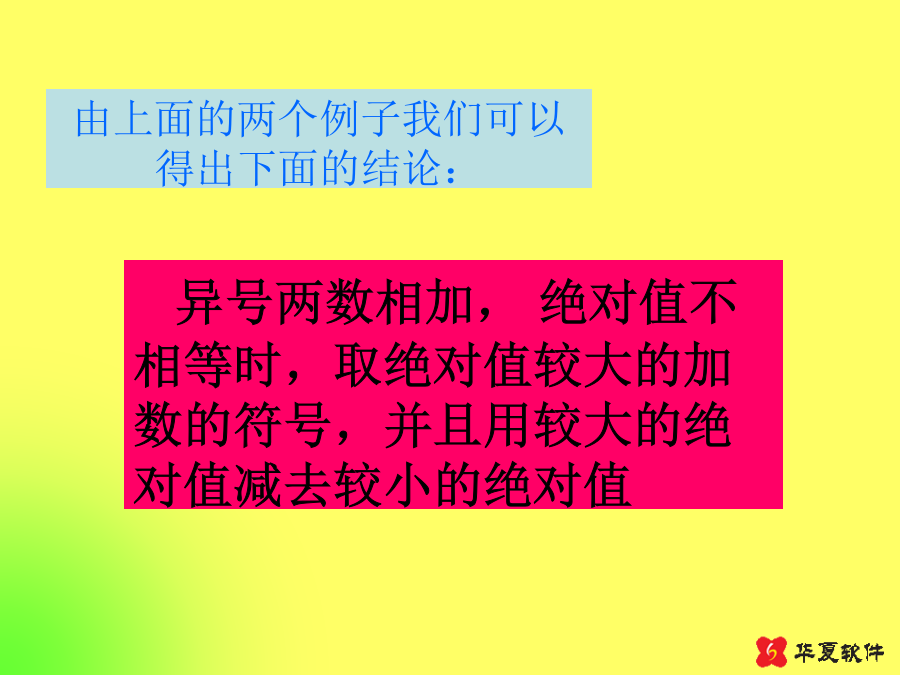 1.4.2有理数的加法引言一.复习提问1、下列各组数中,哪一个数的绝对值大?(1)7和4;(2)-7和4;(3)7和-4;(4)-7和-4。2、说明下列用负数表示的量的实际意义(1)小兰第一次前进了5米,接着按同一方向又前进了-2米;(2)北京的气温第一天上升了3℃,第二天又上升了-1℃;(3)东方汽车向东走了4千米之后,再向东走了-2千米。3、根据上述问题,回答(1)小兰两次一共前进了几米?(2)北京的气温两天一共上升了几度?(3)东方汽车一共向东走了几千米?二、动态演示分类归纳总结法则由上面的两个例子