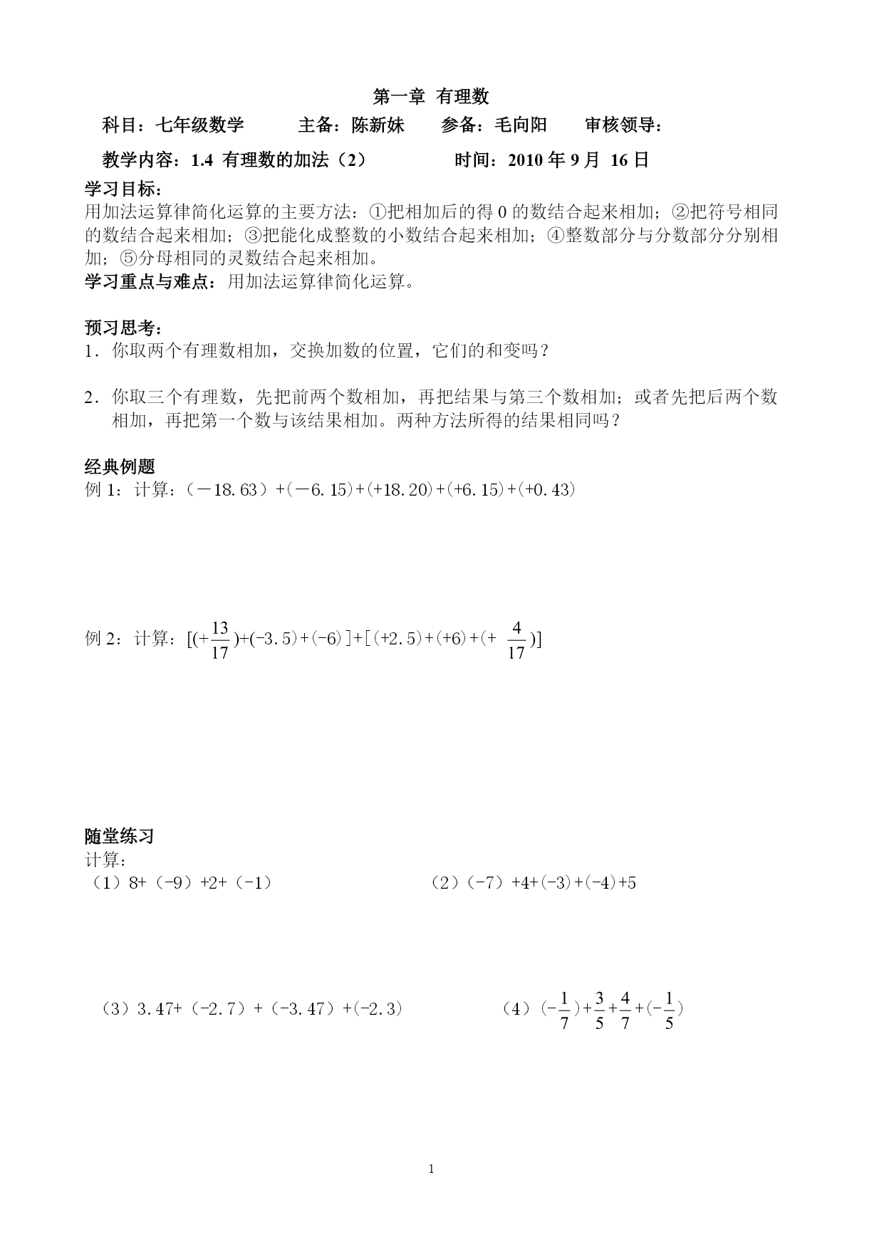 有理数科目:七年级数学主备:陈新妹参备:毛向阳审核领导:教学内容:1.4有理数的加法(2)时间:2010年9月16日学习目标:用加法运算律简化运算的主要方法:①把相加后的得0的数结合起来相加;②把符号相同的数结合起来相加;③把能化成整数的小数结合起来相加;④整数部分与分数部分分别相加;⑤分母相同的灵数结合起来相加。学习重点与难点:用加法运算律简化运算。预习思考:你取两个有理数相加,交换加数的位置,它们的和变吗?你取三个有理数,先把前两个数相加,再把结果与第三个数相加;或者先把