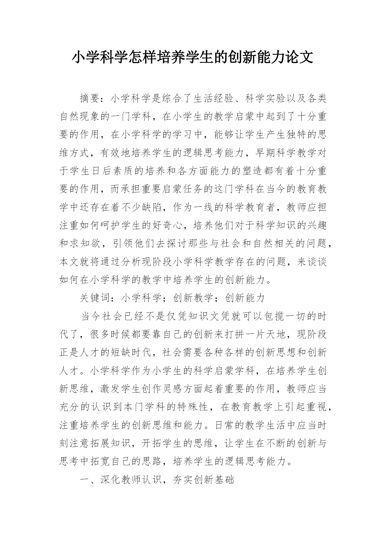 小学科学怎样培养学生的创新能力论文小学科学怎样培养学生的创新能力论文摘要:小学科学是综合了生活经验、科学实验以及各类自然现象的一门学科,在小学生的教学启蒙中起到了十分重要的作用,在小学科学的学习中,能够让学生产生独特的思维方式,有效地培养学生的逻辑思考能力,早期科学教学对于学生日后素质的培养和各方面能力的塑造都有着十分重要的作用,而承担重要启蒙任务的这门学科在当今的教育教学中还存在着不少缺陷,作为一线的科学教育者,教师应担注重如何呵护学生的好奇心,培养他们对于科学知识的兴趣和求知欲,引领他们去探讨那些与社