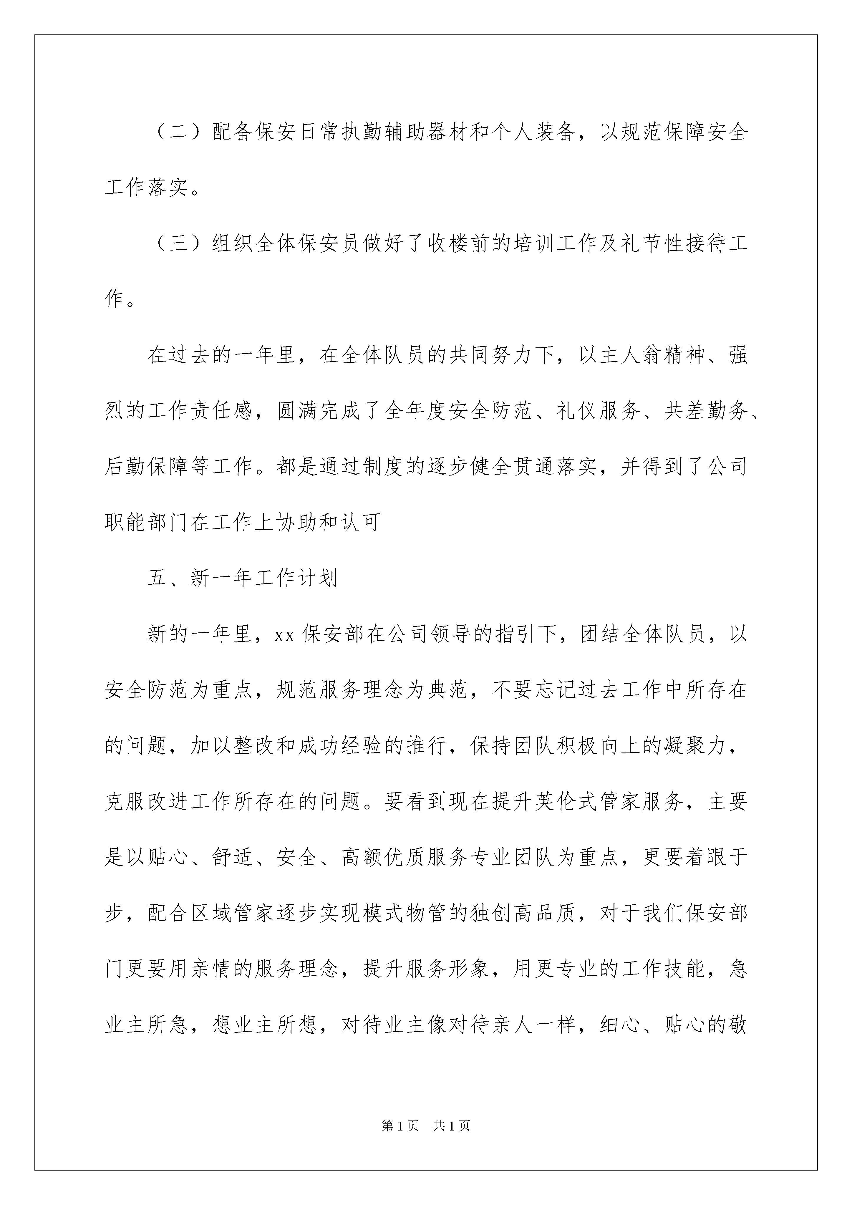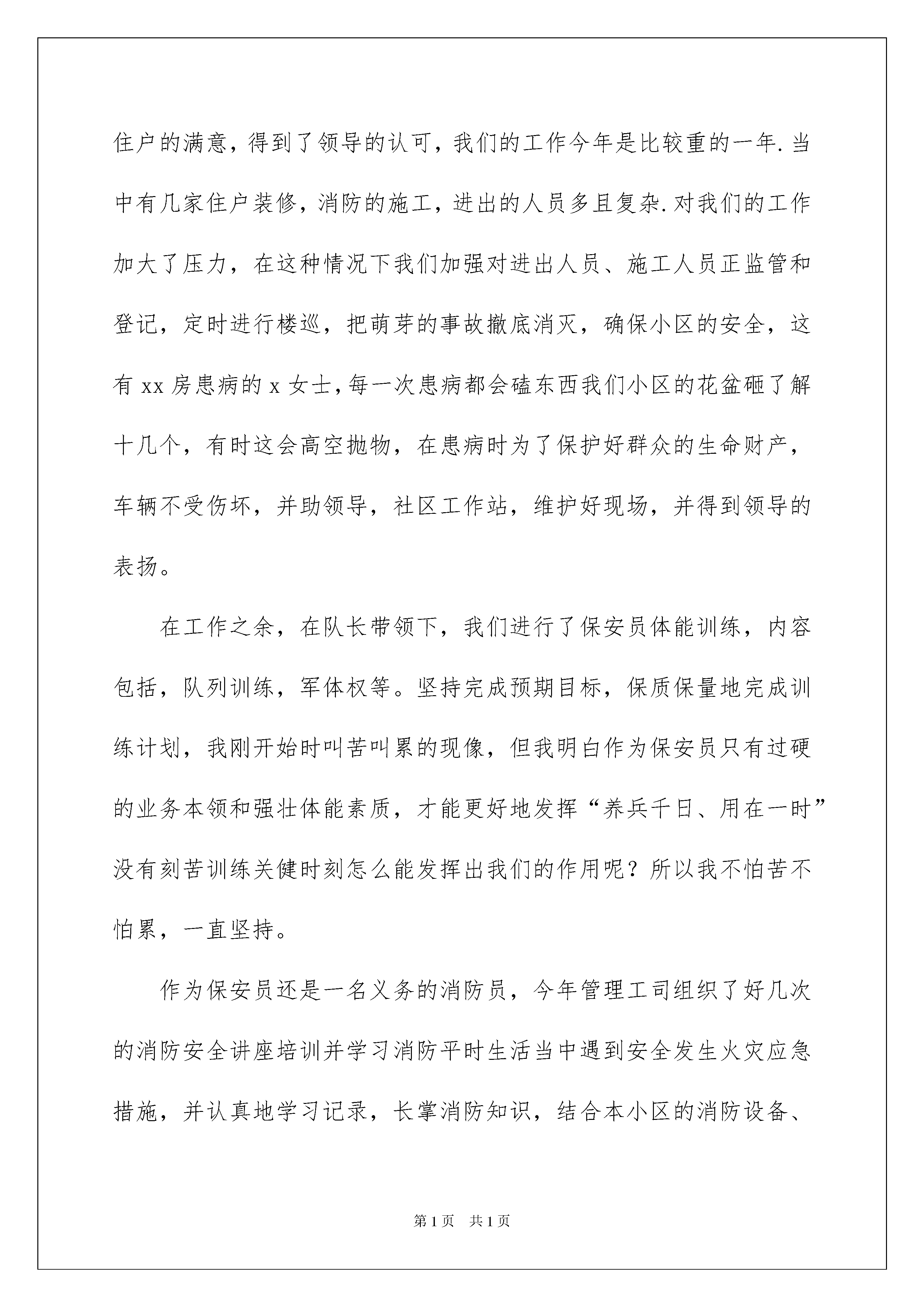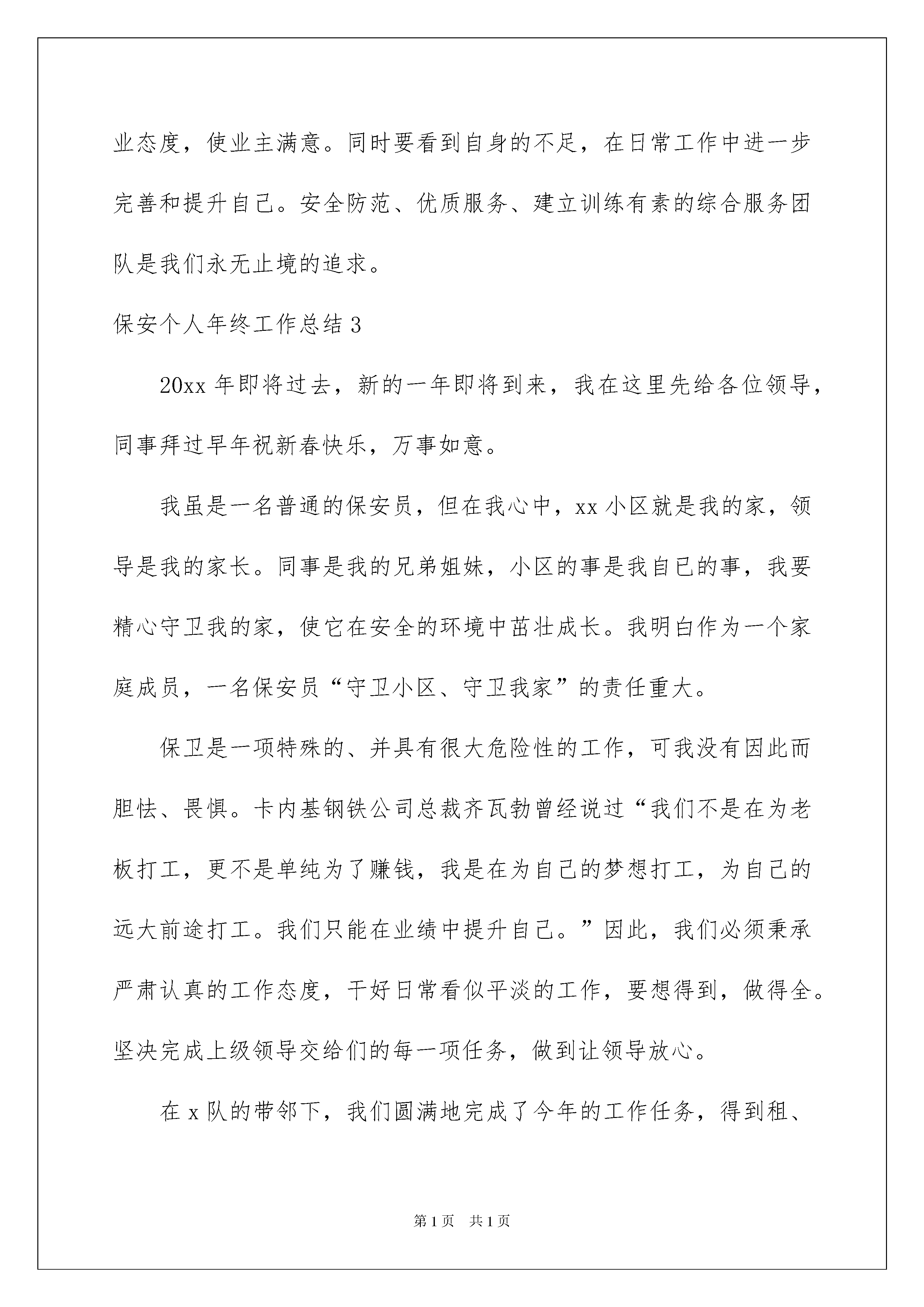 此资料由网络收集而来,如有侵权请告知上传者立即删除。资料共分享,我们负责传递知识。保安个人的年终工作总结保安安全工作是企业的生存之本,那保安年终工作总结怎么写呢?下面小编就和大家分享保安年终工作总结,来欣赏一下吧。保安年终工作总结(一)2020年即将过去,新的一年即将到来,我在这里先给各位领导,同事拜过早年祝新春快乐,万事如意。我虽是一名普通的保安员,但在我心中,xx小区就是我的家,领导是我的家长。同事是我的兄弟姐妹,小区的事是我自已的事,我要精心守卫我的家,使它在安全的环境中茁壮成长。我明白作为一个家庭