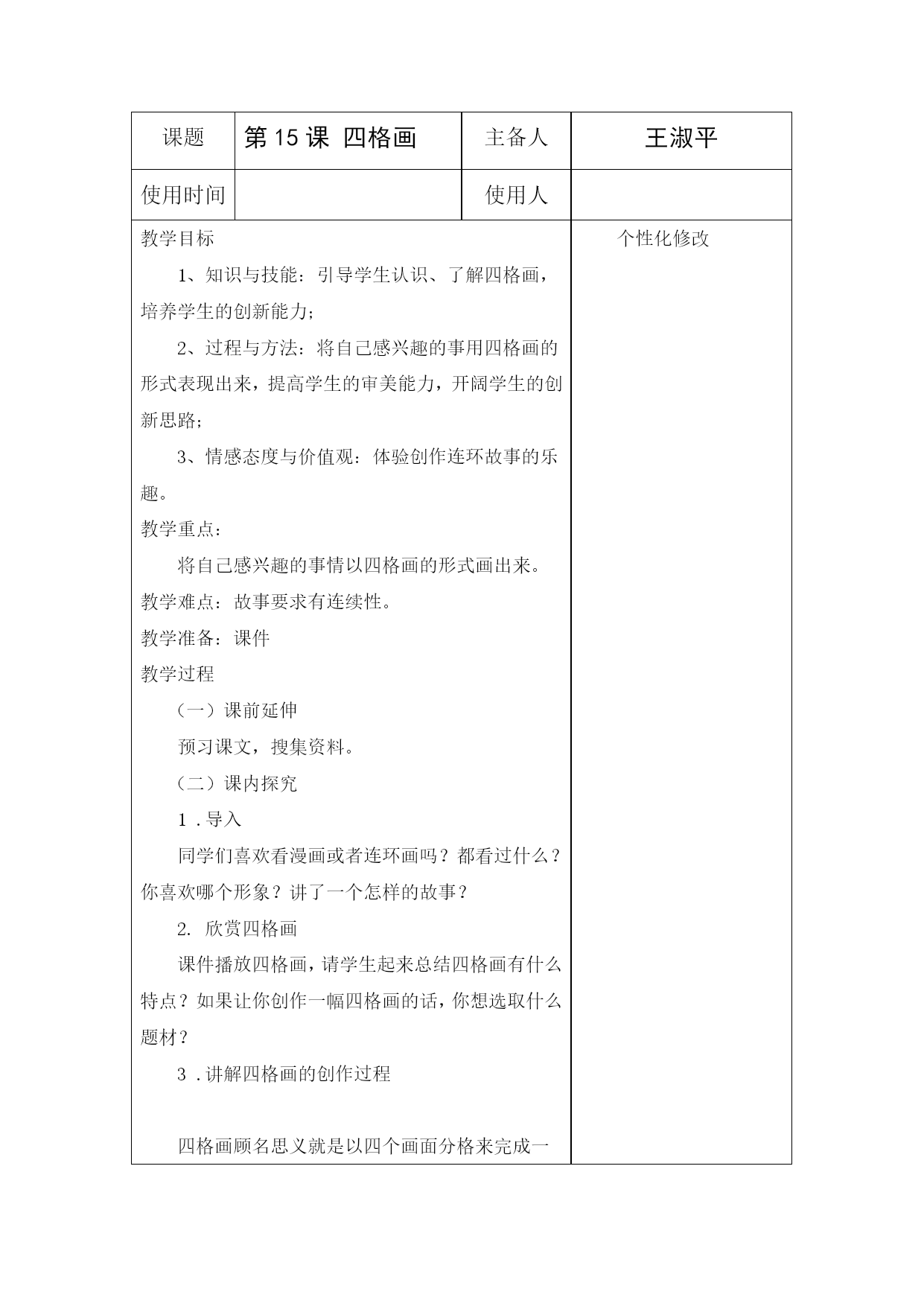 课题第15课四格画主备人王淑平使用时间使用人教学目标1、知识与技能:引导学生认识、了解四格画,培养学生的创新能力;2、过程与方法:将自己感兴趣的事用四格画的形式表现出来,提高学生的审美能力,开阔学生的创新思路;3、情感态度与价值观:体验创作连环故事的乐趣。教学重点:将自己感兴趣的事情以四格画的形式画出来。教学难点:故事要求有连续性。教学准备:课件教学过程(一)课前延伸预习课文,搜集资料。(二)课内探究1.导入同学们喜欢看漫画或者连环画吗?都看过什么?你喜欢哪个形象?讲了一个怎样的故事?2.欣赏四格画课件播