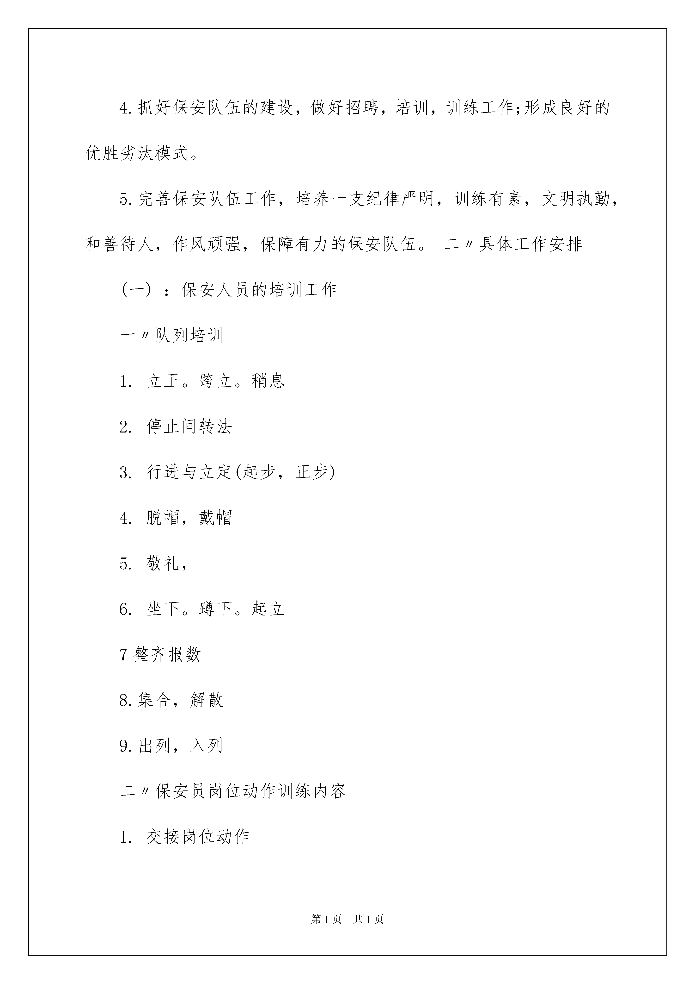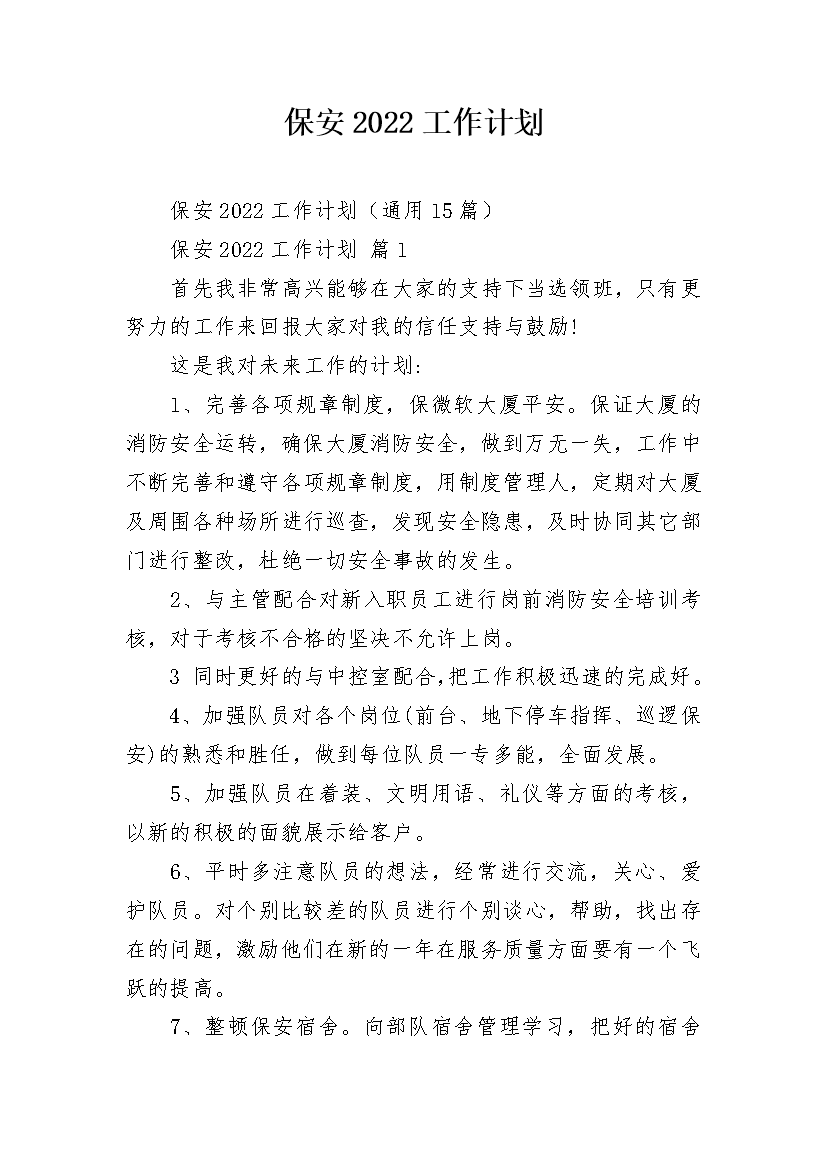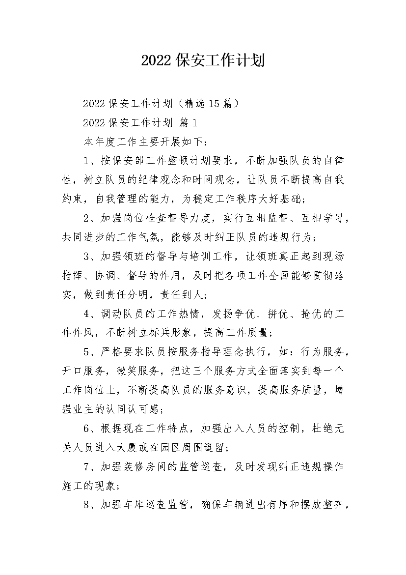 2022保安工作计划2022保安工作计划(精选15篇)2022保安工作计划篇1本年度工作主要开展如下:1、按保安部工作整顿计划要求,不断加强队员的自律性,树立队员的纪律观念和时间观念,让队员不断提高自我约束,自我管理的能力,为稳定工作秩序大好基础;2、加强岗位检查督导力度,实行互相监督、互相学习,共同进步的工作气氛,能够及时纠正队员的违规行为;3、加强领班的督导与培训工作,让领班真正起到现场指挥、协调、督导的作用,及时把各项工作全面能够贯彻落实,做到责任分明,责任到人;4、调动队员的工作热情,发扬争优、拼