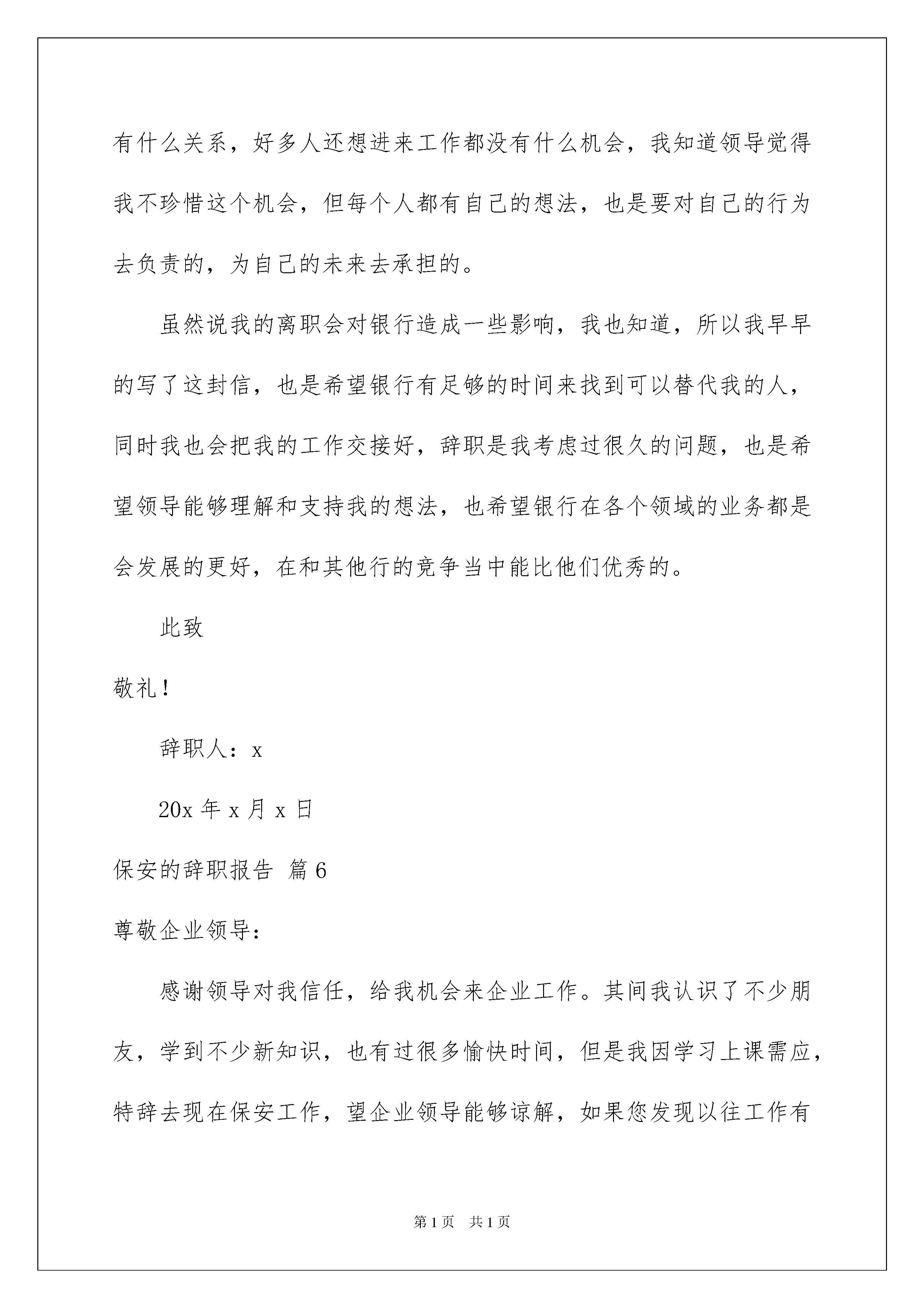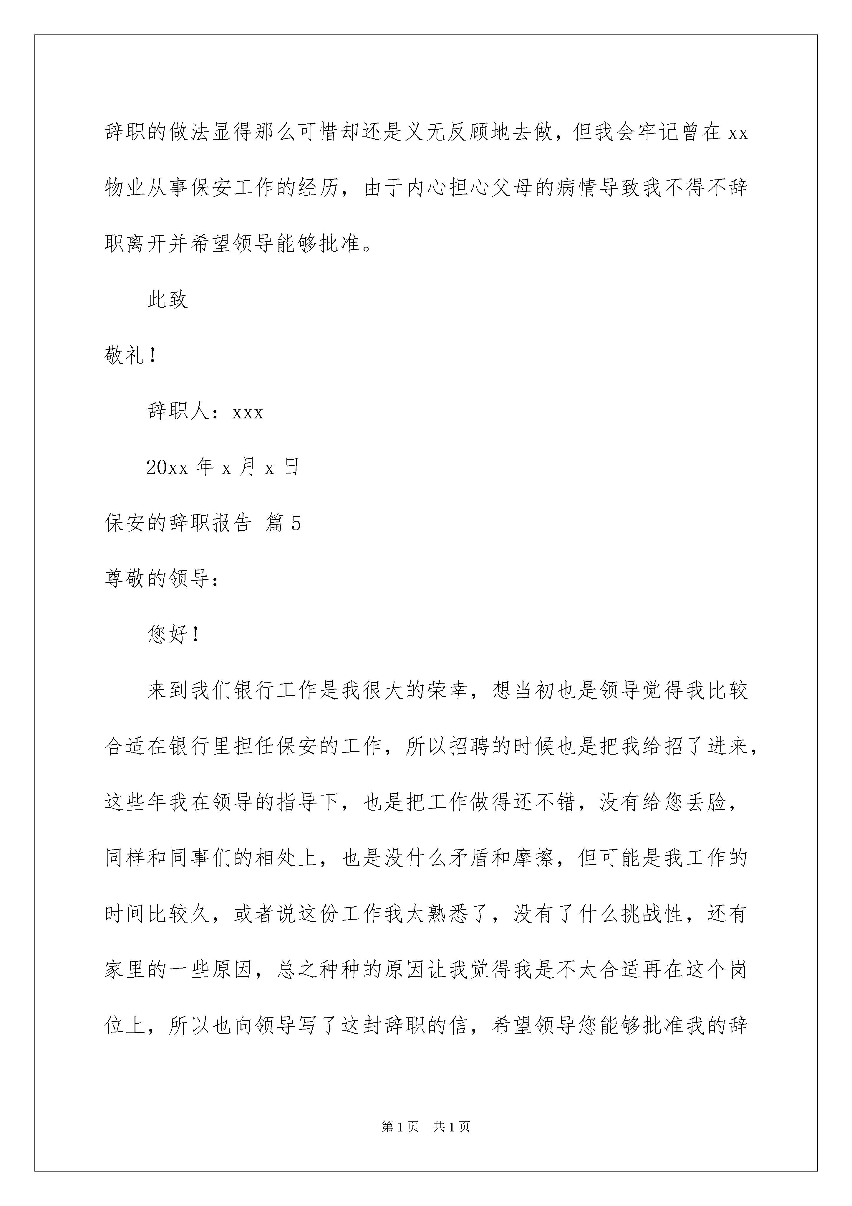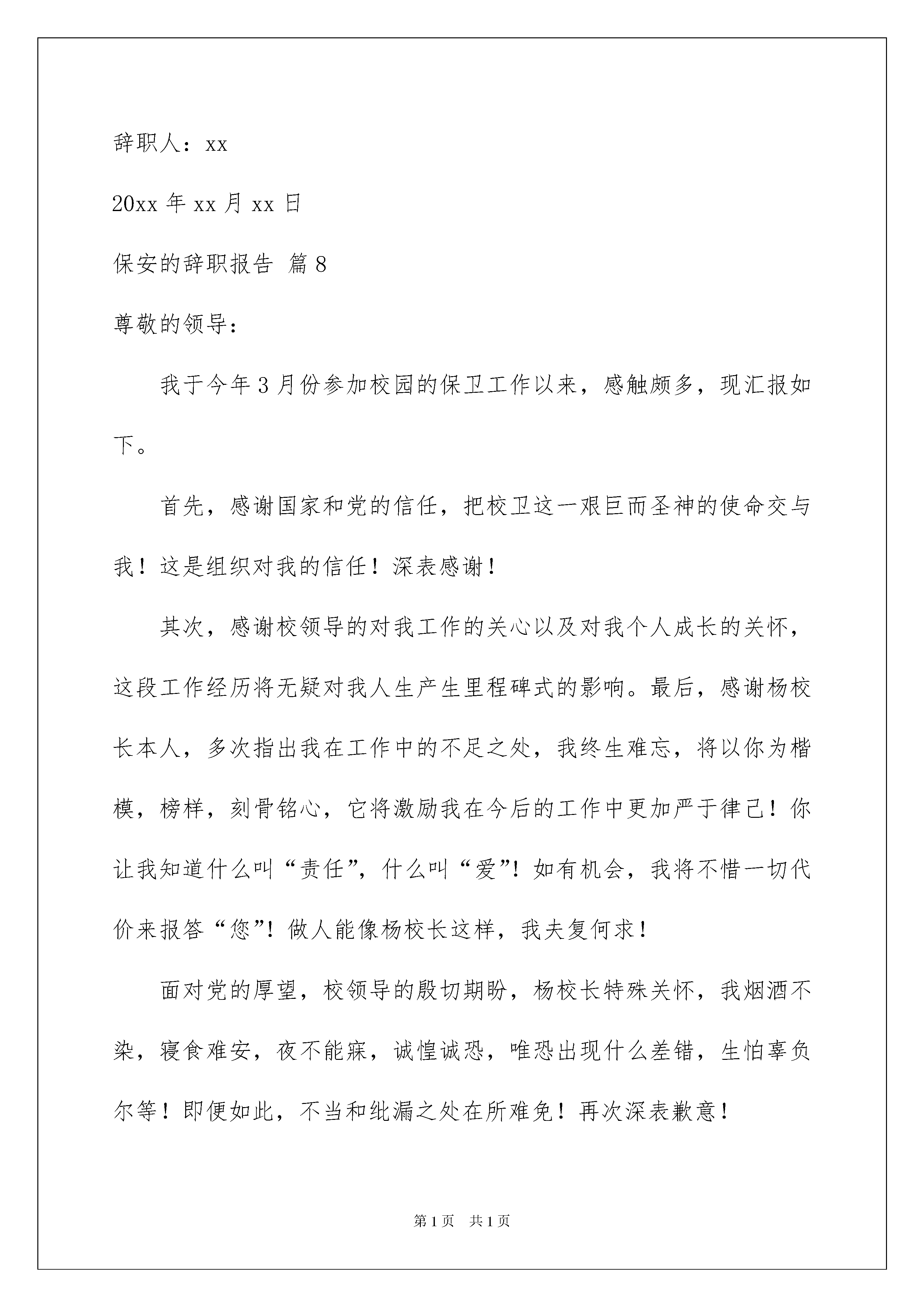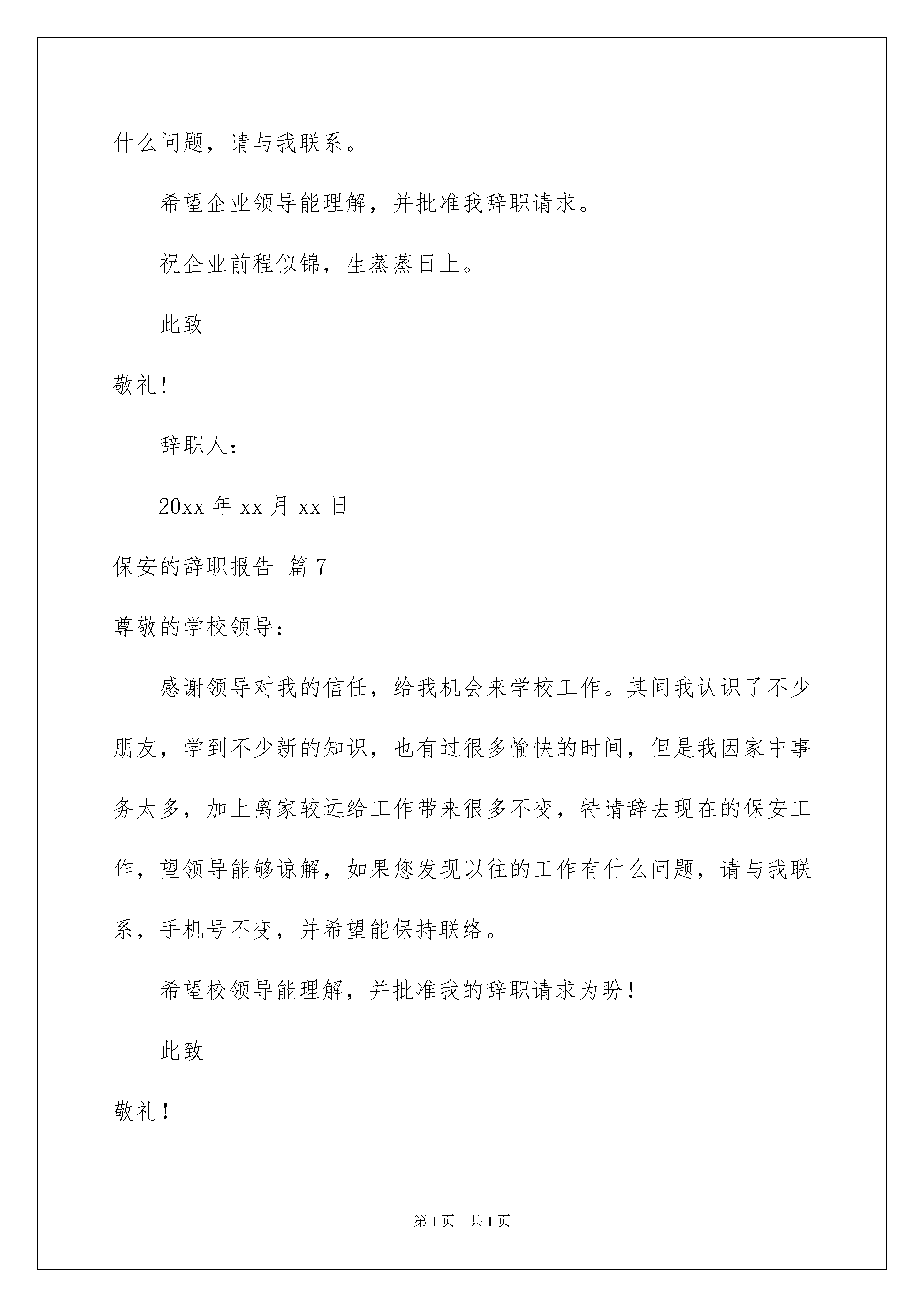 2022保安的辞职报告模板锦集8篇保安的辞职报告模板锦集8篇在当下社会,我们都不可避免地要接触到报告,我们在写报告的时候要注意逻辑的合理性。写起报告来就毫无头绪?下面是我整理的保安的辞职报告8篇,希望能够帮助到大家。保安的辞职报告篇1尊敬的公司领导:感谢领导对我的信任,给我机会来公司工作,保安辞职报告范文。其间我认识了不少朋友,学到不少新的知识,也有