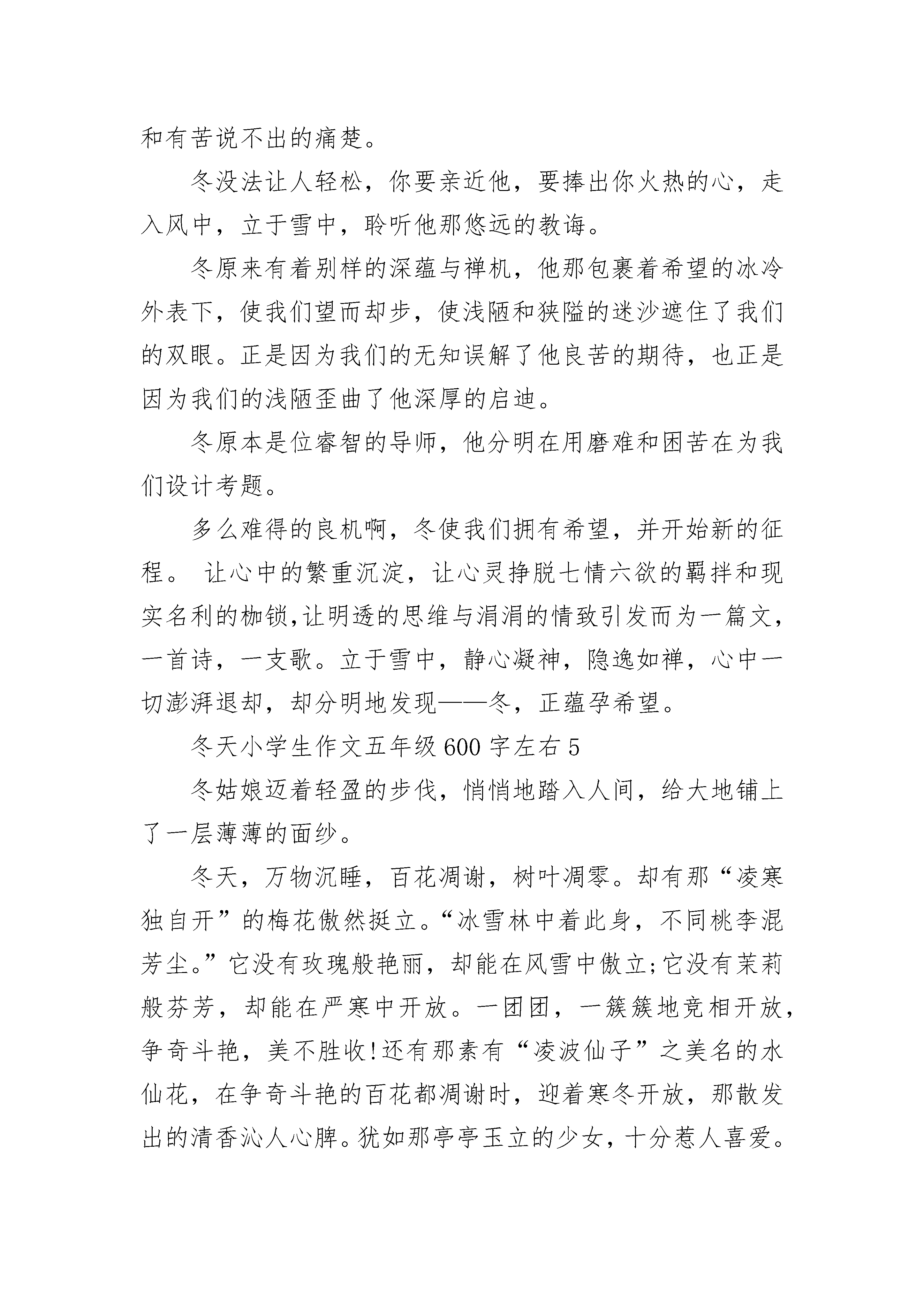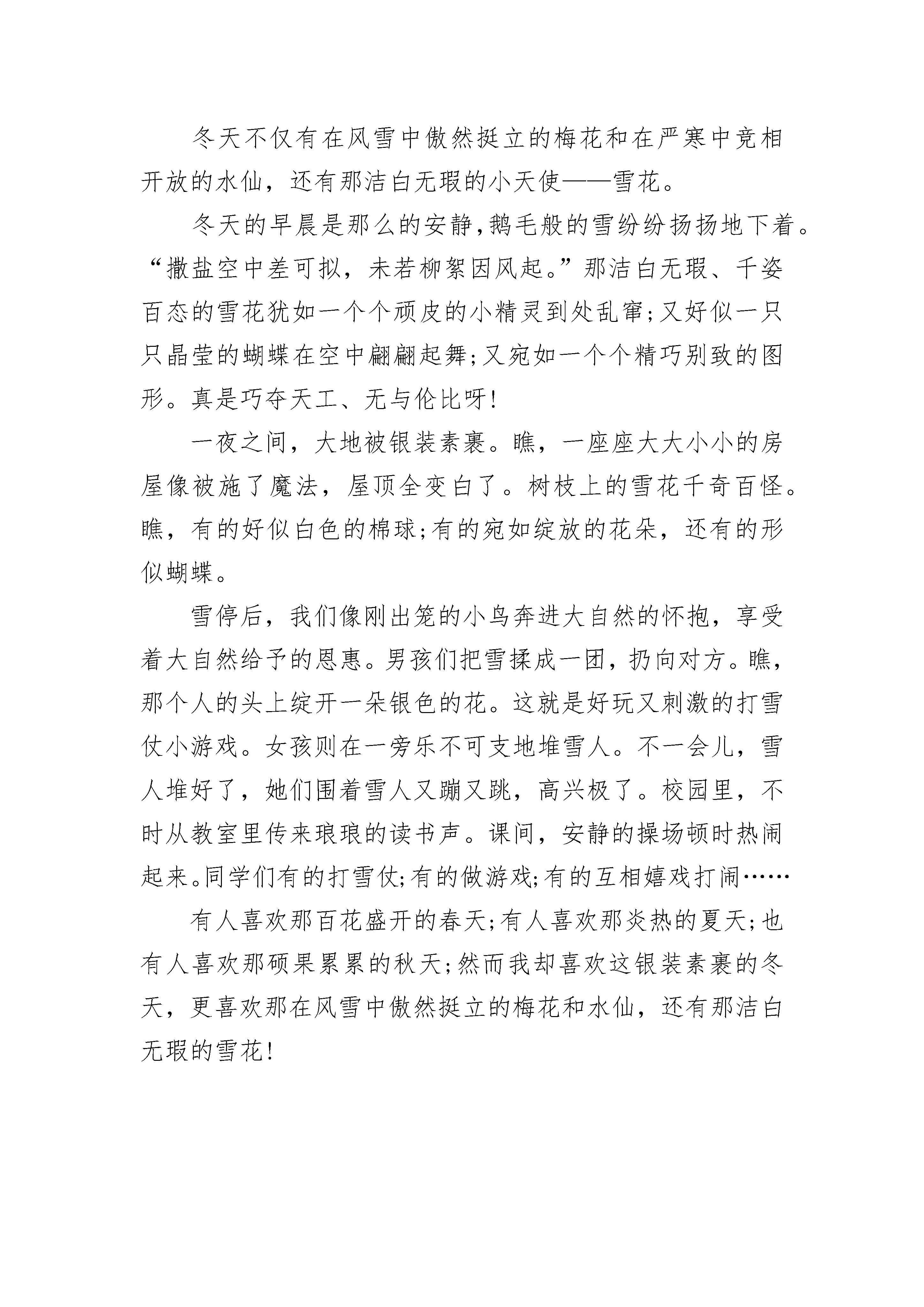小学生五年级作文冬天的600字大全一片片洁白的雪花带着对天空的眷恋,对大地母亲的向往,轻轻地飘落。它像一只只远方飞来的轻盈的白蝴蝶,翩翩起舞,嬉笑着,逗闹着,调皮地用身子相互碰撞着,仿佛捎来远方的好消息,着急地叩开我们的窗门。雪花飘飘,轻轻落在枝桠上,亲密地挨着它,用身体为它抵挡北风的侵袭。树干上像开满了一朵朵雪白的梨花,四季常青的松柏,也满身簇拥着松蓬蓬的雪团,玉树琼枝亭亭而立,真是“忽如一夜春风来,千树万树梨花开。”好一个粉雕玉砌的世界,一幢幢房屋像一个个的冰箱,屋檐下挂满了冰凌,千姿百态,在阳光的照