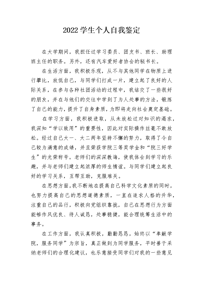 2022学生个人自我鉴定在大学期间,我担任过学习委员、团支书、班长、助理班主任的职务。另外,还有汽车爱好者协会的秘书长。在生活方面,我积极乐观,从不与其他同学在物质上进行攀比,放低自己,与同学们打成一片,建立起了良好的人际关系,在参与各种社团活动的过程中,我结交了一些很好的朋友,并在与他们的交往中学到了为人处事的方法,锻炼了自己的能力,提升了自身素质,为即将走向社会奠定基础。在学习方面,我积极进取,从未放松过对知识的渴求,我深知“学以致用”的重要性,因此对实际操作丝毫不敢放松。经过自己大一、大二两年坚持不