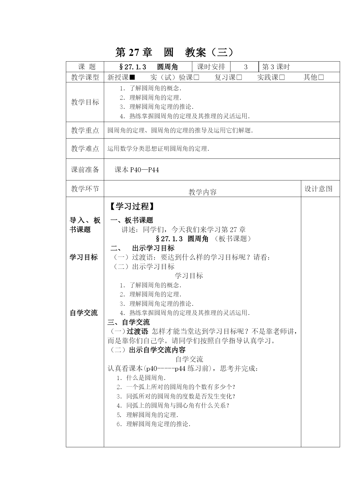 第27章圆教案(三)课题§27.1.3圆周角课时安排3第3课时教学课型新授课■实(试)验课□复习课□实践课□其他□教学目标1.了解圆周角的概念.2.理解圆周角的定理.3.理解圆周角定理的推论.4.熟练掌握圆周角的定理及其推理的灵活运用.教学重点圆周角的定理、圆周角的定理的推导及运用它们解题.教学难点运用数学分类思想证明圆周角的定理.课前准备课本P40—P44教学环节教学内容设计意图导入、板书课题学习目标自学交流【学习过程】一、板书课题讲述:同学们,今天我们来学习第27章§27.1.3圆周角(板书课题)出示