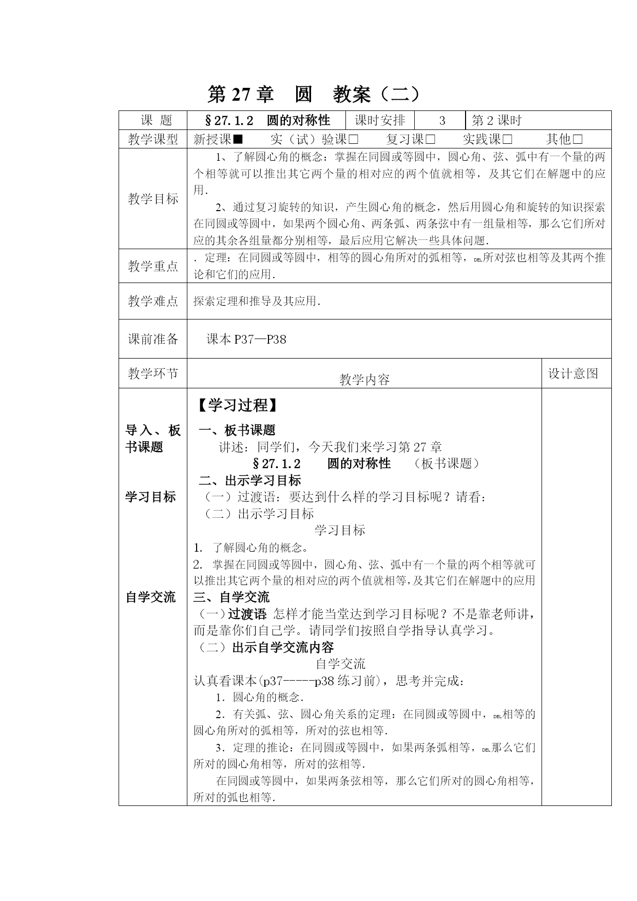 第27章圆教案(二)课题§27.1.2圆的对称性课时安排3第2课时教学课型新授课■实(试)验课□复习课□实践课□其他□教学目标1、了解圆心角的概念:掌握在同圆或等圆中,圆心角、弦、弧中有一个量的两个相等就可以推出其它两个量的相对应的两个值就相等,及其它们在解题中的应用.2、通过复习旋转的知识,产生圆心角的概念,然后用圆心角和旋转的知识探索在同圆或等圆中,如果两个圆心角、两条弧、两条弦中有一组量相等,那么它们所对应的其余各组量都分别相等,最后应用它解决一些具体问题.教学重点.定理:在同圆或等圆中,相等的圆心