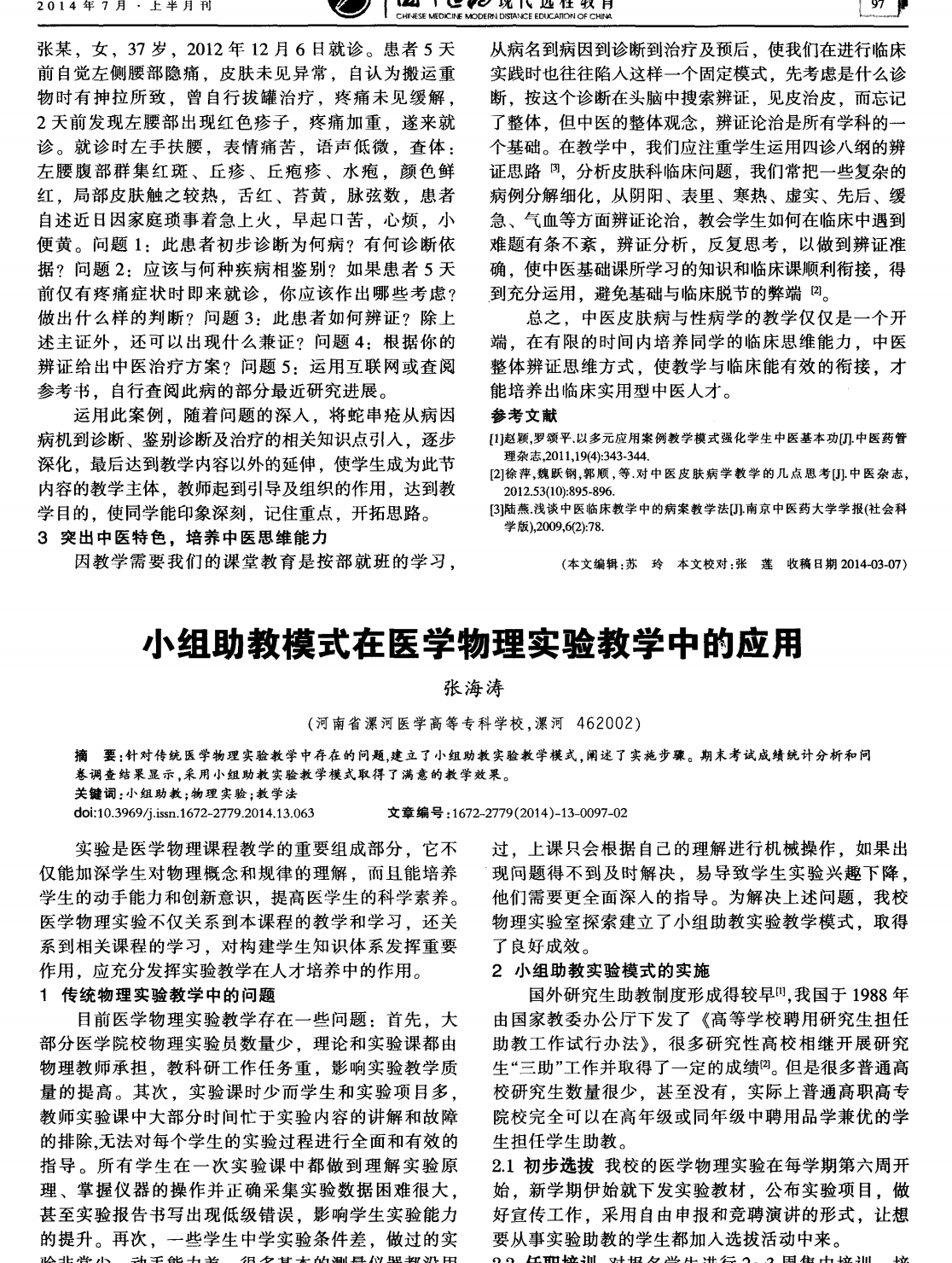 JiTT模式在医学化学实验教学中的应用初探的论文关于JiTT模式在医学化学实验教学中的应用初探的论文文章介绍了JiTT(适时教学)模式在我校不同专业的医学化学实验教学中的应用,并将网络环境下的学习任务和学生为主体的课堂教学有机结合,以设计性实验案例——“唾液淀粉酶最适pH值的测定”实验目的、原理、方法、步骤、实验中可能出现的问题及注意事项等诠释该教学模式,有助于增强学生学习主动性和培养学生创新与探究的能力。医学化学实验课程是我校开设的一门重要专业基础课程,是学生完善知识结构、提高创新思维和培养独立思考不可