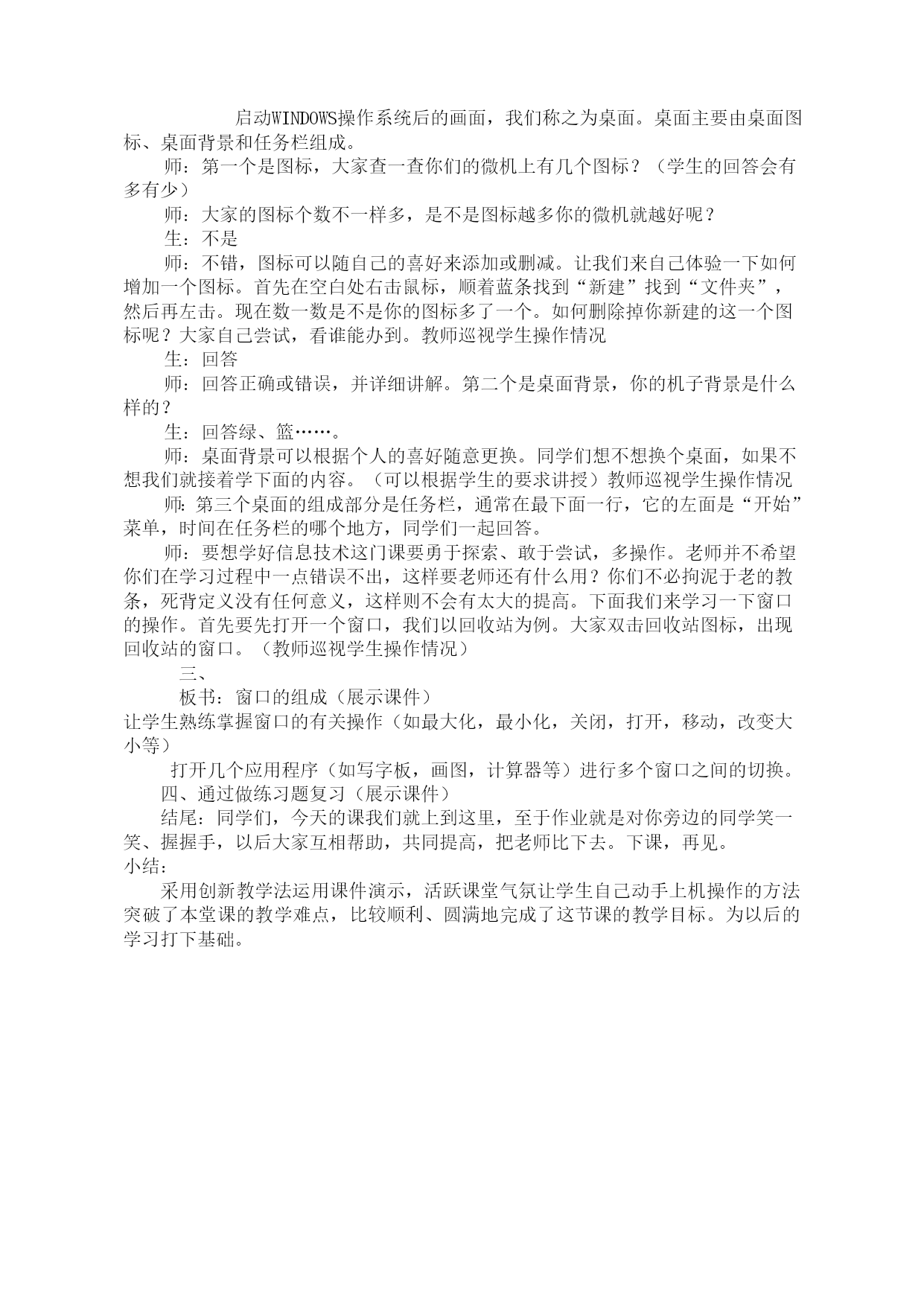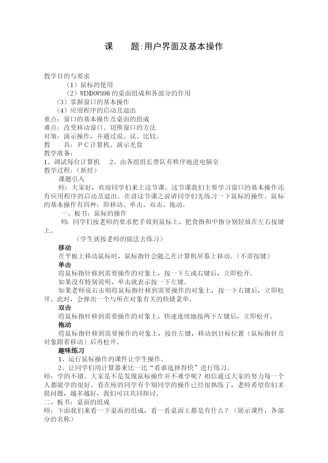 课题:用户界面及基本操作教学目的与要求(1)鼠标的使用(2)WINDOWS98的桌面组成和各部分的作用(3)掌握窗口的基本操作(4)应用程序的启动及退出重点:窗口的基本操作及桌面的组成难点:改变移动窗口、切换窗口的方法对策:演示操作,并通过说、议、比较。教具:PC计算机、演示光盘教学准备:1、调试每台计算机2、由各组组长带队有秩序地进电脑室教学过程:(新授)课题引入师:大家好,欢迎同学们来上这节课。这节课我们主要学习窗口的基本操作还有应用程序的启动及退出。在讲这节课之前请同学们先练习一下鼠标的操作。鼠标的