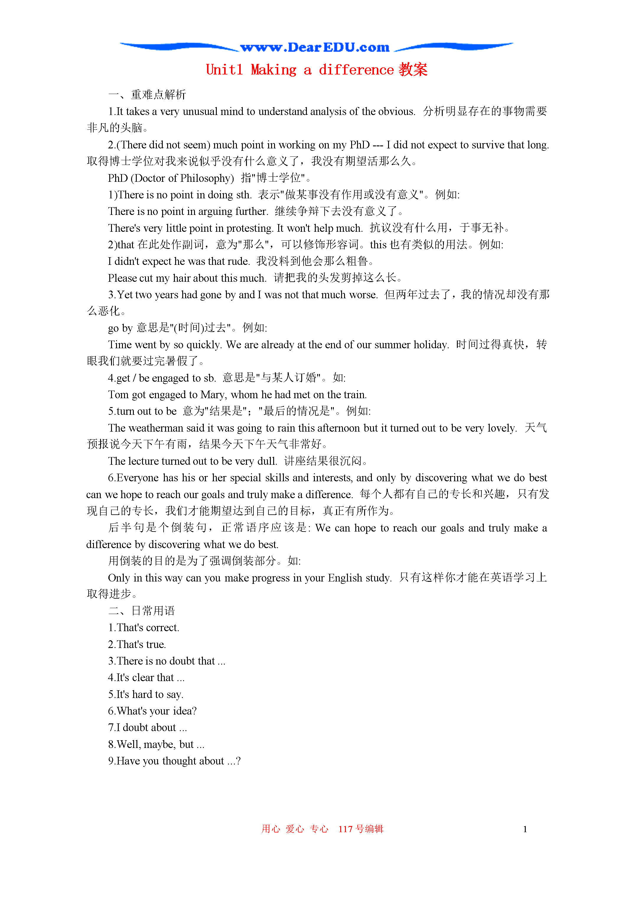 用心爱心专心117号编辑1Unit1Makingadifference教案一、重难点解析1.Ittakesaveryunusualmindtounderstandanalysisoftheobvious.分析明显存在的事物需要非凡的头脑。2.(Theredidnotseem)muchpointinworkingonmyPhD---Ididnotexpecttosurvive
