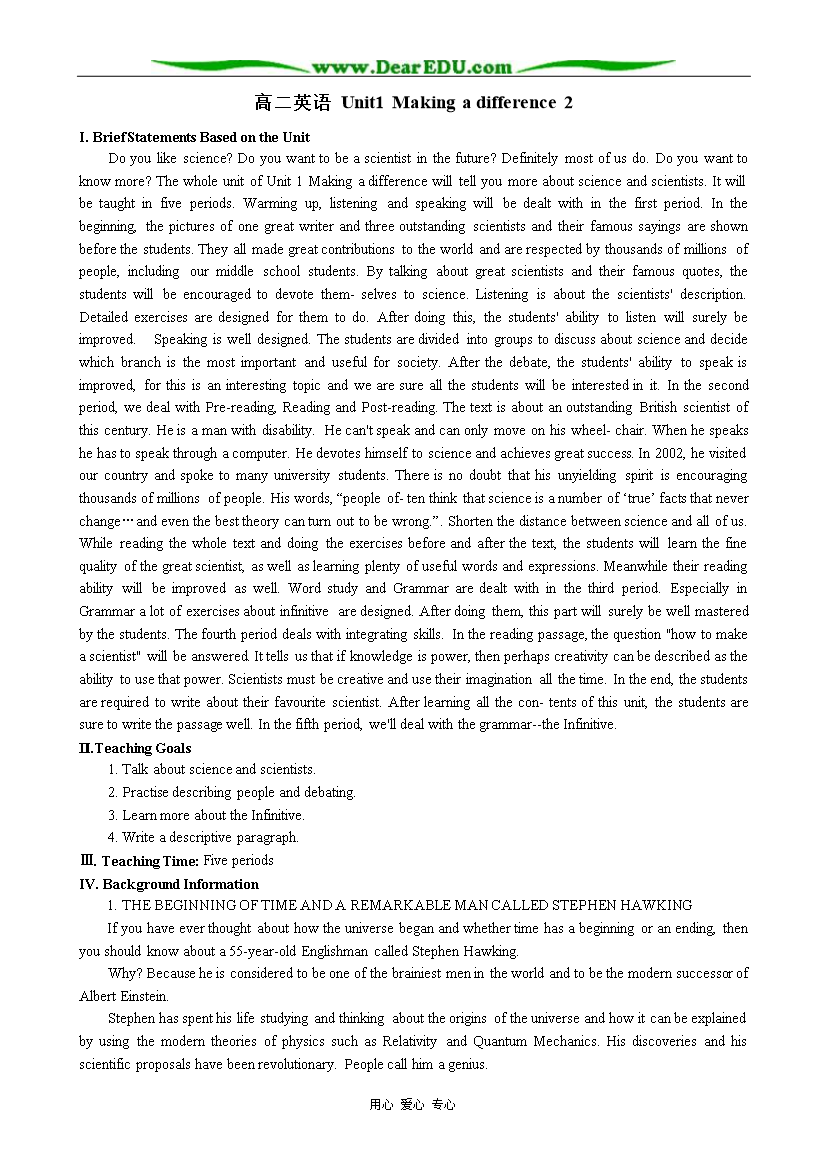 用心爱心专心高二英语Unit1Makingadifference2I.BriefStatementsBasedontheUnitDoyoulikescience?Doyouwanttobeascientistinthefuture?Definitelymostofusdo.Doyouwanttoknowmore?ThewholeunitofUnit1Makingadifferencewilltellyoum