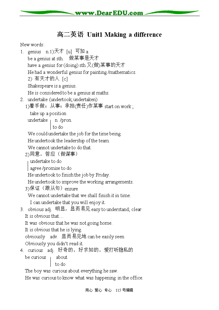 用心爱心专心115号编辑高二英语Unit1MakingadifferenceNewwords:geniusn.1)天才[u]可加abeageniusatsth.做某事是天才haveageniusfor(doing)sth.又(做)某事的天才Hehadawonderfulgeniusforpainting./mathematics.2)有天才的人[c]Shakespeareisagenius.Heisconsideredtobeageniusatmaths.undertake(undertook,under