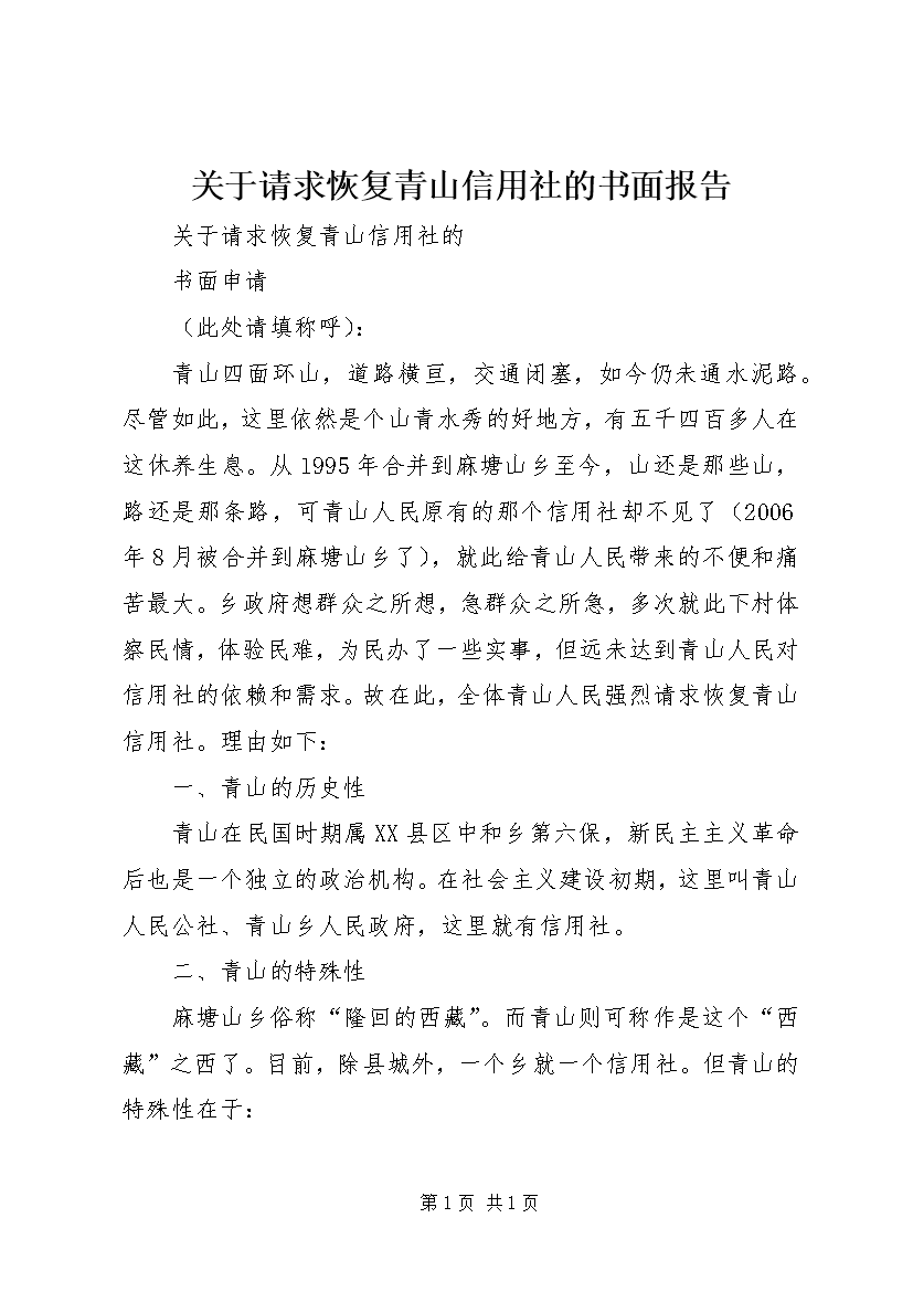 关于请求恢复青山信用社的书面报告关于请求恢复青山信用社的书面申请(此处请填称呼):青山四面环山,道路横亘,交通闭塞,如今仍未通水泥路。尽管如此,这里依然是个山青水秀的好地方,有五千四百多人在这休养生息。从1995年合并到麻塘山乡至今,山还是那些山,路还是那条路,可青山人民原有的那个信用社却不见了(2006年8月被合并到麻塘山乡了),就此给青山人民带来的不便和痛苦最大。乡政府想群众之所想,急群众之所急,多次就此下村体察民情,体验民难,为民办了一些实事,但远未达到青山人民对信用社的依